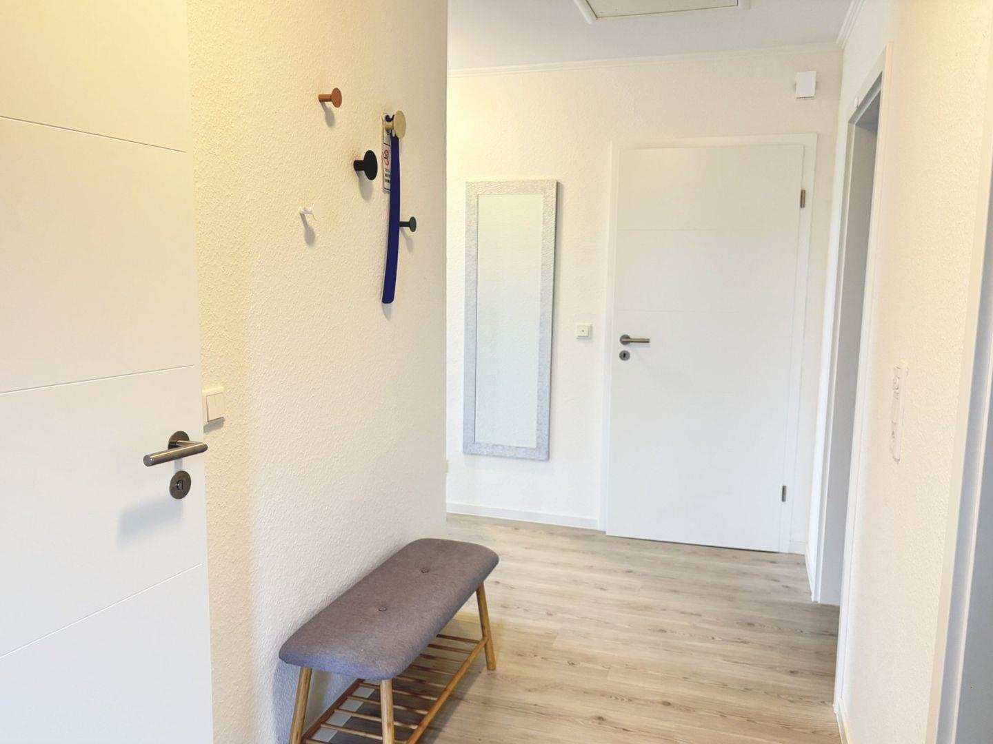 Der Zugang zur Wohnung erfolgt über eine separate Außentreppe mit stabilem Geländer, die Sie direkt zum eigenen Eingang führt. Im Inneren empfängt Sie ein heller Flur mit Garderobe, von dem aus sich die Wohnung großzügig erschließt. Der kombinierte Wohn- und Essbereich ist offen gestaltet und lädt mit einer bequemen Sitzgruppe – bestehend aus einem Zweisitzer und zwei Sesseln – zum Entspannen ein. Für Unterhaltung sorgen SAT-TV, Radio und WLAN. Die moderne Einbauküche ist vollständig ausgestattet, inklusive Geschirrspüler, Cerankochfeld, Backofen, Kühlschrank mit Gefrierfach sowie Kaffeemaschine, Wasserkocher und Toaster – ideal für alle, die im Urlaub gern selbst kochen.