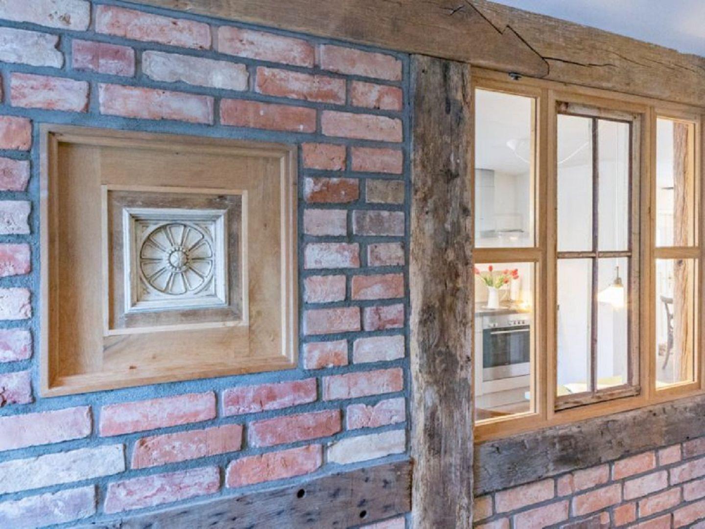 Ein großzügiger Eingangsbereich empfängt Dich mit einem einladenden Blick in die offene Küche, eingerahmt von gemütlichem Fachwerk, die direkt ins Wohnzimmer übergeht. Die Kombination aus warmem Holz, sichtbaren Fachwerkbalken und hellen, freundlichen Oberflächen verleiht dem Wohnraum eine gemütliche, stilvoll-rustikale Note. Im unteren Bereich findest Du ein modernes Bad sowie ein separates WC; ebenfalls findest Du einen gut durchdachten Hauswirtschaftsraum mit Waschmaschine und Trockner vor – praktisch und jederzeit griffbereit.