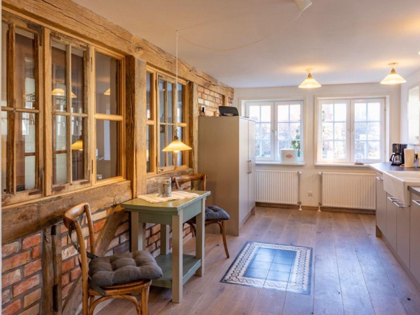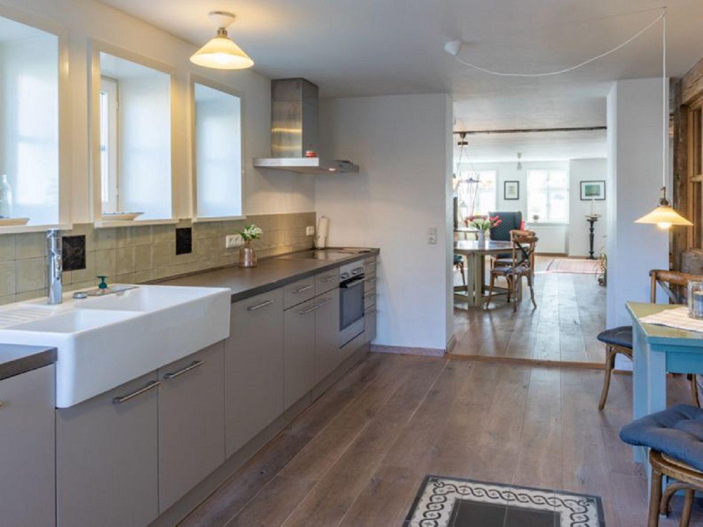 Die voll ausgestattete Küche lässt keine Wünsche offen: Hochwertige Geräte, ausreichende Arbeitsflächen und ausreichend Stauraum ermöglichen Dir ein entspanntes Kochen während Deines Aufenthalts. Der offene Küchenbereich lädt dazu ein, gemeinsame Mahlzeiten zu genießen oder bei einem Gläschen Wein den Blick ins Wohnzimmer schweifen zu lassen.