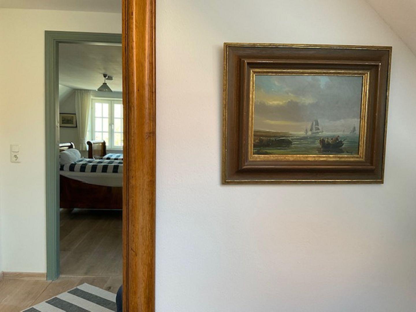 Im oberen Stockwerk befinden sich zwei behagliche Schlafzimmer. Das Hauptschlafzimmer verfügt über ein komfortables Doppelbett (1,60 x 2,00 m) und bietet eine ruhige Oase zum Entspannen. Das zweite Schlafzimmer ist mit zwei Einzelbetten (0,90 x 1,90 m) eingerichtet. Beide Räume sind rustikal und geschmackvoll eingerichtet, mit warmen Materialien, harmonischen Farbtönen und liebevollen Details, die eine urig-gemütliche Atmosphäre schaffen.