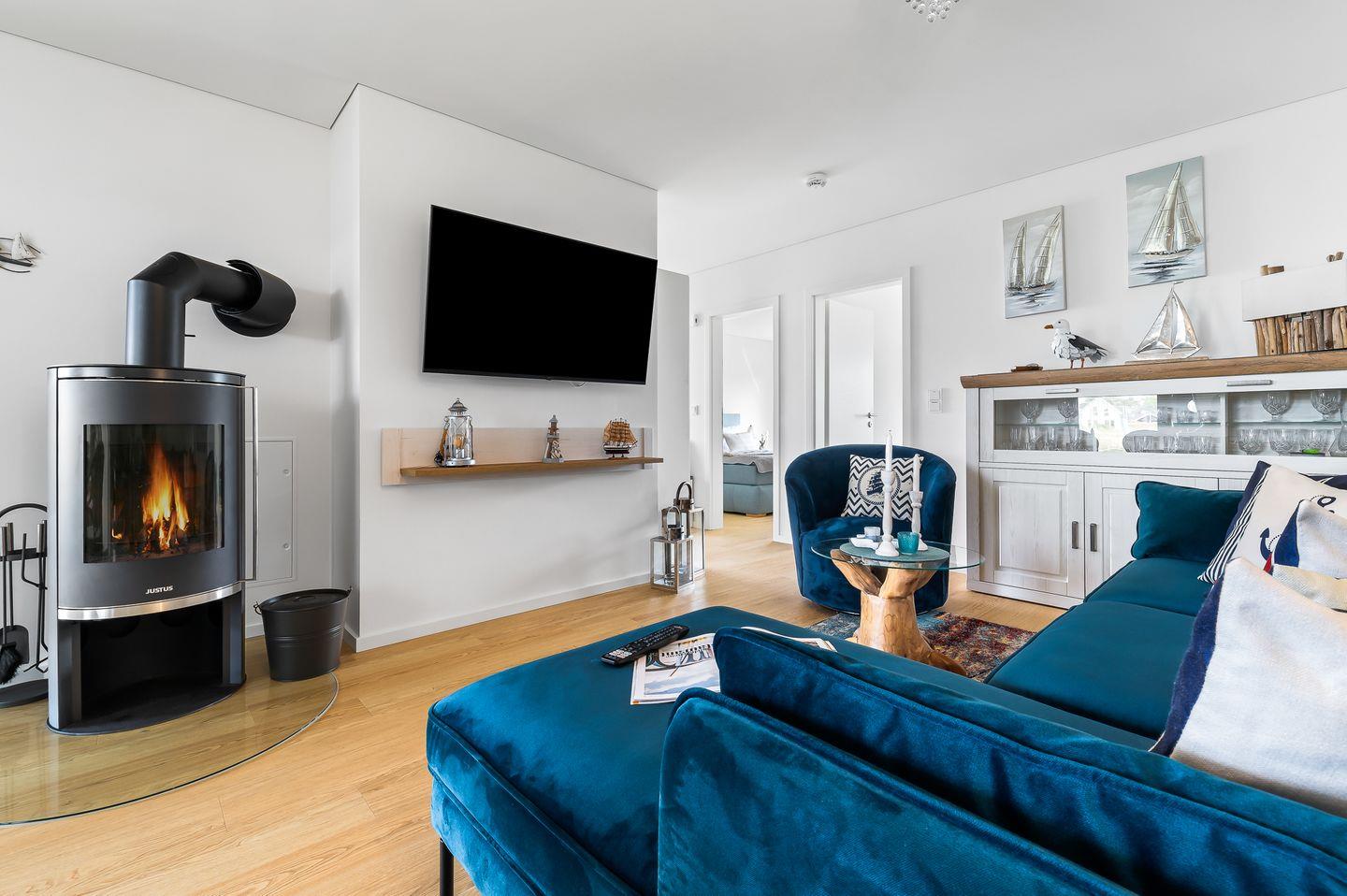 Im gemütlichen und liebevoll eingerichteten Wohnzimmer laden ein komfortables Sofa und ein Smart-TV zu entspannten Stunden ein. An kühleren Tagen sorgt der Kaminofen für eine besonders warme und behagliche Atmosphäre. Direkt angrenzend befindet sich die überdachte Terrasse – ausgestattet mit hochwertigen Gartenmöbeln, Strandkorb und Sonnenliegen. Ob Frühstück in der frischen Ostseeluft oder ein Glas Wein am Abend: Hier lässt sich jeder Moment genießen.