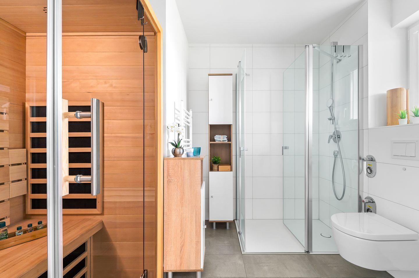Das elegante Badezimmer lädt zum Entspannen ein: Neben einer bodengleichen Dusche erwartet Sie eine private Infrarotkabine, die wohltuende Wellness-Momente wie im Spa ermöglicht.