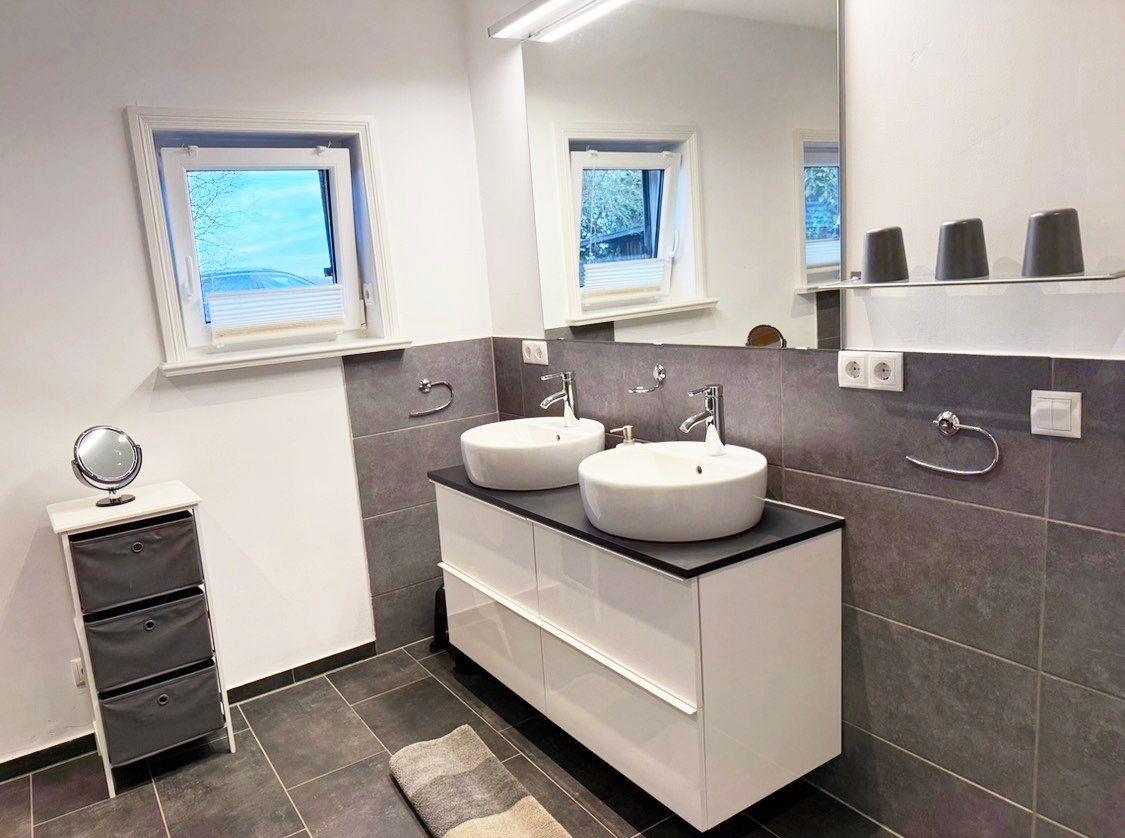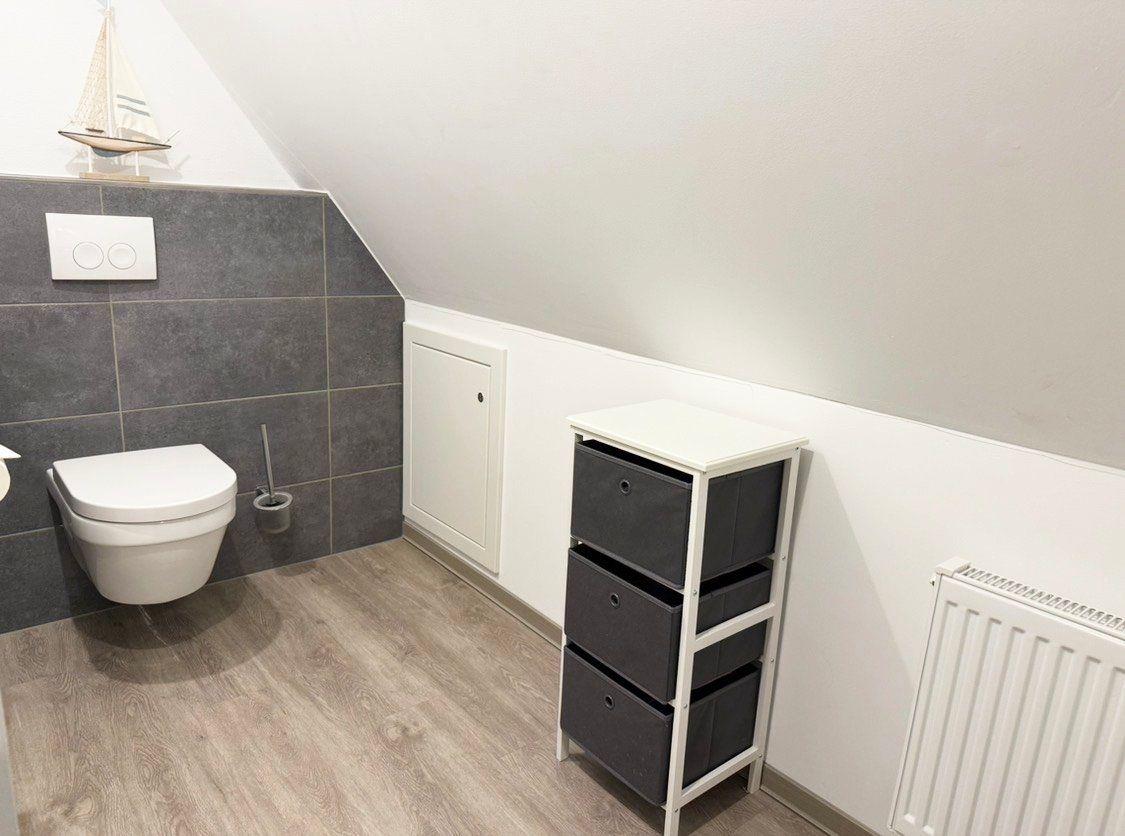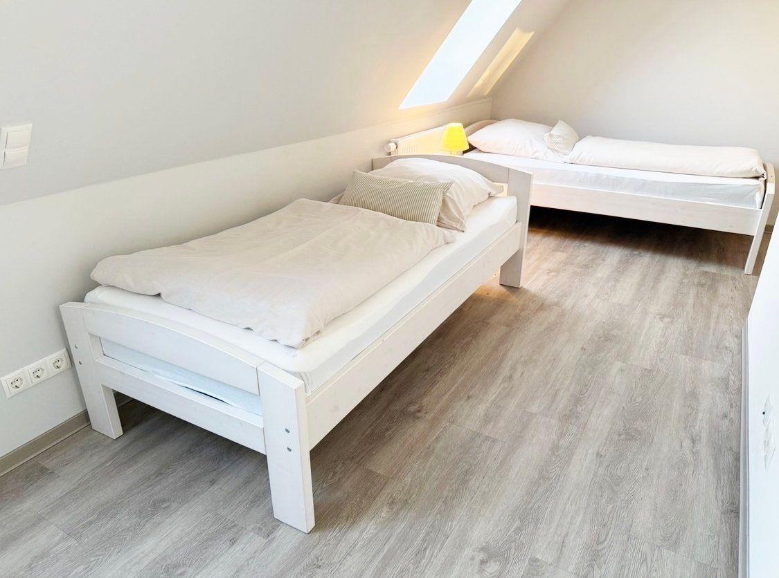 Für erholsame Nächte sorgen zwei Schlafzimmer im Obergeschoss: Das Hauptschlafzimmer ist mit einem komfortablen Doppelbett (180x200 cm, getrennte Matratzen) und eigenem SAT-TV ausgestattet, während das zweite Schlafzimmer über zwei Einzelbetten verfügt. In beiden Räumen sorgen Verdunklungsmöglichkeiten und Fliegengitter für einen angenehmen Schlaf. Das Badezimmer bietet mit einer ebenerdigen Dusche und einer wohltuenden Fußbodenheizung ein echtes Plus an Komfort; ein zusätzliches Gäste-WC ergänzt die Ausstattung ideal.
