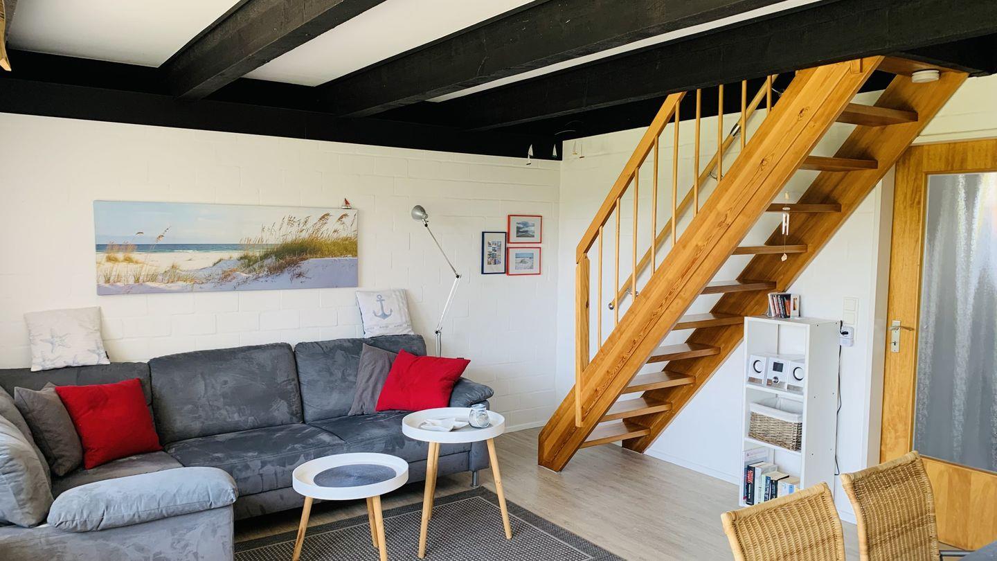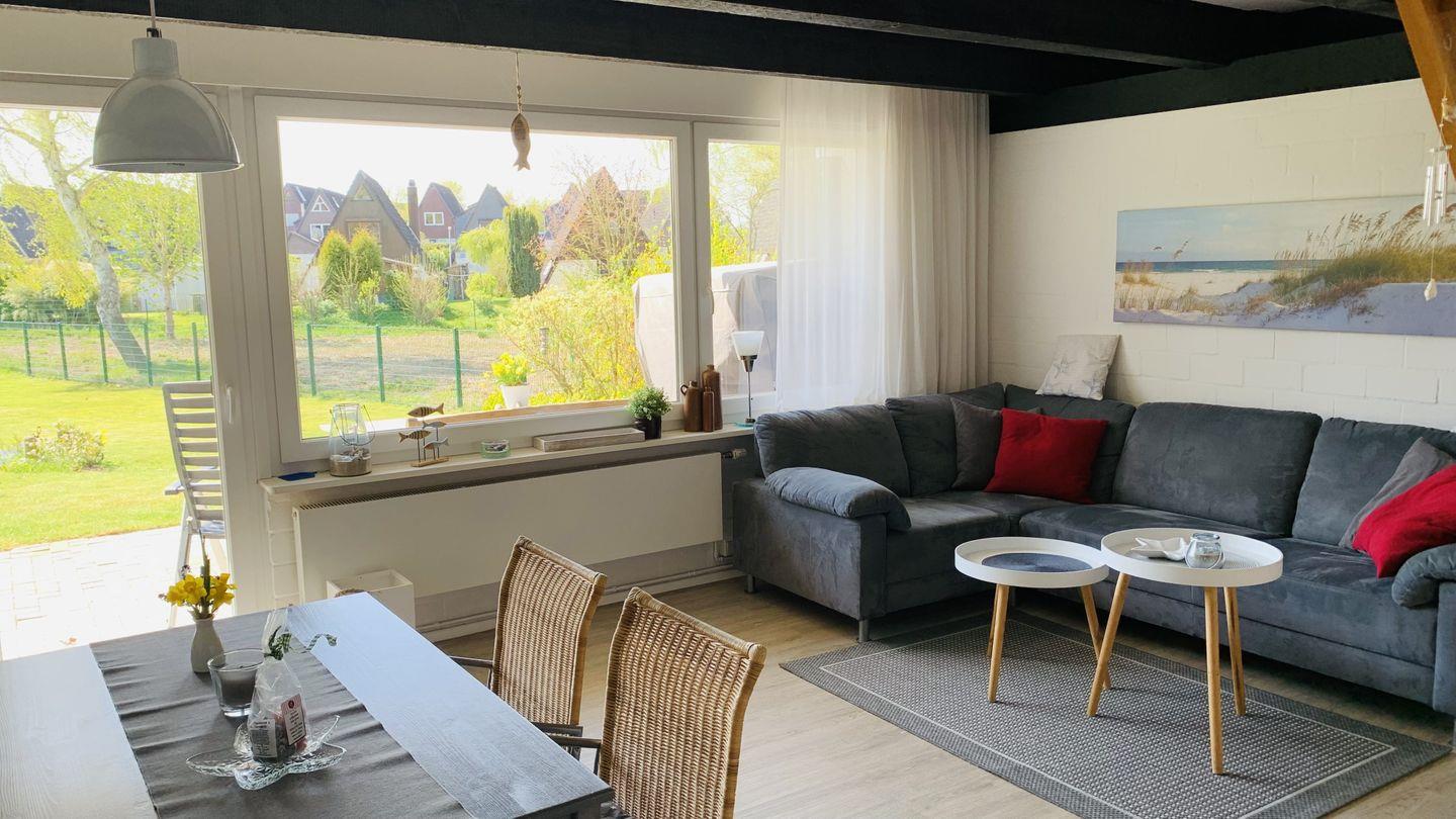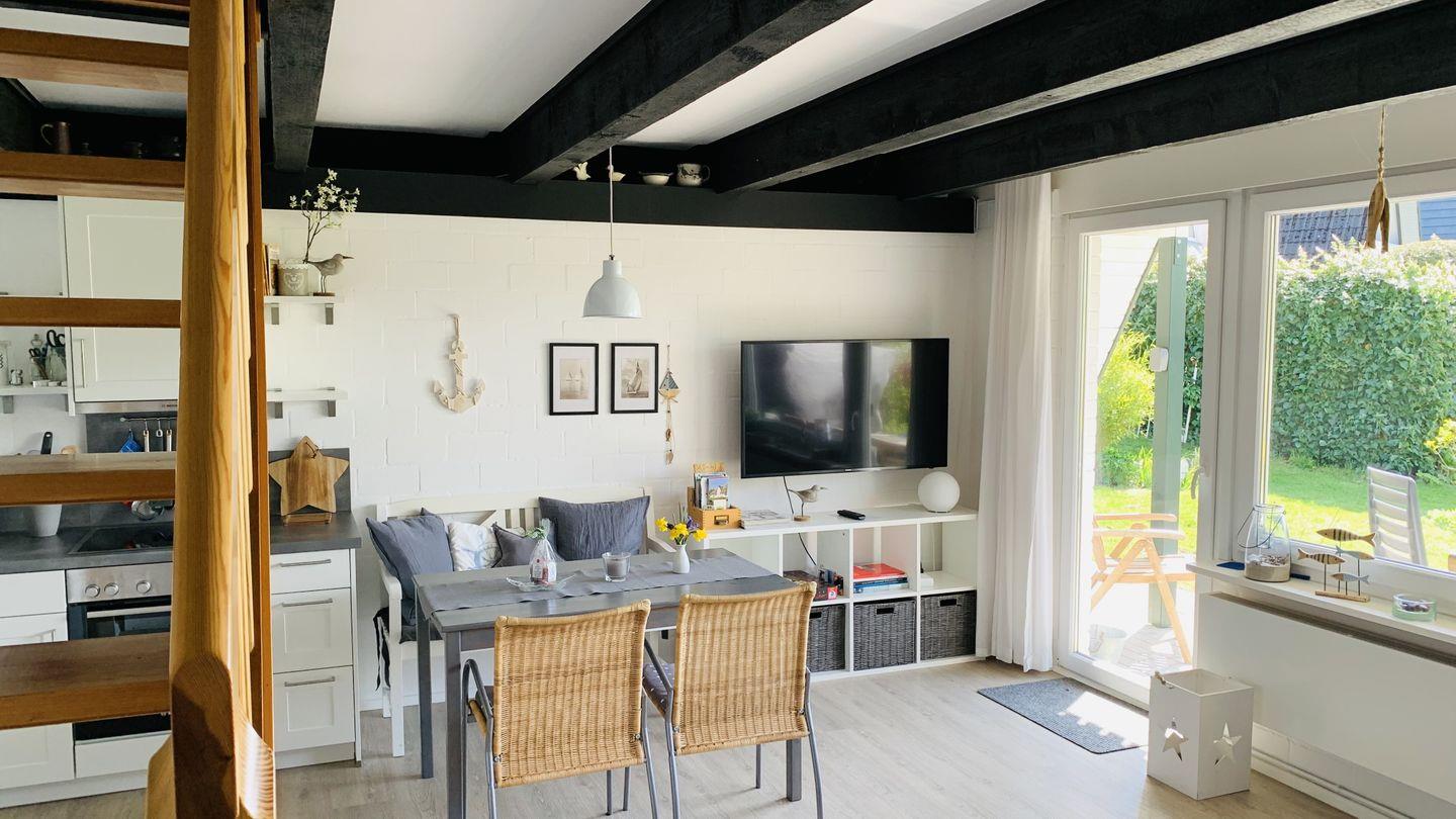 Das Wohnzimmer ist maritim gestaltet mit gemütlichem Ecksofa und einer Esstischgruppe im Strandhauslook. Die Balkendecke verleiht eine besondere Atmosphäre. Eine neue Landhausküche ergänzt den gemütlichen Wohnraum