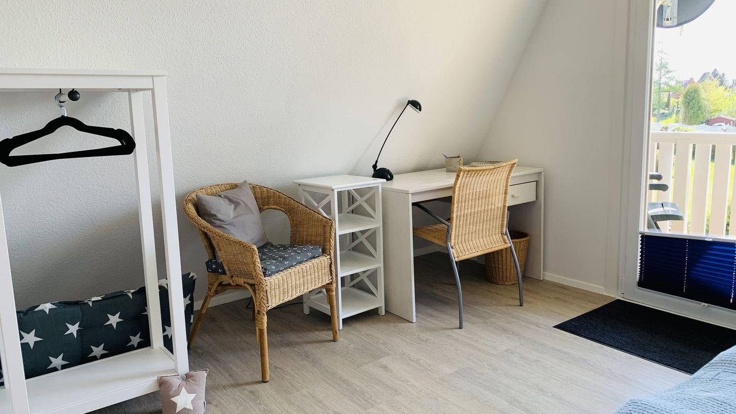 Das andere Schlafzimmer Richtung Süden ist mit einem Doppelbett, offenem Kleiderschrank und einem Schreibtisch ausgestattet. Von hier aus betritt man den großen Süd-Balkon (über der Terrasse).