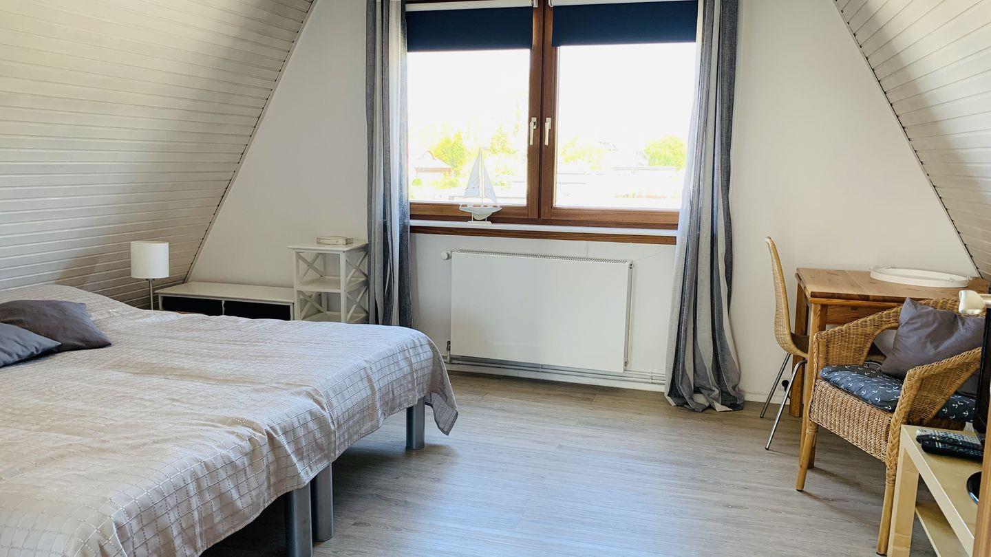 Das Schlafzimmer Richtung Norden bietet einen kleinen seitlichen Ausblick auf die Schlei. Es ist ausgestattet mit zwei Einzelbetten, ( können zusammen oder getrennt stehen)