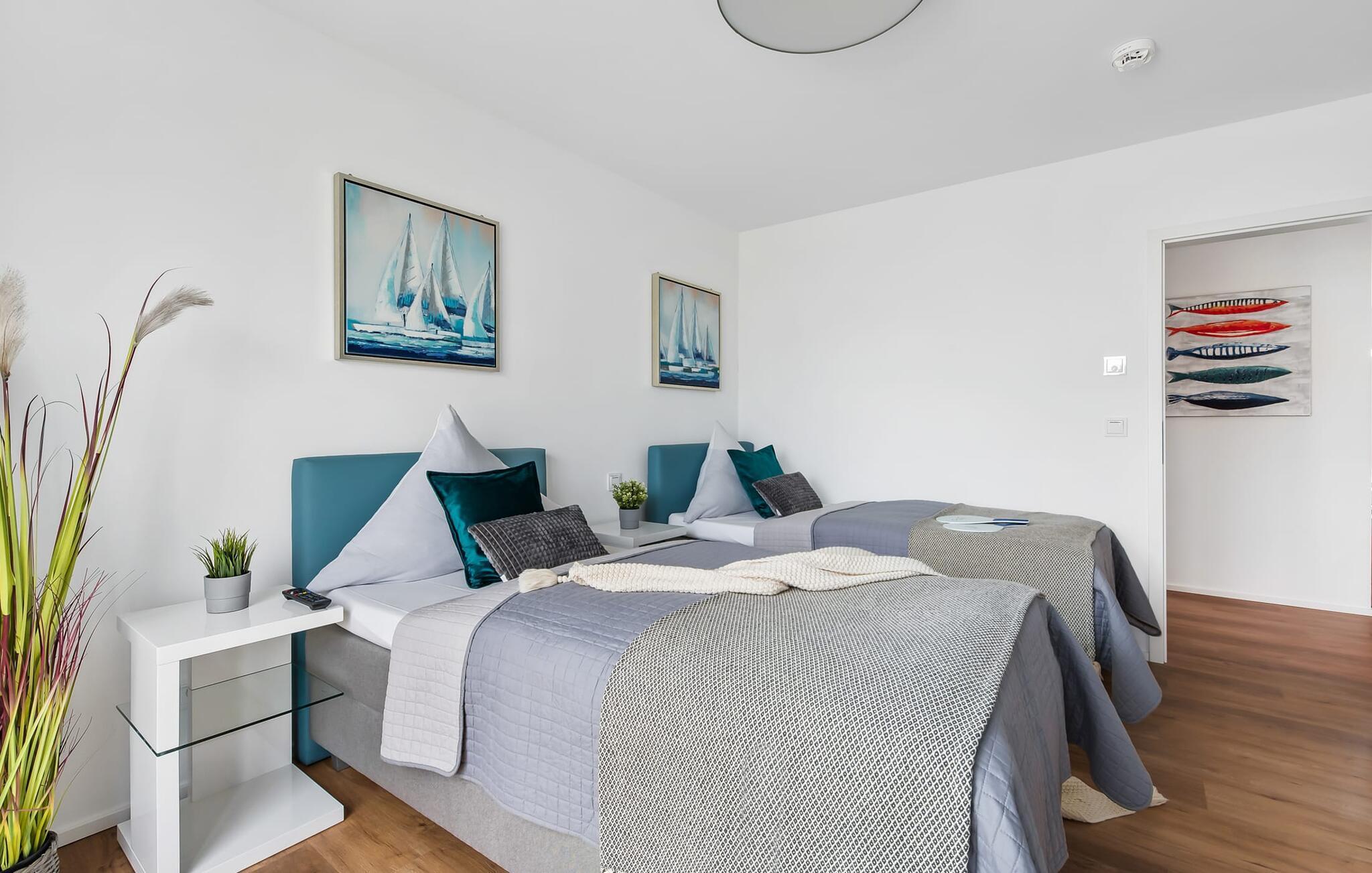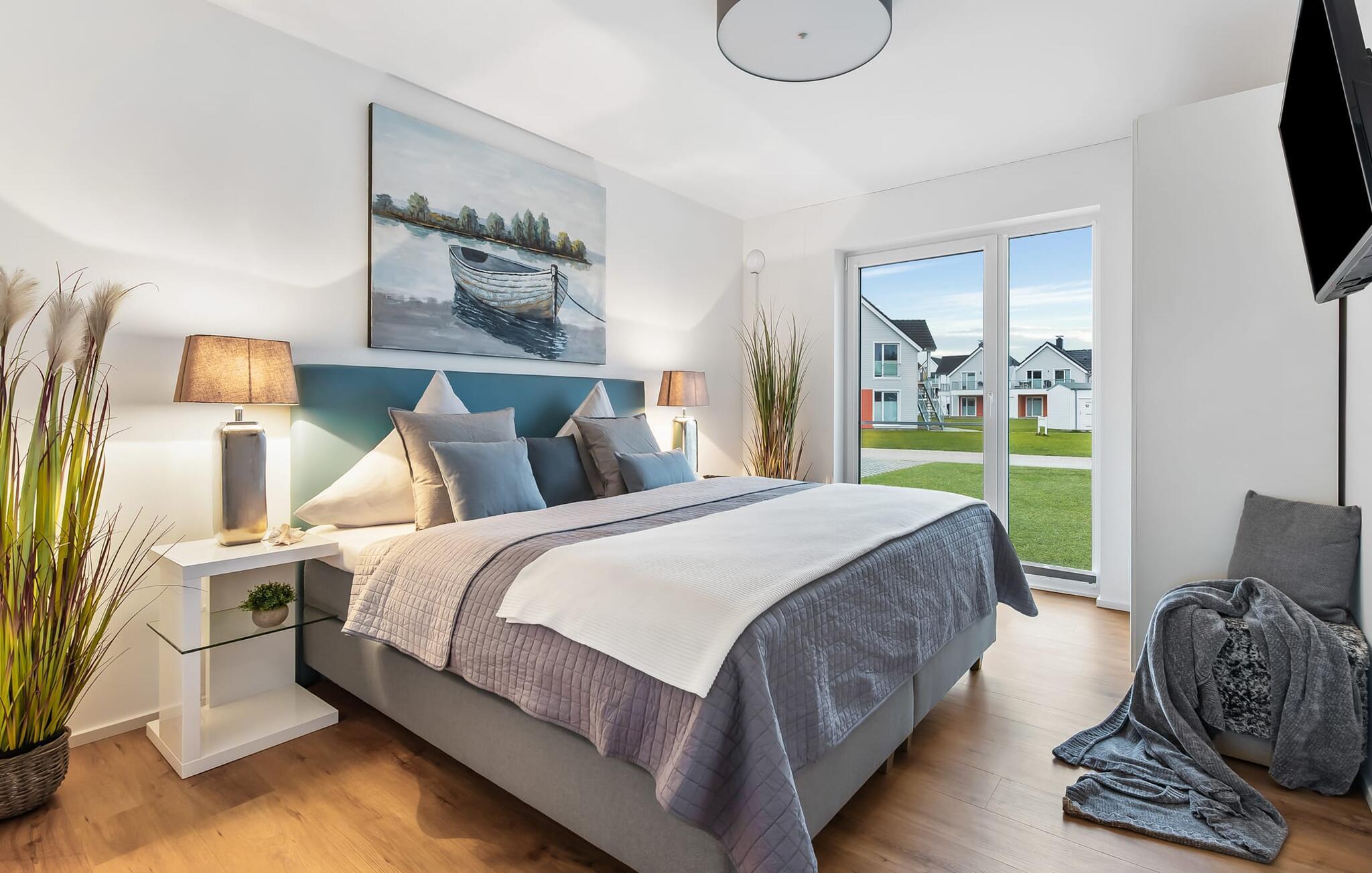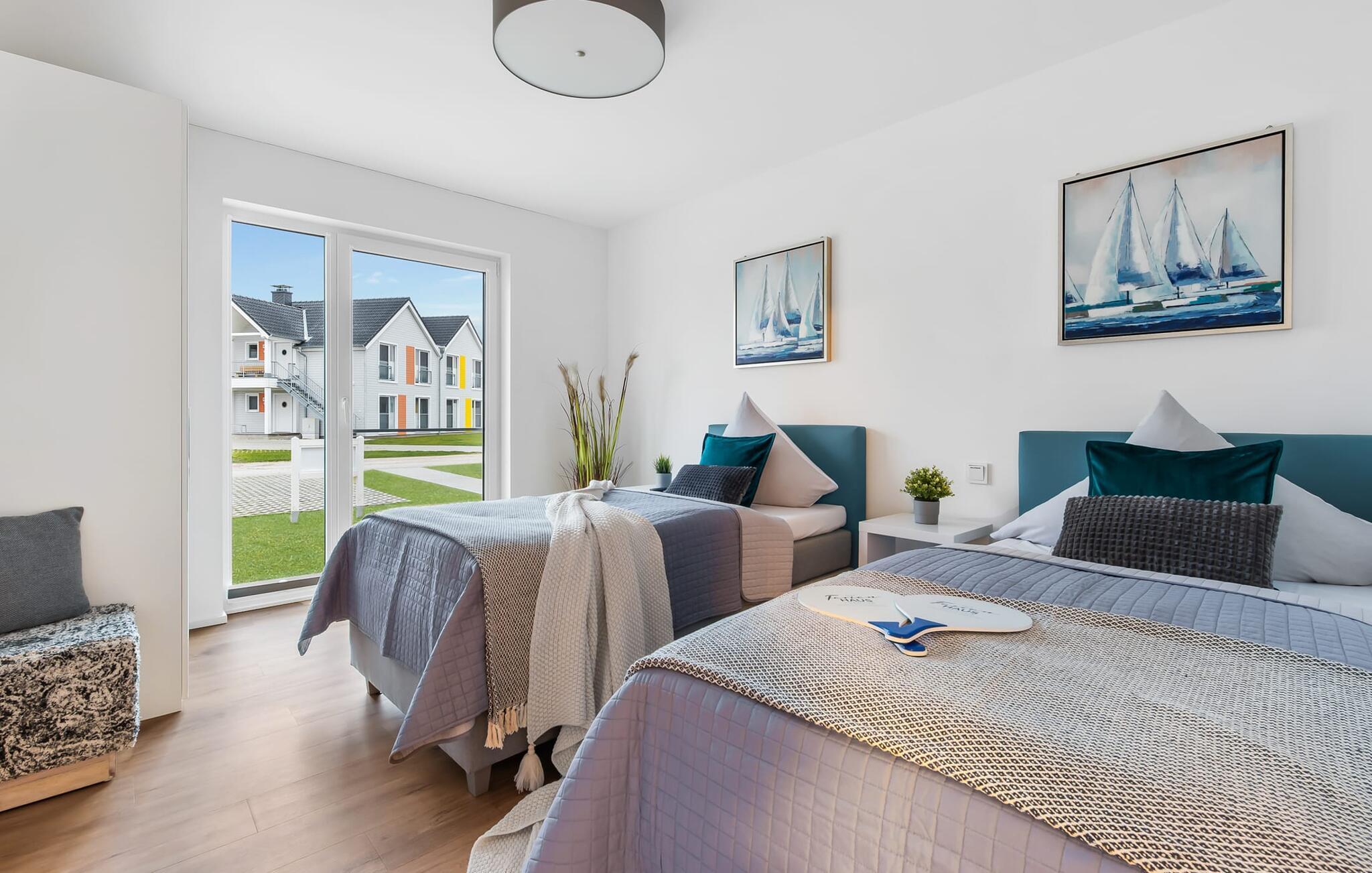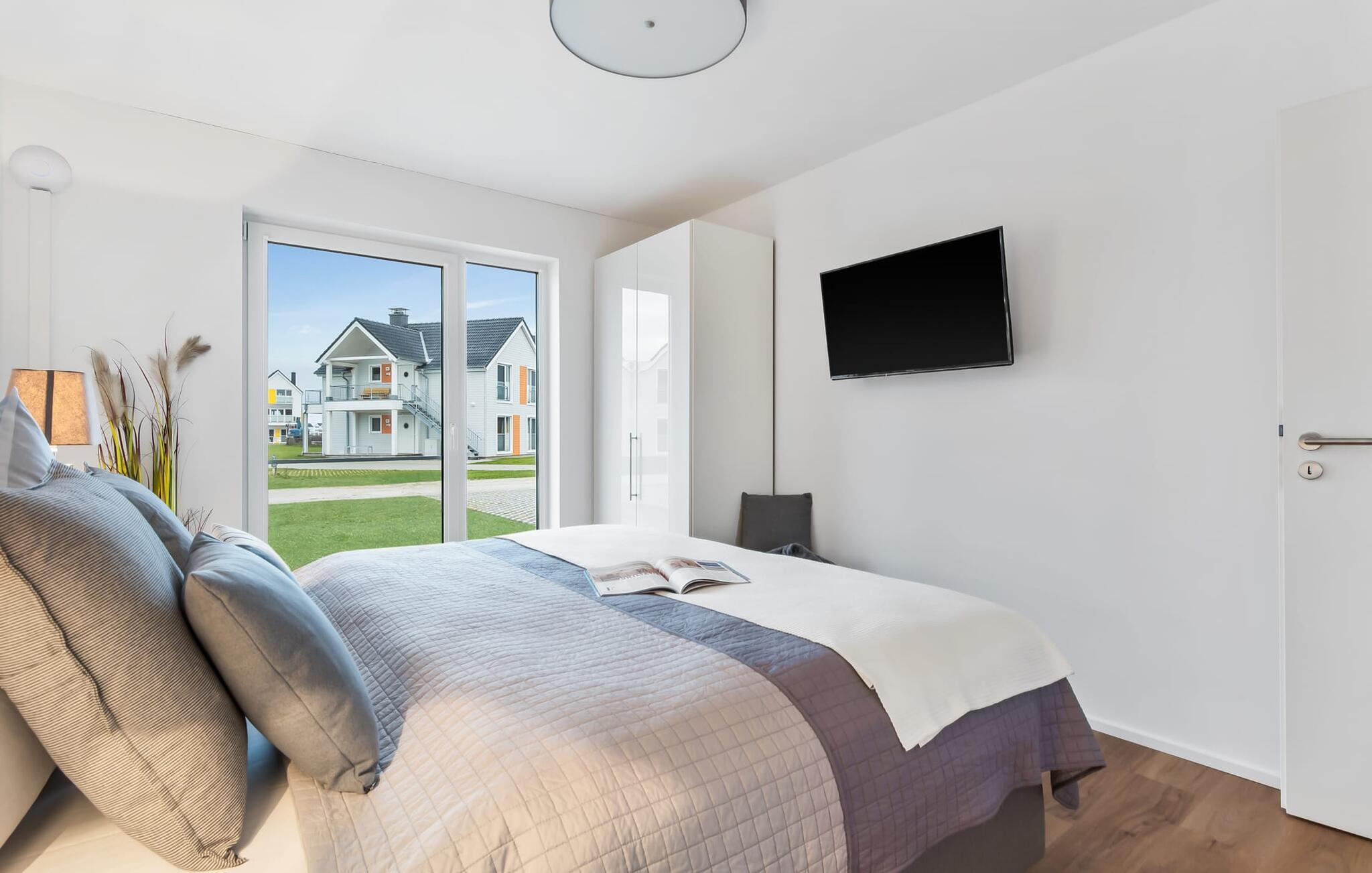 Dem Gast stehen zwei Schlafzimmer mit jeweils einem Fernseher zur Verfügung. Ihr könnt euch entscheiden zwischen einem komfortablen Doppelbett oder zwei bequemen Einzelbetten. Erholsamen Schlaf bieten beide Varianten. Auch hier dominieren die bodentiefen Fenster und verstärken die Großzügigkeit.