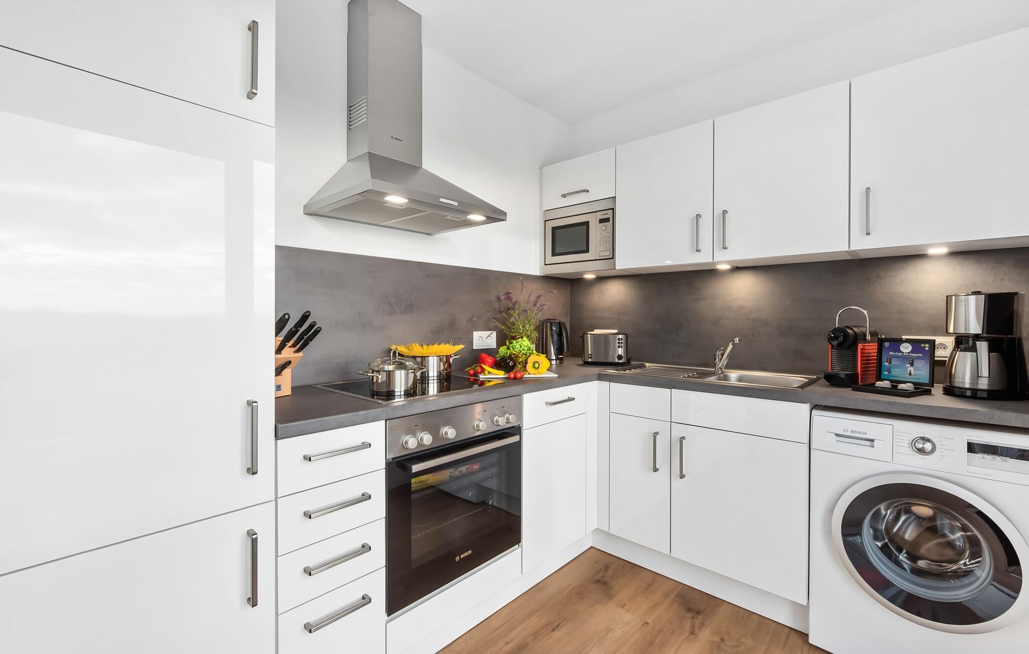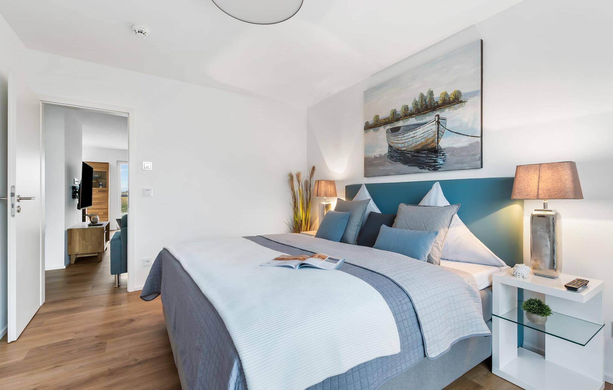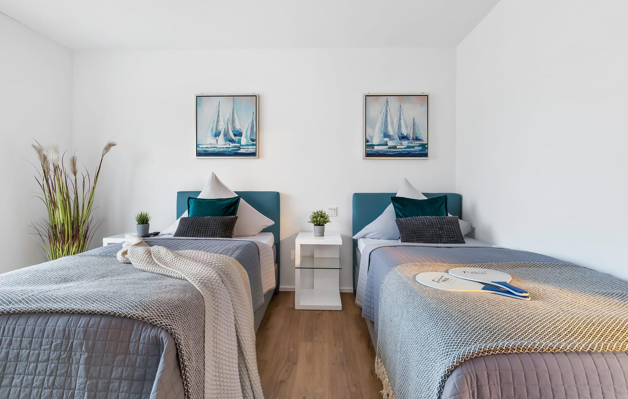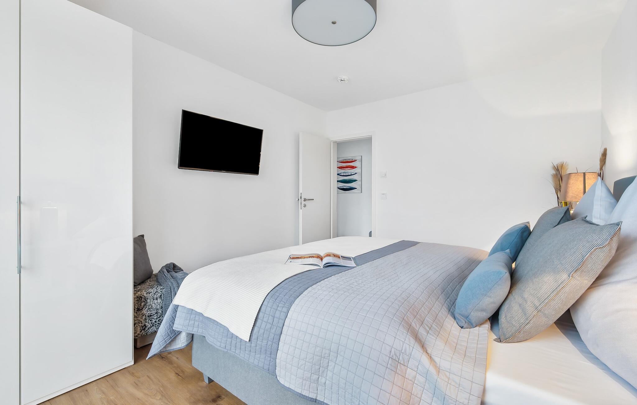 Dem Gast stehen zwei Schlafzimmer mit jeweils einem Fernseher zur Verfügung. Ihr könnt euch entscheiden zwischen einem komfortablen Doppelbett oder zwei bequemen Einzelbetten. Erholsamen Schlaf bieten beide Varianten. Auch hier dominieren die bodentiefen Fenster und verstärken die Großzügigkeit.