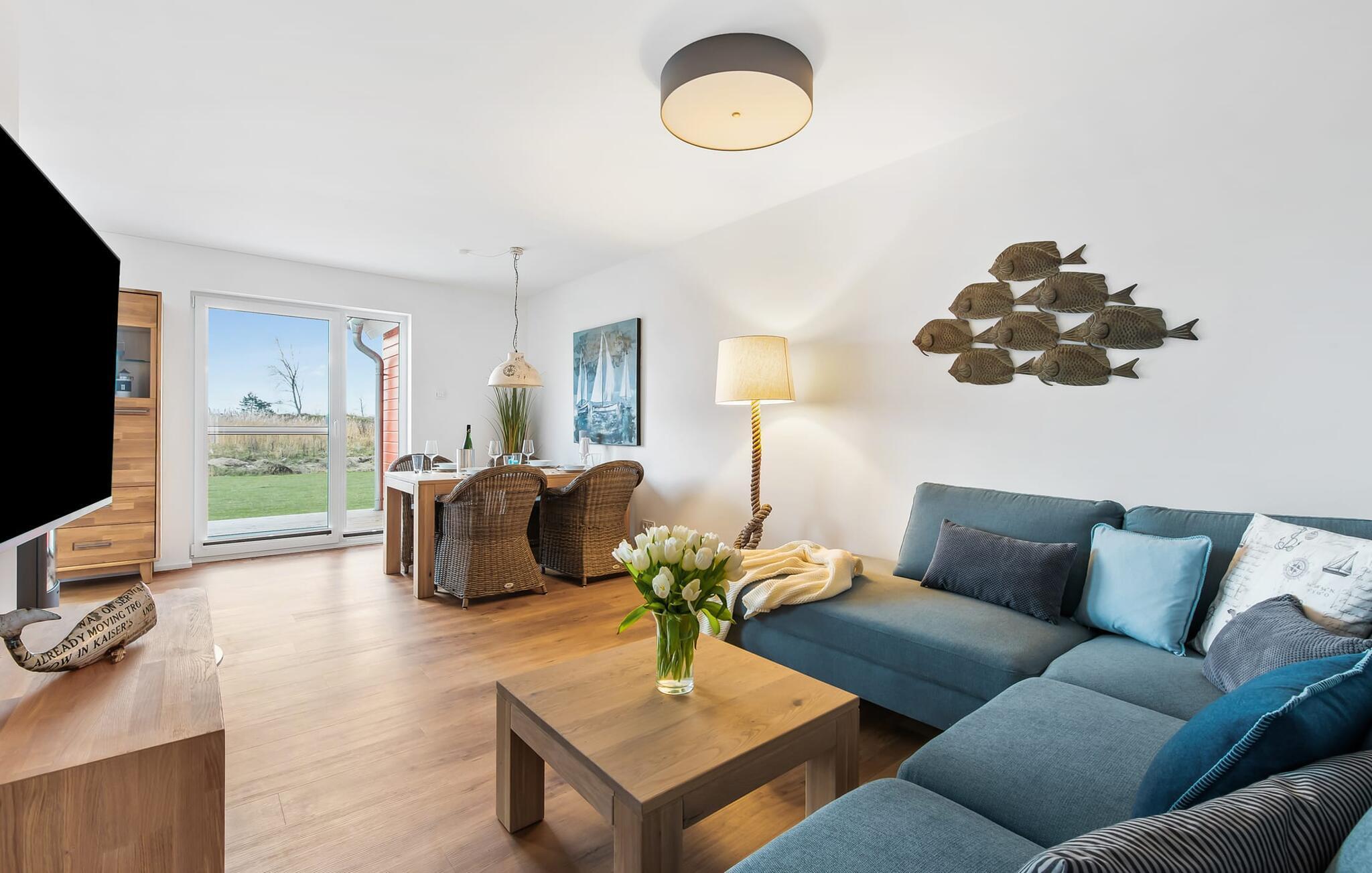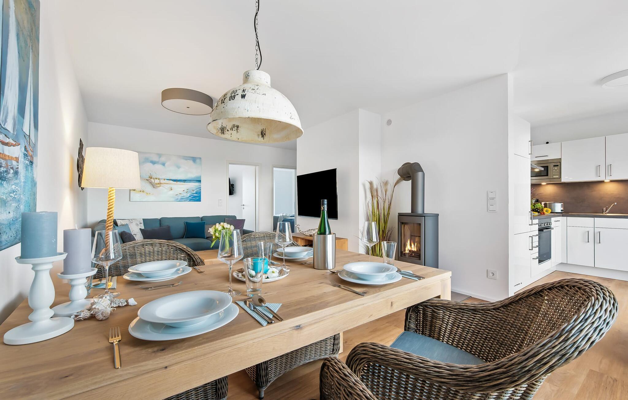 Ein lichtdurchfluteter Wohn- und Essbereich mit bodentiefen Fensterelementen und angrenzender Küche empfängt euch und lädt zum Verweilen und Entspannen ein. Konsequent in Holz, Blautönen und erdigen Nuancen gehalten, gepaart mit liebevollen maritimen Details spürt man den KAPTAIN überall. Ein großes gemütliches L-Sofa im Wohnbereich, ein Fernseher und ein Kaminofen verbreiten auch an nordischen Schietwettertagen wohlige Wärme und Gemütlichkeit. Und wenn die Sonne lockt, tretet einfach auf die angrenzende Terrasse hinaus und genießt die frische Ostseeluft in vollen Zügen. Hier stehen euch Gartenmöbel und ein Grill zur Verfügung und fröhliche Sommerabende sind vorprogrammiert. Aber die Mahlzeiten schmecken auch in der maritimen Essecke und die stylischen Korbsessel verleiten zum Sitzenbleiben. In allen Räumen findet ihr Bilder von Wasser, Wellen und Schiffen und man erkennt sofort, wer hier der Pate des Hauses ist.