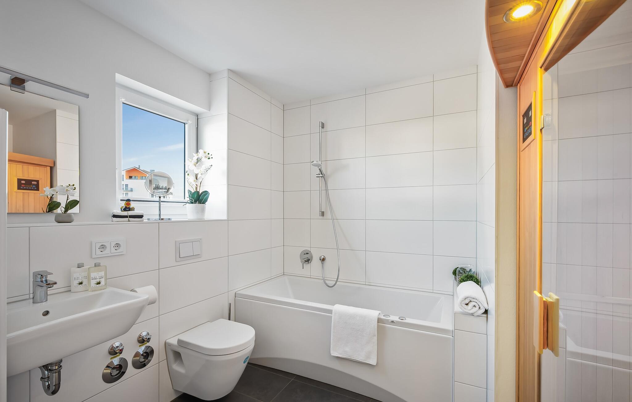 Das Bad entpuppt sich als eine kleine private Wellnessoase! Eine Whirlwanne mit Dusche und eine Infrarotkabine verwöhnt euch nach einem Sonnenbad oder langen Spaziergängen mit unvergesslichen Entspannungsmomenten. Schöner kann ein Urlaubstag nicht enden!