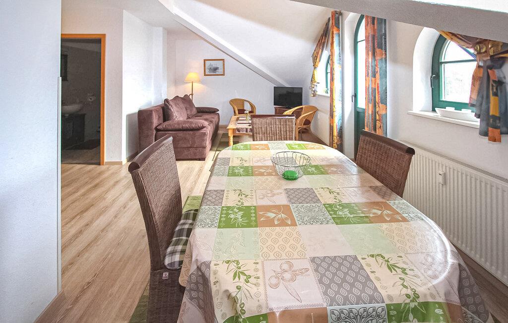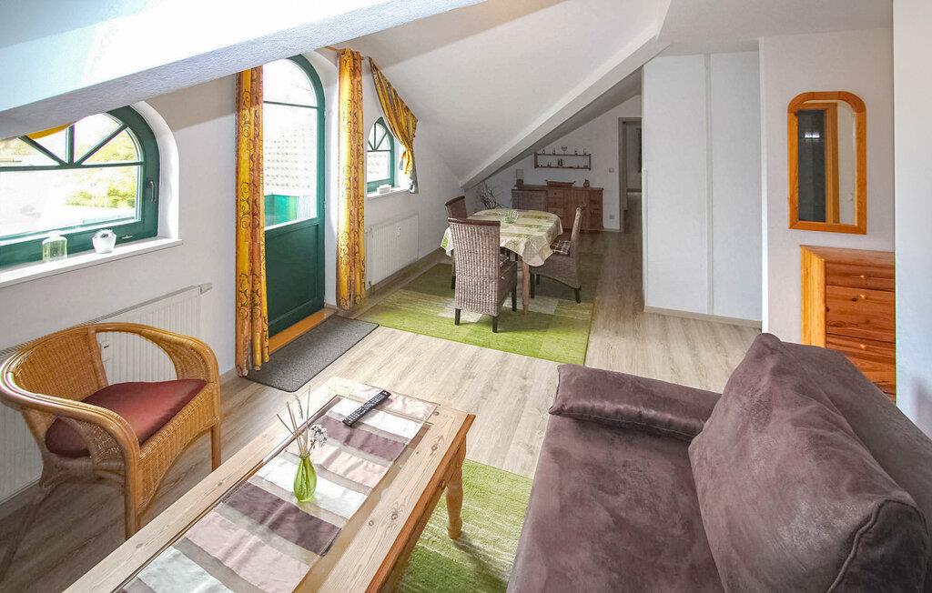 Diese Wohnung hat eine Größe von ca. 50 qm und ist für eine Belegung bis 4 Pers. geeignet. Sie verfügt über einen Wohnraum (Polster-Sitzecke inkl. Schlafcouch, Essplatz, TV, Radio), Küchenzeile mit E-Herd, Schlafraum (Doppelbett, Rollbett), DU/WC, Zentralheizung.