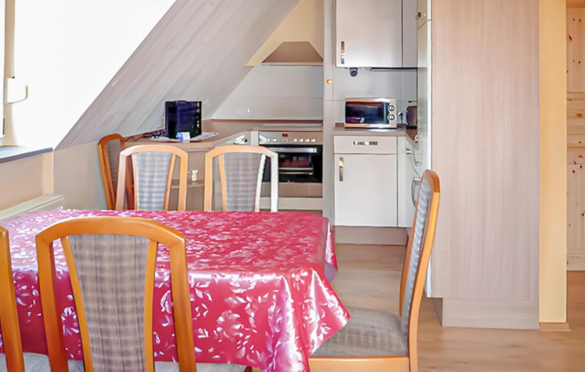 Diese Ferienwohnung hat eine Größe von 60 qm und befindet sich im Obergeschoss. Das 2. Schlafzimmer befindet sich im Dachgeschoss (über Treppe). Die Wohnung hat einen Balkon.