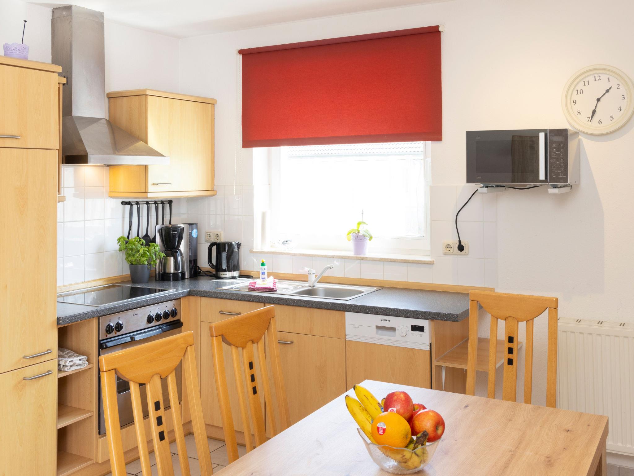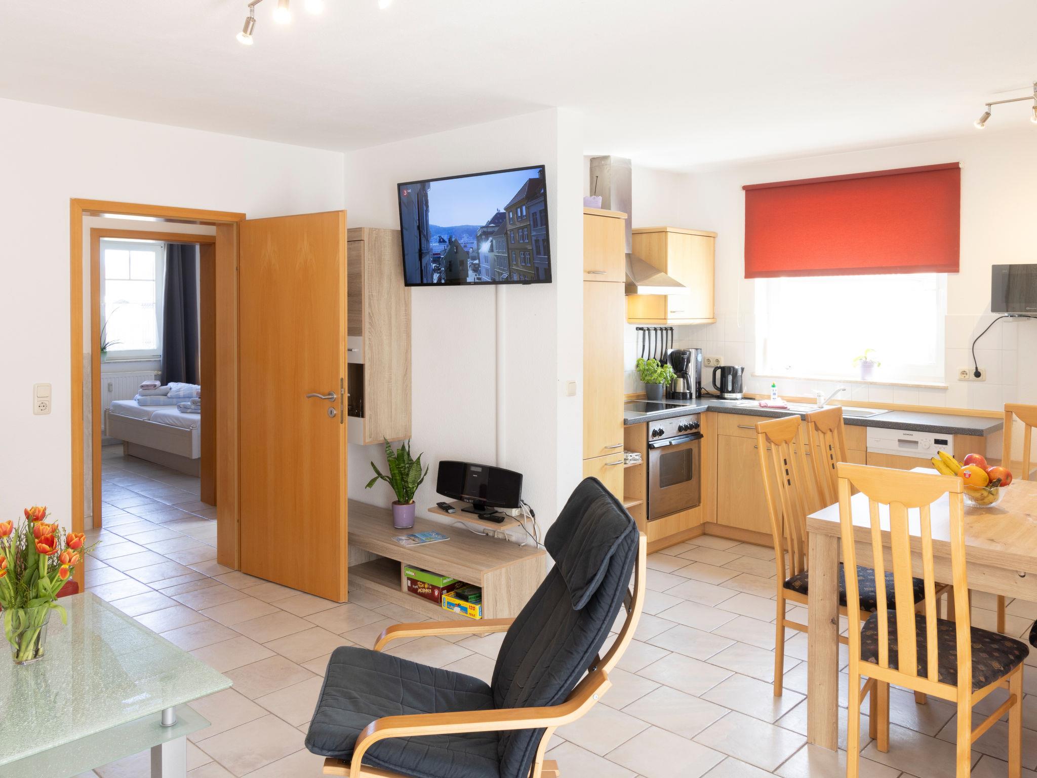 "Gartenstraße", 3-Zimmer-Wohnung 60 m2, im Erdgeschoss. Objekt geeignet für 2 Erwachsene + 2 Kinder. Komfortabel und stilvoll eingerichtet: Wohnzimmer mit Esstisch, Sat-TV, Stereoanlage und DVD. Ausgang zur Terrasse. 1 Doppelzimmer. 1 kleines Zimmer mit 1 x 2 Etagenbetten. Kochnische (Backofen, Geschirrspüler, 4 Glaskeramikplatten, Toaster, Wasserkocher, Mikrowelle, elektrische Kaffeemaschine). Dusche/WC. Ölheizung. Terrasse teilweise überdacht. Terrassenmöbel. Zur Verfügung: Kinderhochstuhl, Babybett. Parkplatz (1 Auto). Bitte beachten: Nichtraucher-Unterkunft. Maximal 2 Haustiere/Hunde erlaubt. Rauchmelder, Feuerlöscher.