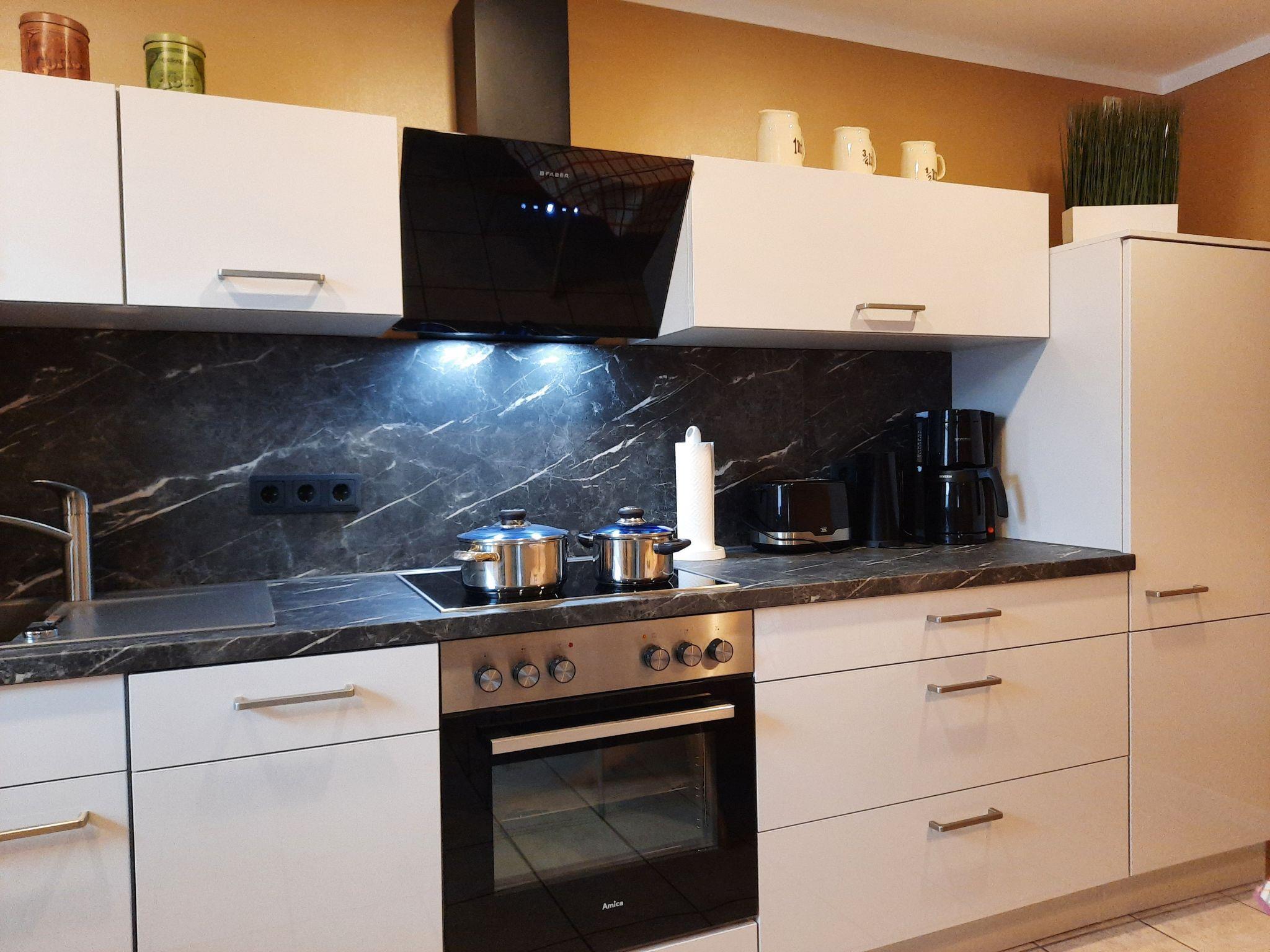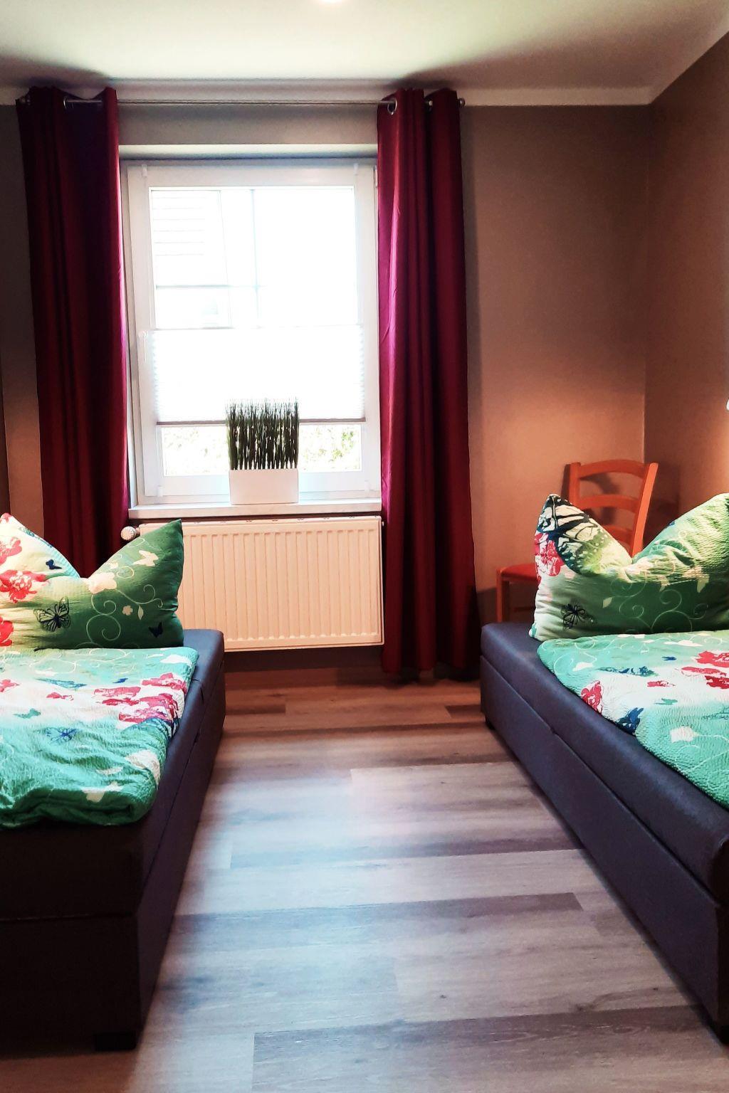 Unsere schöne helle, großzügige Ferienwohnung ist ca. 85 m² groß und hat Platz für fünf Personen. Es befinden sich in der Wohnung eine vollausgestatteten Küche mit Herd, Backofen, Geschirrspüler, Mikrowelle, Toaster, Wasserkocher und einen gemütlichen Esstisch, ein schönes helles Wohnzimmer mit Fernseher, ein Schlafzimmer mit großem Doppelbett und ein Einzelbett, ein zweites Schlafzimmer mit 2 seperaten Schlafbetten, die auf Wunsch auch gern zusammen gestellt werden können. Gern stellen wir Ihnen auf Anfrage auch ein Kinderreisebett zur Verfügung. Weiterhin verfügt die Wohnung über ein wunderschön großes Bad mit Dusche und Badewanne.