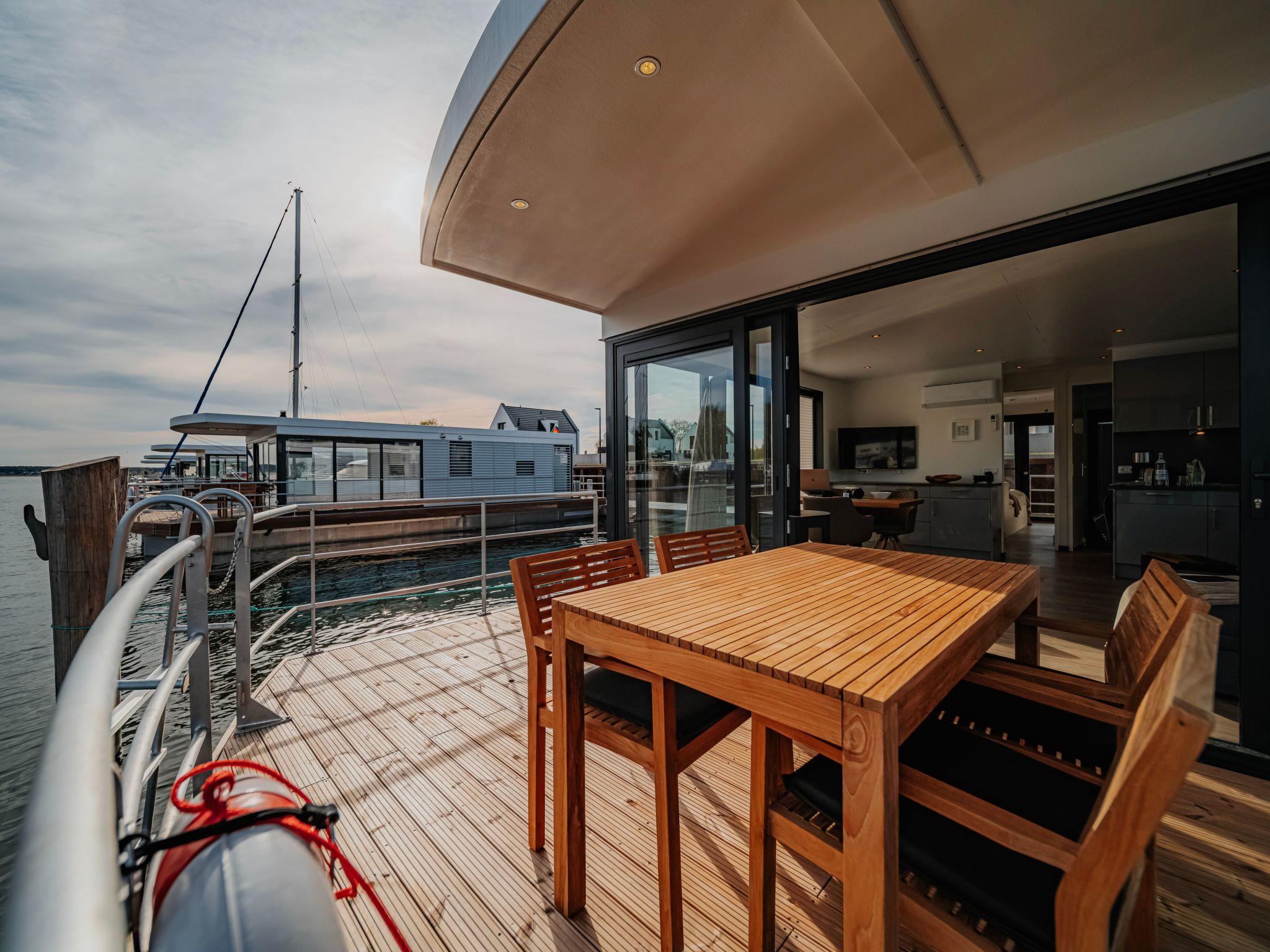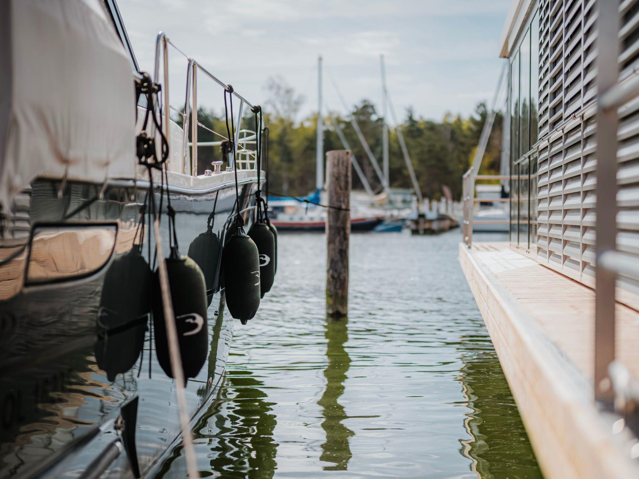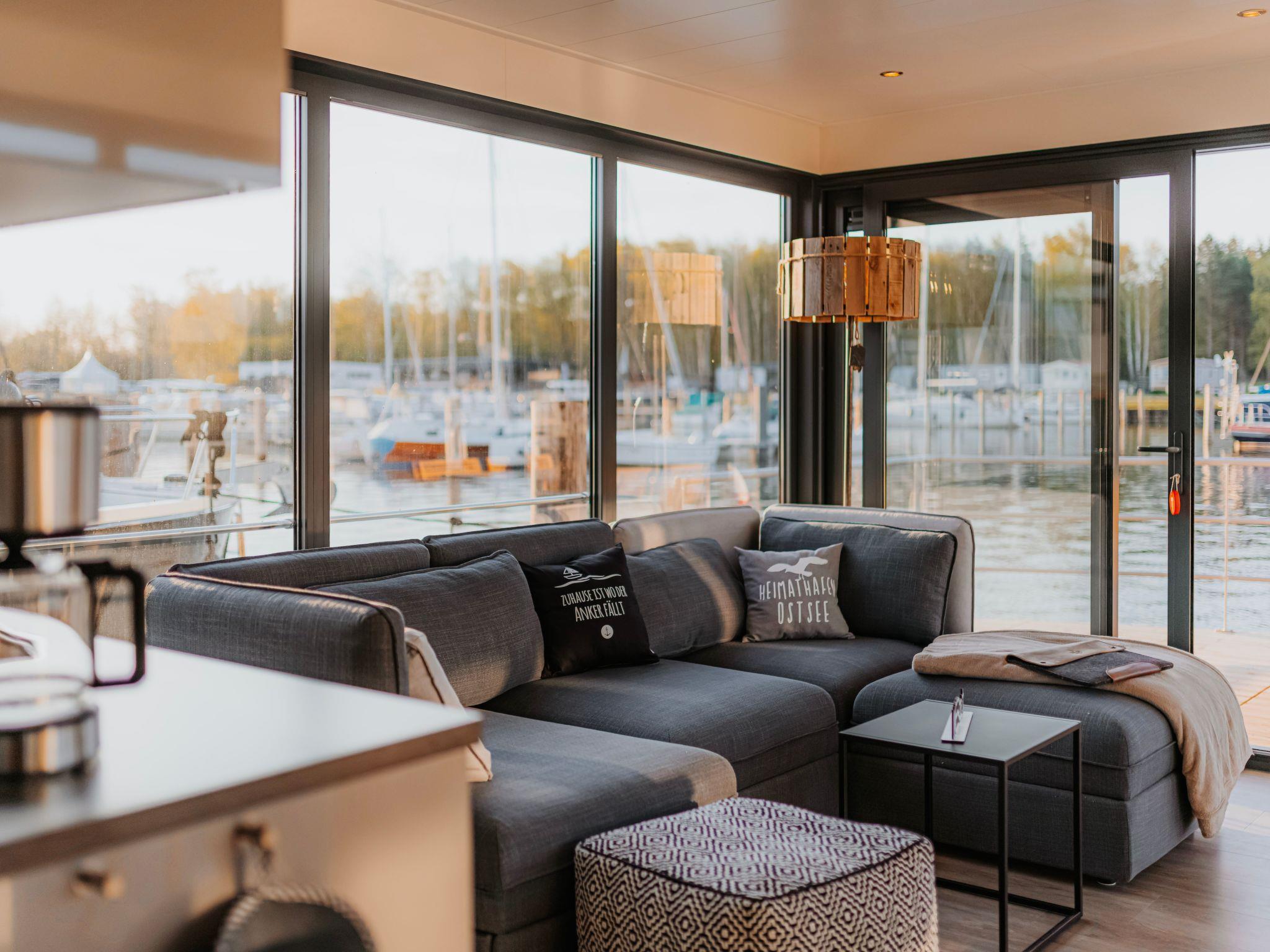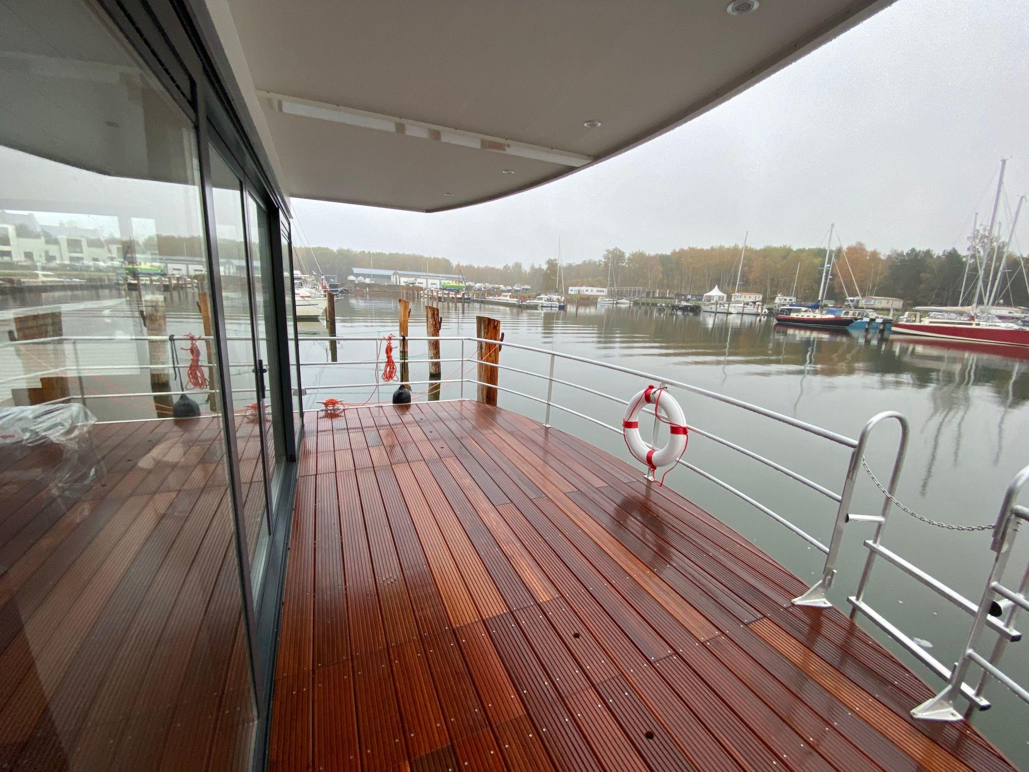 Erleben Sie erholsamen Urlaub im modernen Floatinghouse Trinity direkt im Yachthafen Peenemünde auf Usedom.