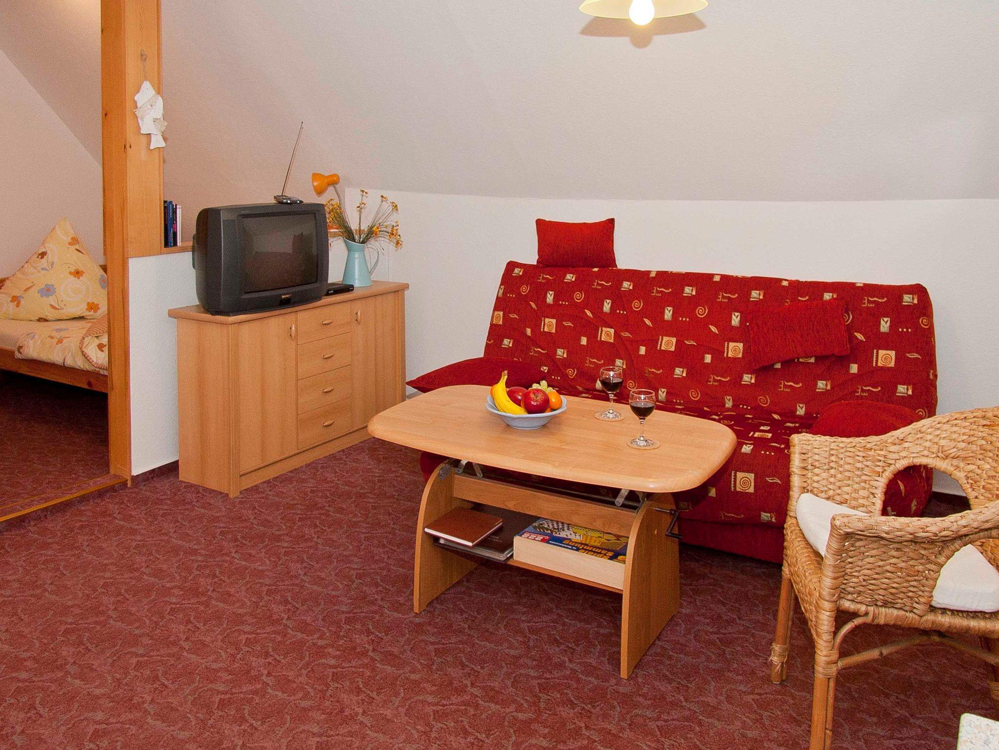 Die OG-Fewo besteht aus Wohn-, Schlaf- und Küchenbereich,Bad sowie einem geräumigen Schlafboden.Zum Wohnbereich gehören Couch, - tisch, Radio/TV. Zum Küchenbereich Winkelküche mit u.a.Herd incl.Backofen,Kühlschrank mit Gefrierfach, Essecke, Geschirr. Der Schlafbereich ist durch kleinen Raumteiler vom Wohnbereich getrennt u. besteht aus Doppelbett, Schrank u.Leiter zum Schlafboden. Auf dem Schlafboden gibt es ein Doppelbett. Es gibt eingeräumiges Bad mit Dusche, WC, Waschtisch, Fön. Zur Fewo gehören Terrasse, Holzkohlegrill, Parkplatz.