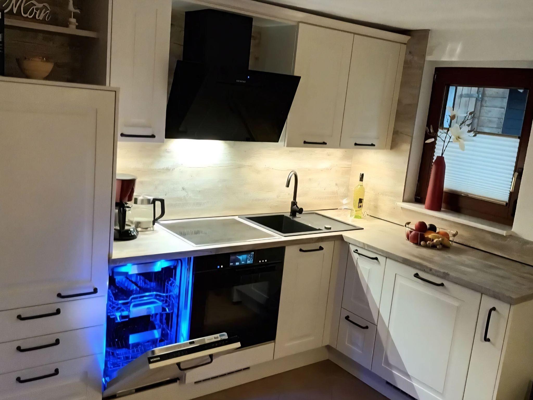 Das Haus ist liebevoll eingerichtet und verfügt über eine integrierte Küche im Wohnbereich. Ein neue Küche wurde im Jahr 2024 eingebaut mit einer im Ofen integierten Microwelle. Alle Räume haben Fenster, sodass es im Haus hell und freundlich ist.