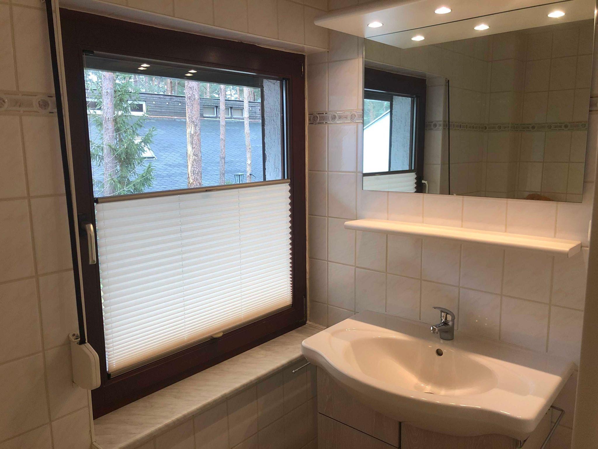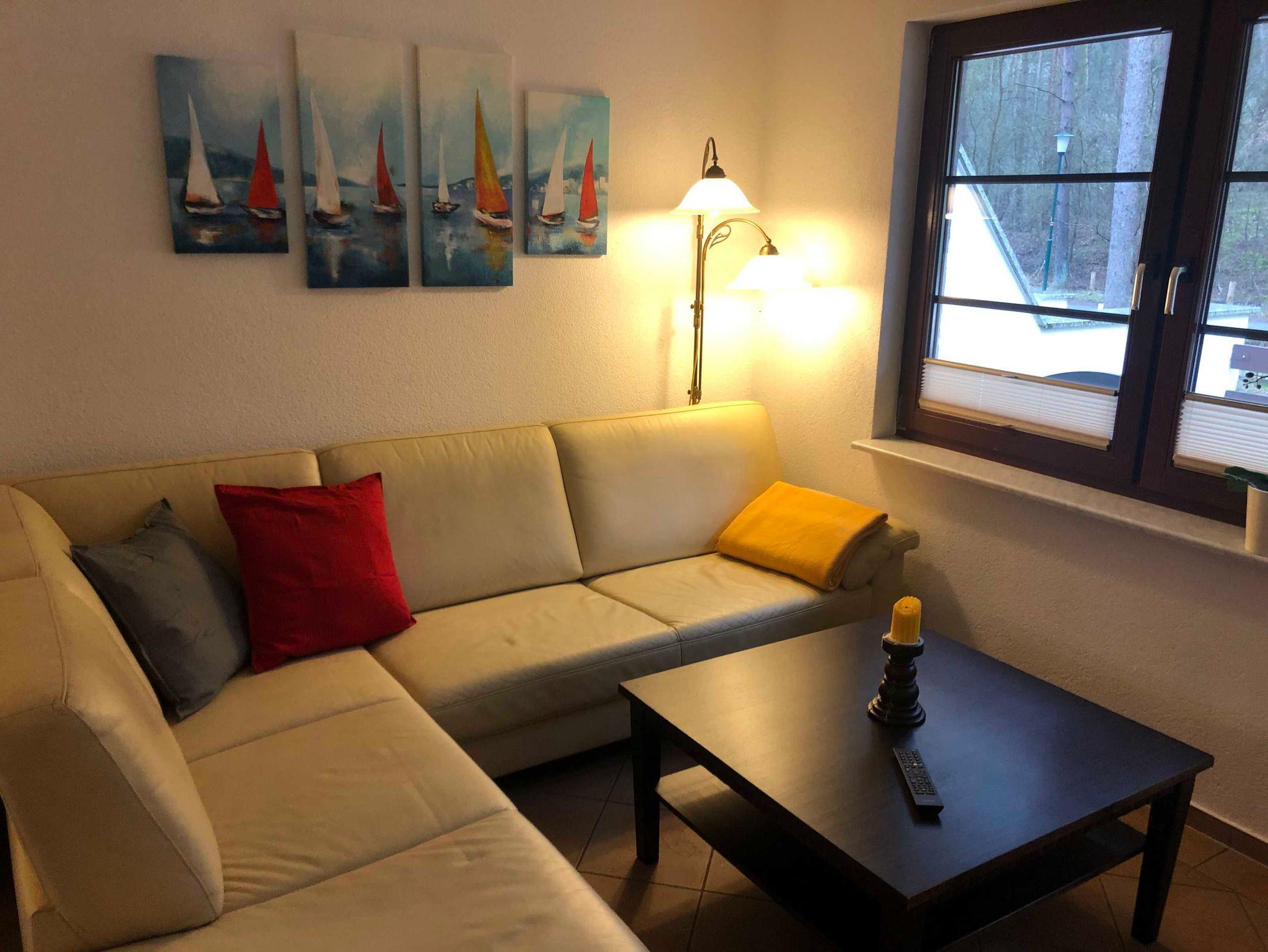 Das Wohnzimmer verfügt über eine Couchgarnitur mit Tisch. Im Haus gibt es 1 Schlafzimmer mit Doppelbett (2 x 90 x 200 cm) und ein Schlafzimmer mir 2 Einzelbetten (jeweils 80 x 200 cm) im oberen Bereich. Im Erdgeschoss ist ein Bad mit Dusche, im oberen Bereich ein Gäste WC vorhanden.