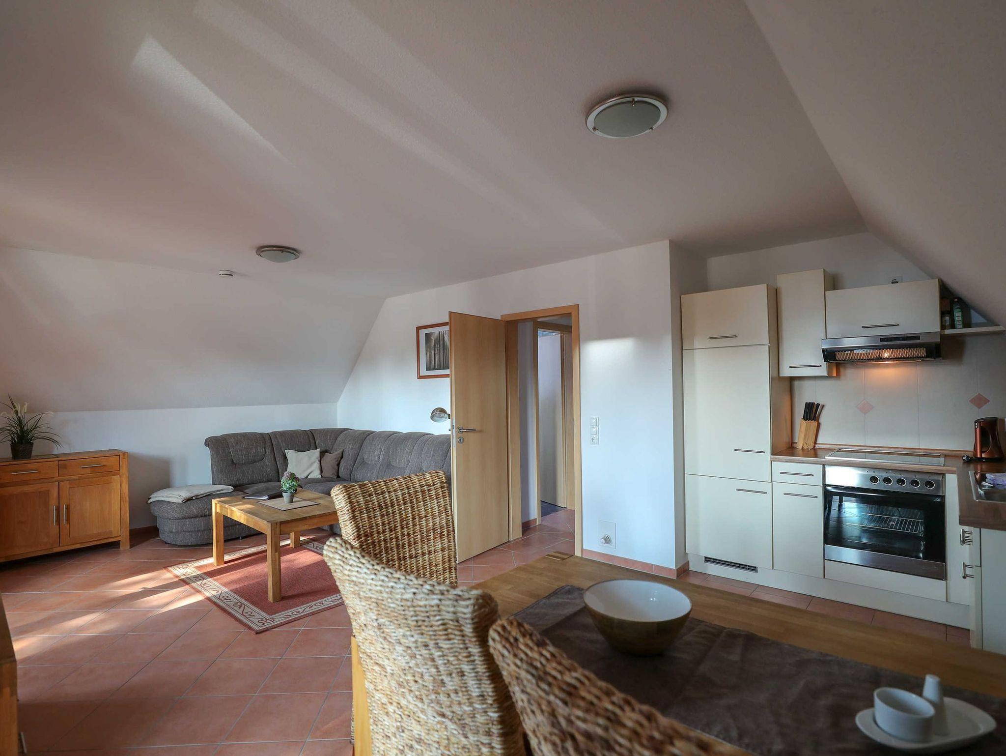 Die Suiten haben *** Sterne, die Küche ist im Wohn-, und Esszimmer integriert. Von hier gelangt man direkt auf den Balkon.mit Abendsonne.