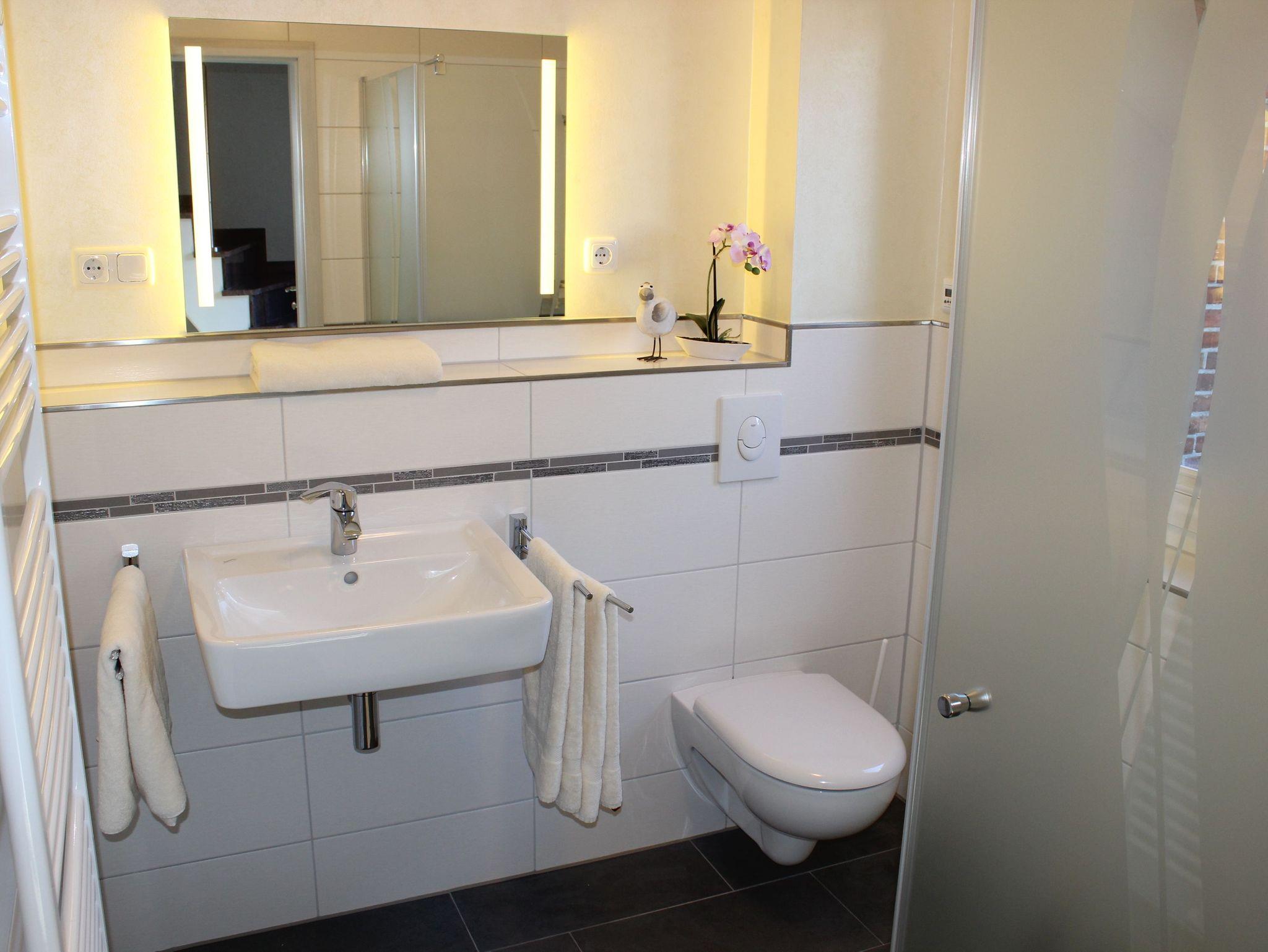 Ebenfalls im Erdgeschoss befindet sich das elegante Badezimmer mit Dusche, WC und Fußbodenheizung. Gegenüber vom Bad führt eine Treppe zu den beiden Schlafräumen im Obergeschoss. Im größeren befindet sich ein Doppelbett, während nebenan zwei Einzelbetten stehen. Die Betten beziehen wir für Sie, fühlen Sie sich bei Anreise einfach zuhause! In beiden Zimmern gibt es Kleiderschränke mit verschiedenen Abteilen, sodass Ihnen genügend Stauraum für die Unterbringung von Lieblingskleidern und persönlichen Gegenständen zur Verfügung steht. Fenster durchbrechen die Dachschrägen - so fungiert der Usedomer Sternenhimmel als natürliches Nachtlicht!