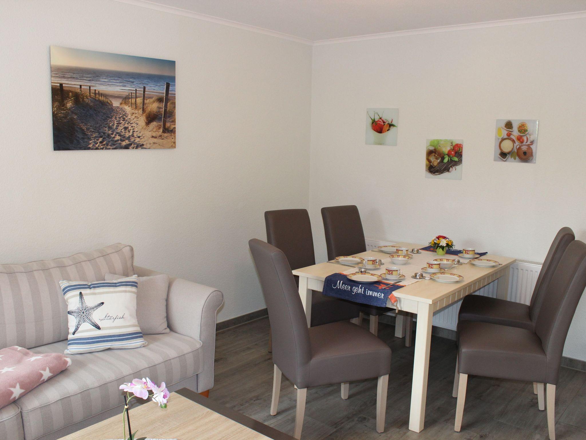 Im Erdgeschoss finden Sie den Wohnbereich mit offener Küche und Zugang zu einer der beiden Terrassen. Die Küchenzeile, gehalten in klassisch-elegantem Weiß mit Akzenten in Holztönen und warmem Orange, verfügt über eine gut sortierte Ausstattung. Vorhanden sind Kühlschrank mit Gefrierfach, Backofen, Mikrowelle, 2-Platten-Induktionsherd und Spülmaschine, sowie nützliche Kleingeräte wie Toaster, Kaffeemaschine und Wasserkocher - alles Notwendige, um frische Mahlzeiten zu zaubern. Für genügend Licht beim Gemüseschnippeln sorgt die Unterbaubeleuchtung an den Küchenschränken. Am Esstisch bieten hochwertige Polsterstühle besonderen Sitzkomfort beim geselligen Plauschen, Speisen oder Planungsrunden für den nächsten Urlaubstag. Den Wohnbereich komplettiert eine modern-behagliche Sitzgruppe. Hier haben Sie Zugang zu Medien wie LED-Fernseher mit Sat-Empfang, Radio und WLAN. Die Couch ist ausziehbar und kann als Aufbettung für eine Person genutzt werden.
