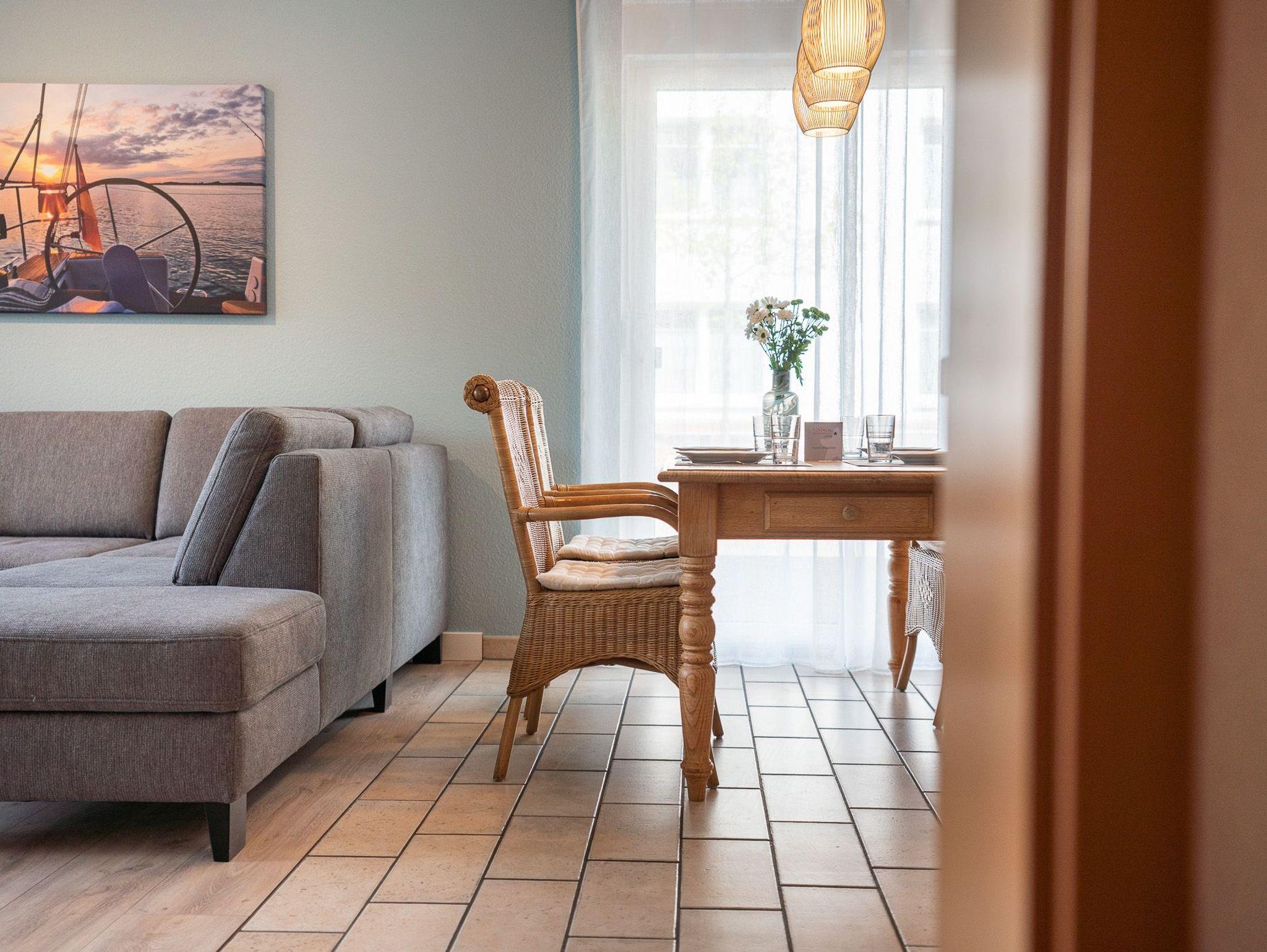 Der behagliche Wohnraum mit einer gemütlichen Sitzecke und einem Fernseher, sowie die komplett eingerichtete, offene Küche bieten einen guten Ort um sich gemeinsam in der Wohnung zu entspannen. Durch die zwei Schlafzimmer, gibt es jedoch auch einen ruhigen Rückzugsort um abzuschalten. Ein Schlafzimmer ist mit einem Doppelbett ausgestattet und eins mit zwei Einzelbetten. Das Badezimmer besitzt eine Dusche und ein WC. Auf dem Balkon können Sie gemütlich den Abend ein- und ausklingen lassen. WLAN ist vorhanden. Waschmaschine und Trockner können Sie gegen Entgelt verwenden. Natürlich stellen wir Ihnen ein PKW-Parkplatz vor dem Haus zur Verfügung. Zum feinsandigen, weißen Badestrand sind es nur ca. 3-4 Gehminuten.