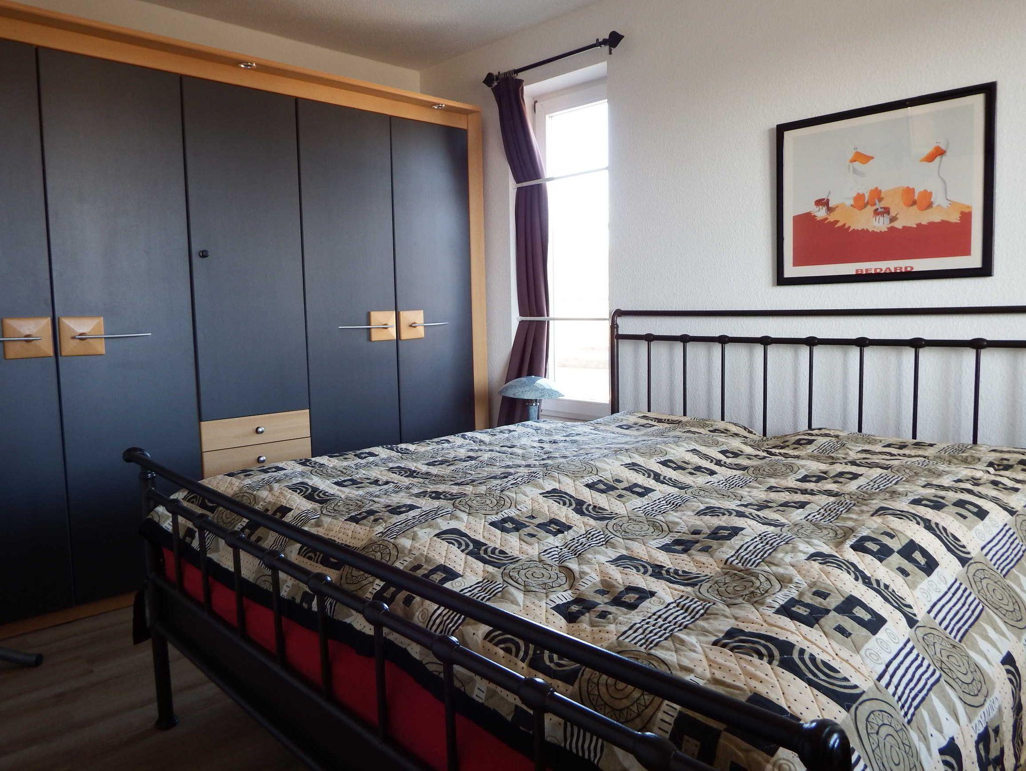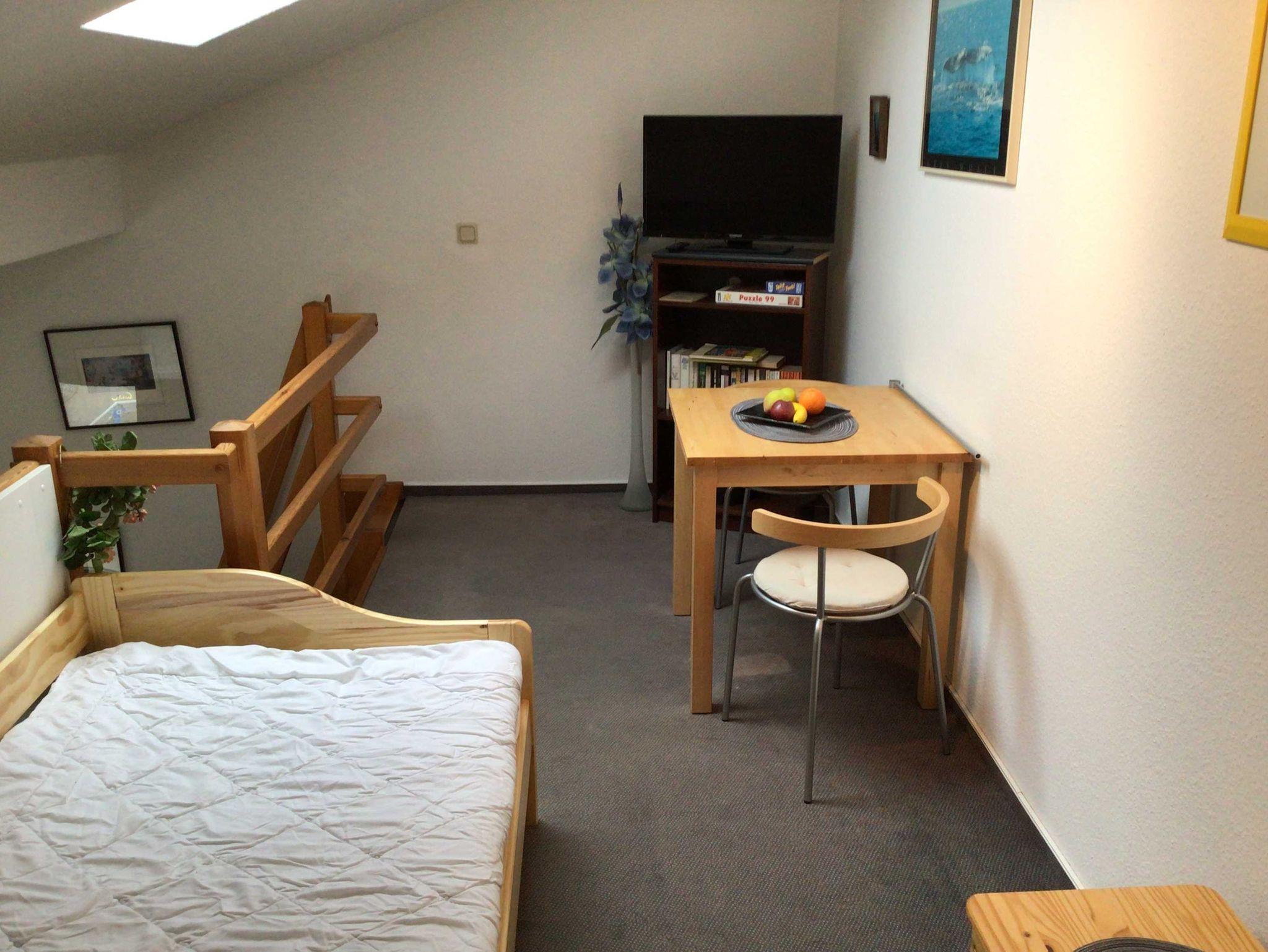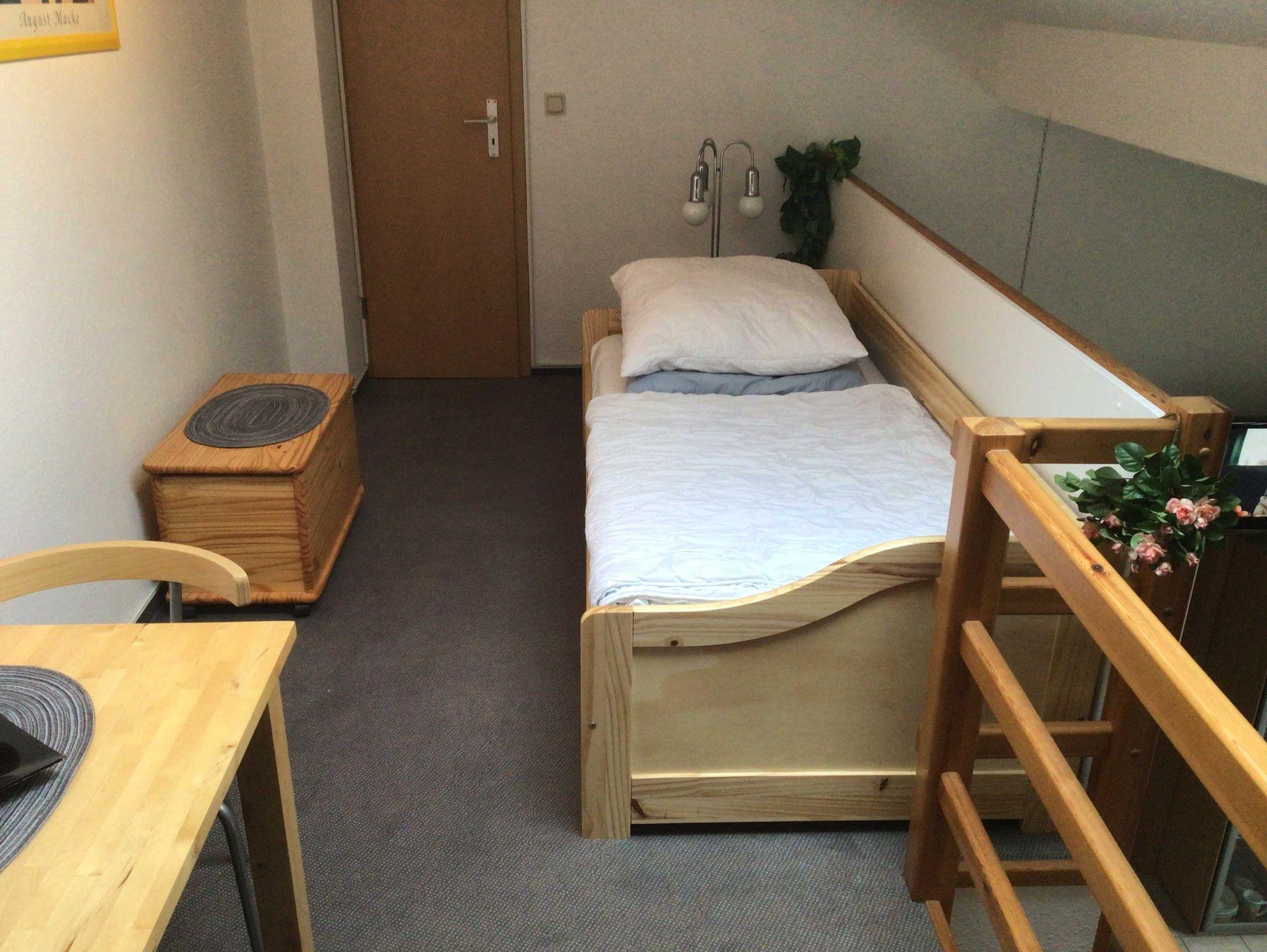 1 Schlafzimmer mit Doppelbett, 1 Schlafplatz mit Einzelbett auf der Galerie im Wohnbereich . Die Galerie ist über eine Treppe (Raumspartreppe) zu erreichen - Bitte beachten sie, diese Treppe ist sehr steil und könnte für körperlich eingeschränkte Personen und kleinere Kinder ein Problem darstellen. Die Wohnung verfügt über einen schönen Balkon zum Strandvorplatz / Maiglöckchenberg raus.