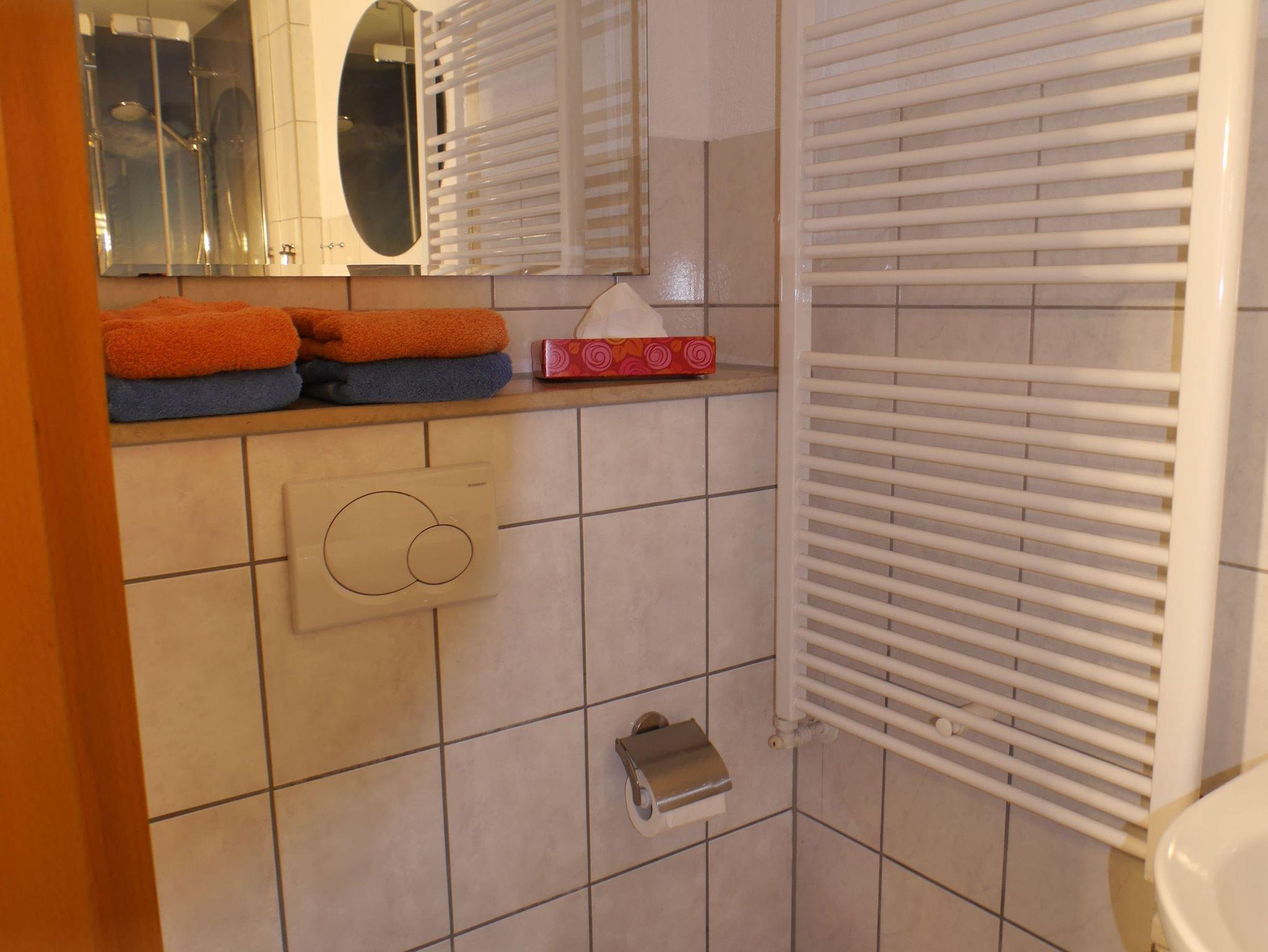 Das Bad ist mit WC, Waschtisch und Dusche ausgerüstet.