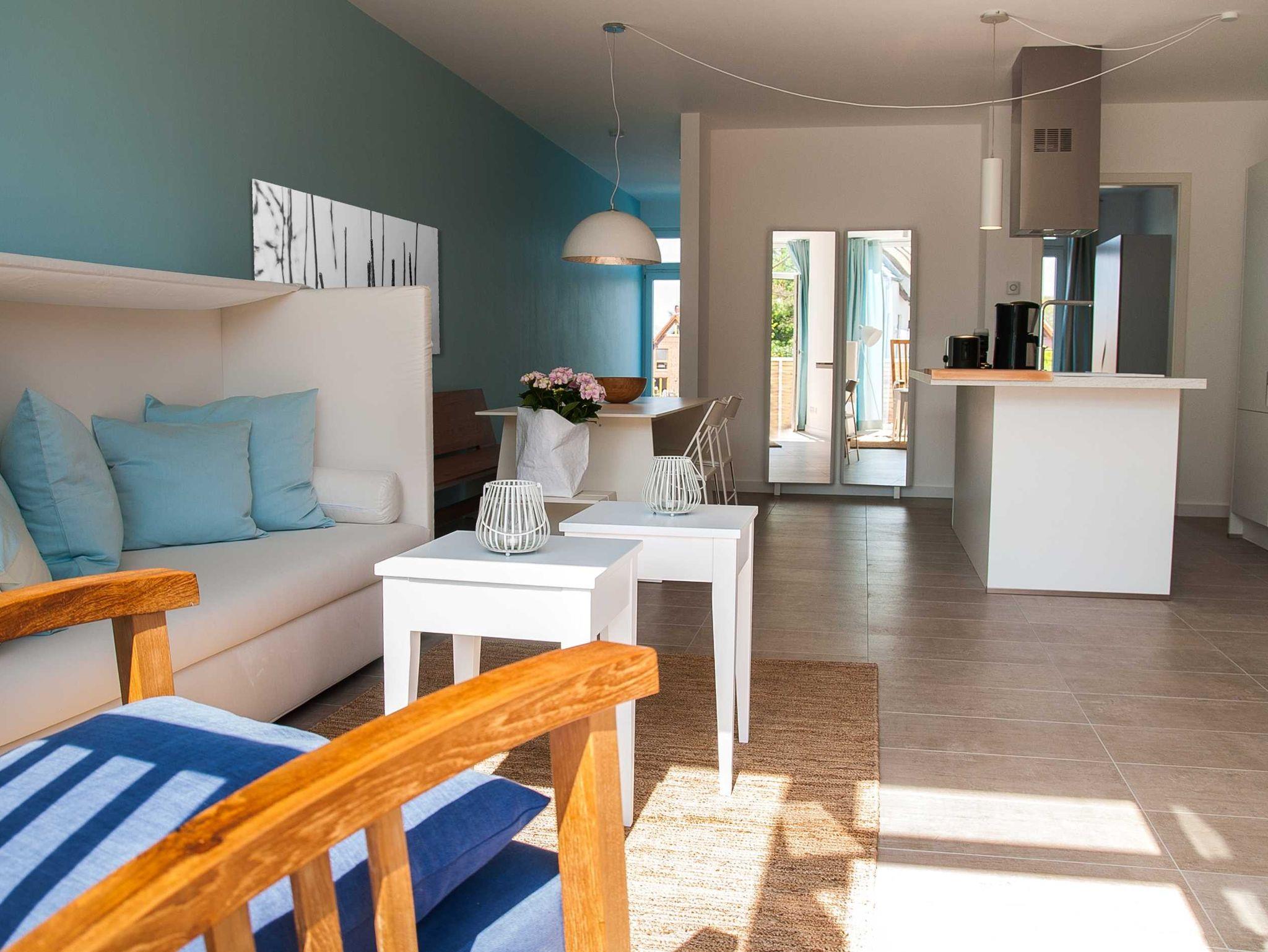 • Wohn-/ Essbereich mit Esstisch für 4 Personen, Schlafcouch (ca. 1,60 m x 2,00 m), Couchtisch, Flachbildfernseher mit ca. 100cm Bilddiagonale
