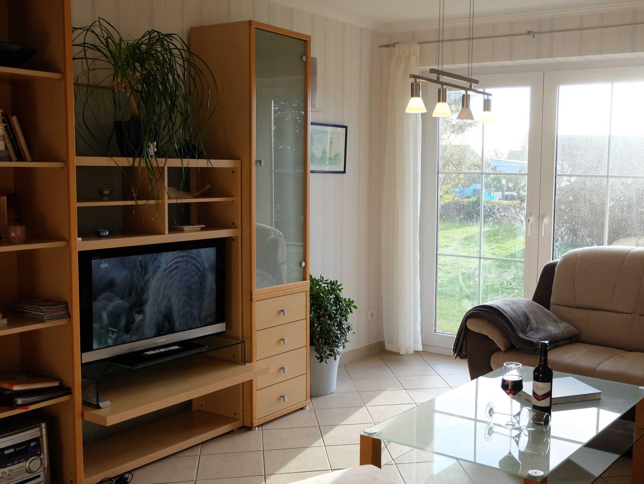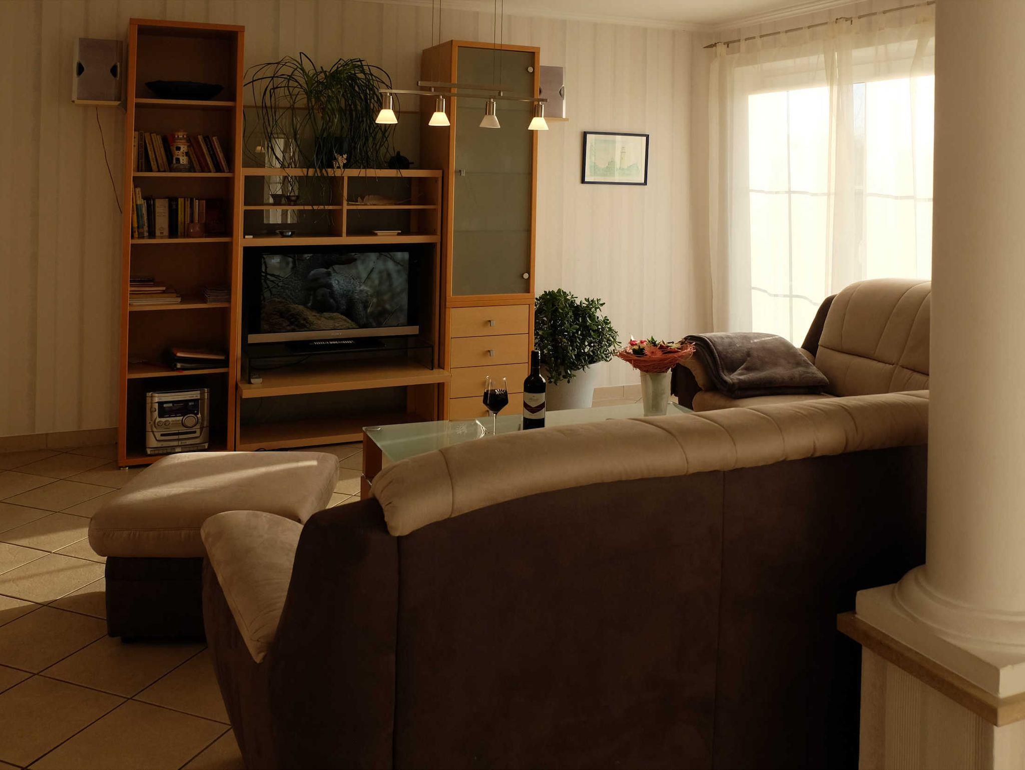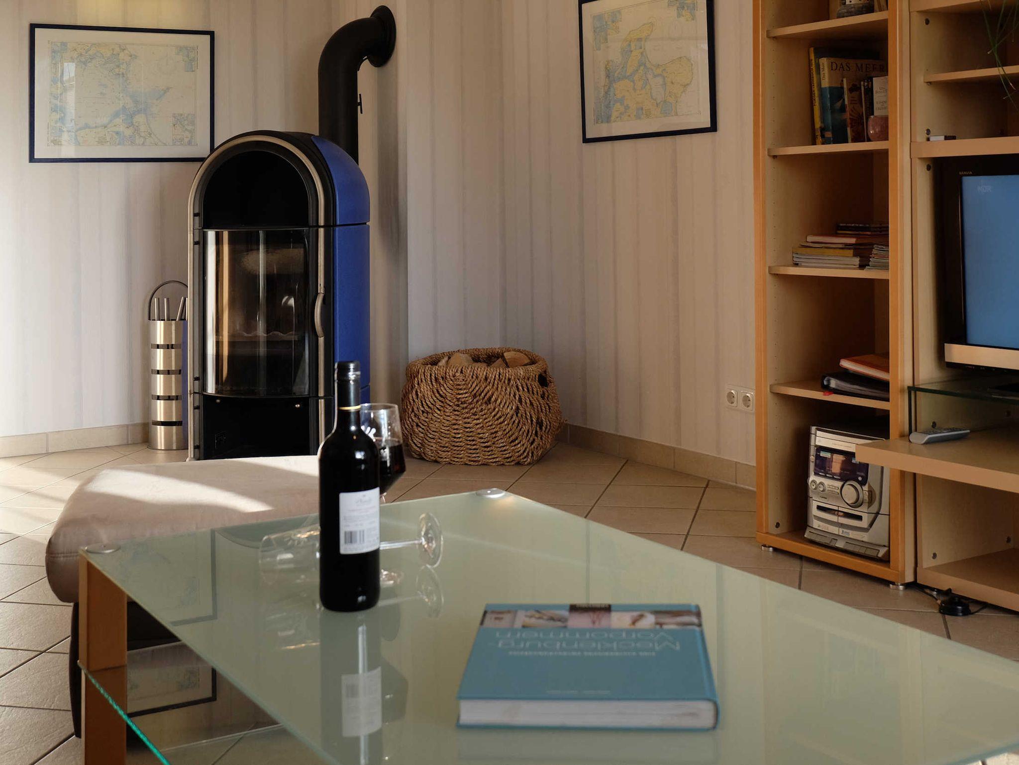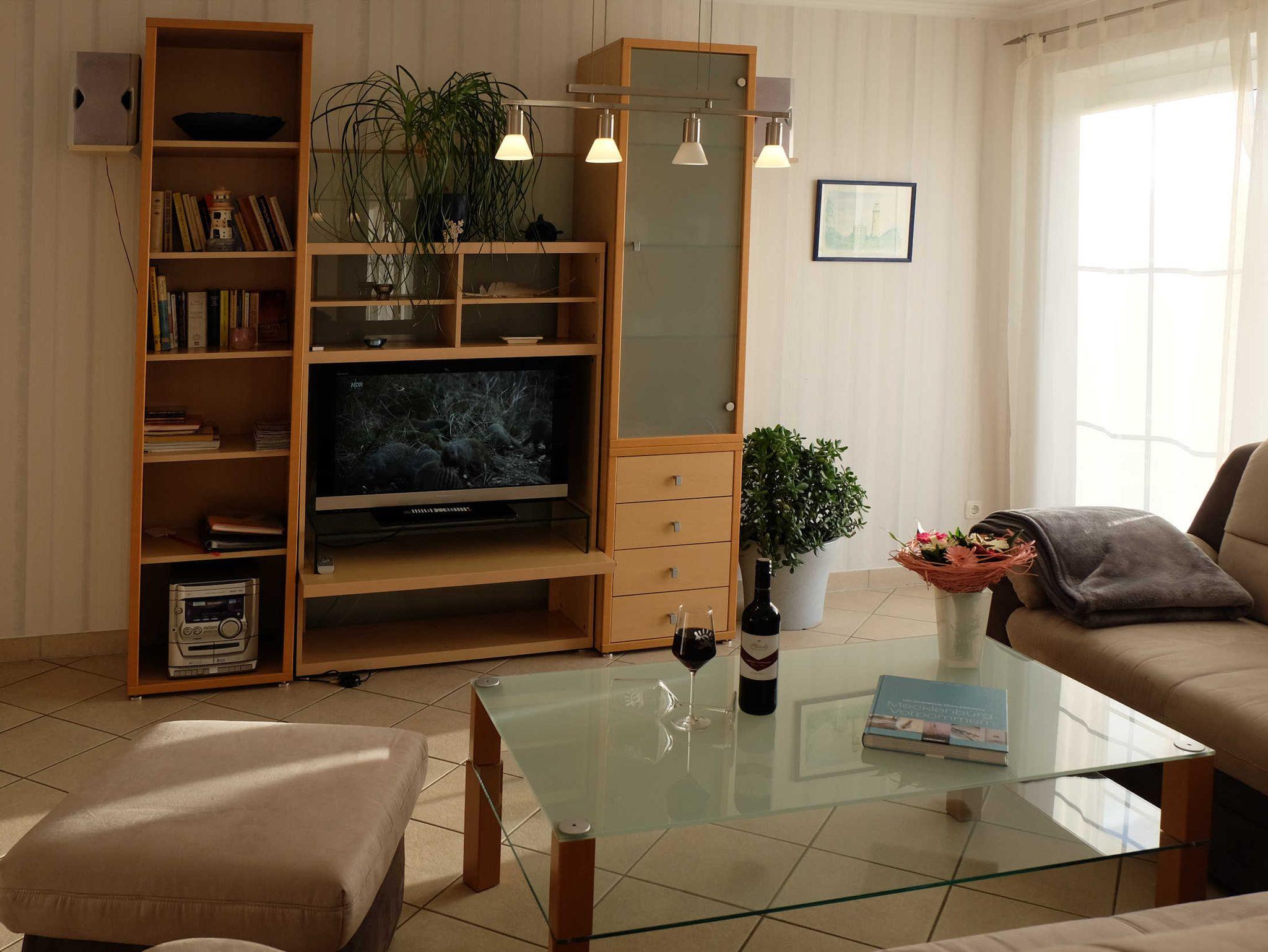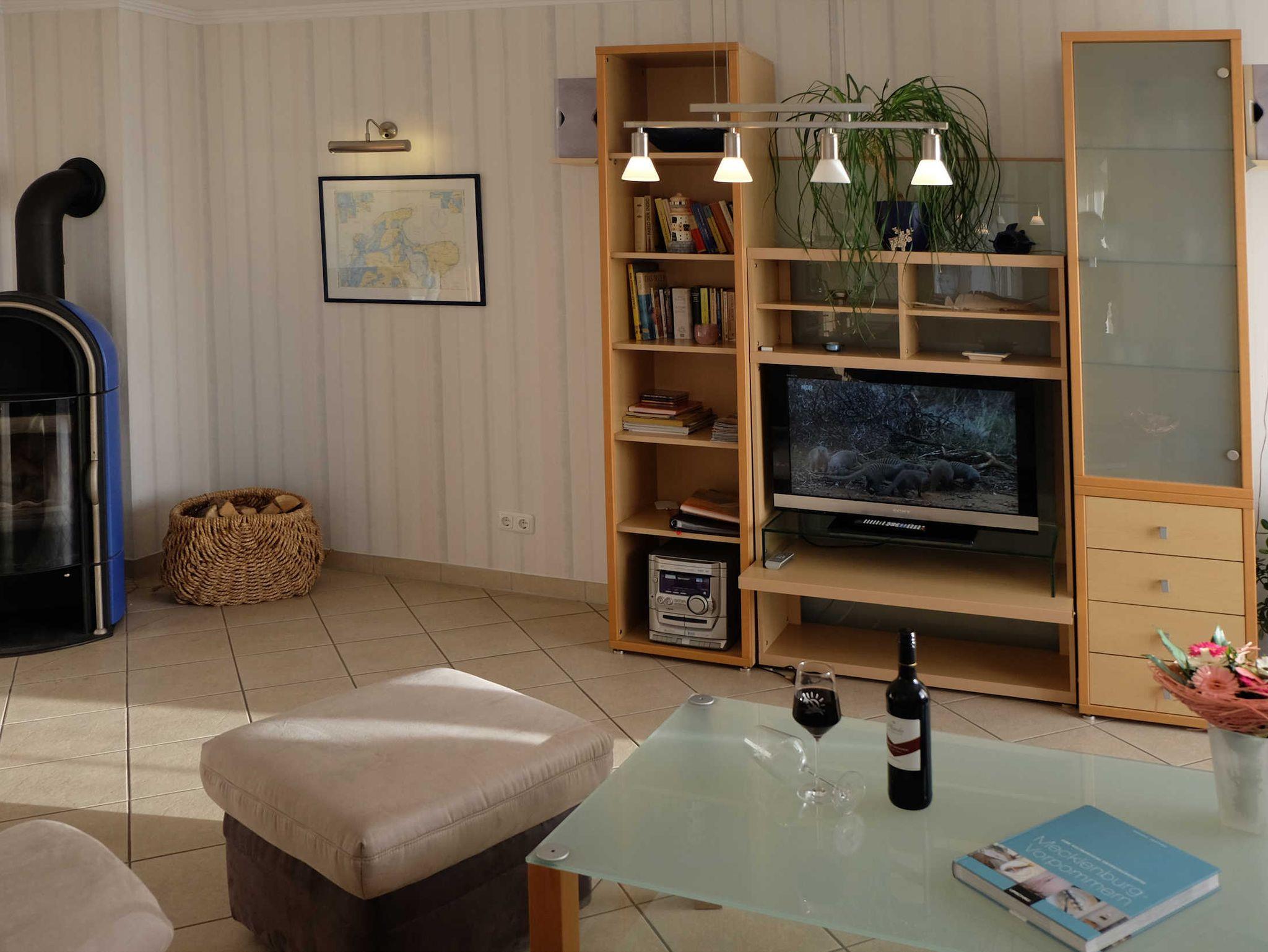 Vom Wohnungseingang kommen Sie durch den Flur direkt in die jeweiligen Zimmer. Im Wohnzimmer, mit einer bequemen Couch sowie Fernseher und Stereoanlage, einem Kaminofen. Seine große Fensterfront zeigt nach Westen und so lädt die Terrasse Sie direkt ein, den Sonnenuntergang zu geniessen. Direkt an den Wohnbereich gliedert sich die voll ausgestattete Küche mit Backofen & Herd, Kühlschrank, Mikrowelle, Spülmaschine und einem Essplatz mit sechs Plätzen an.