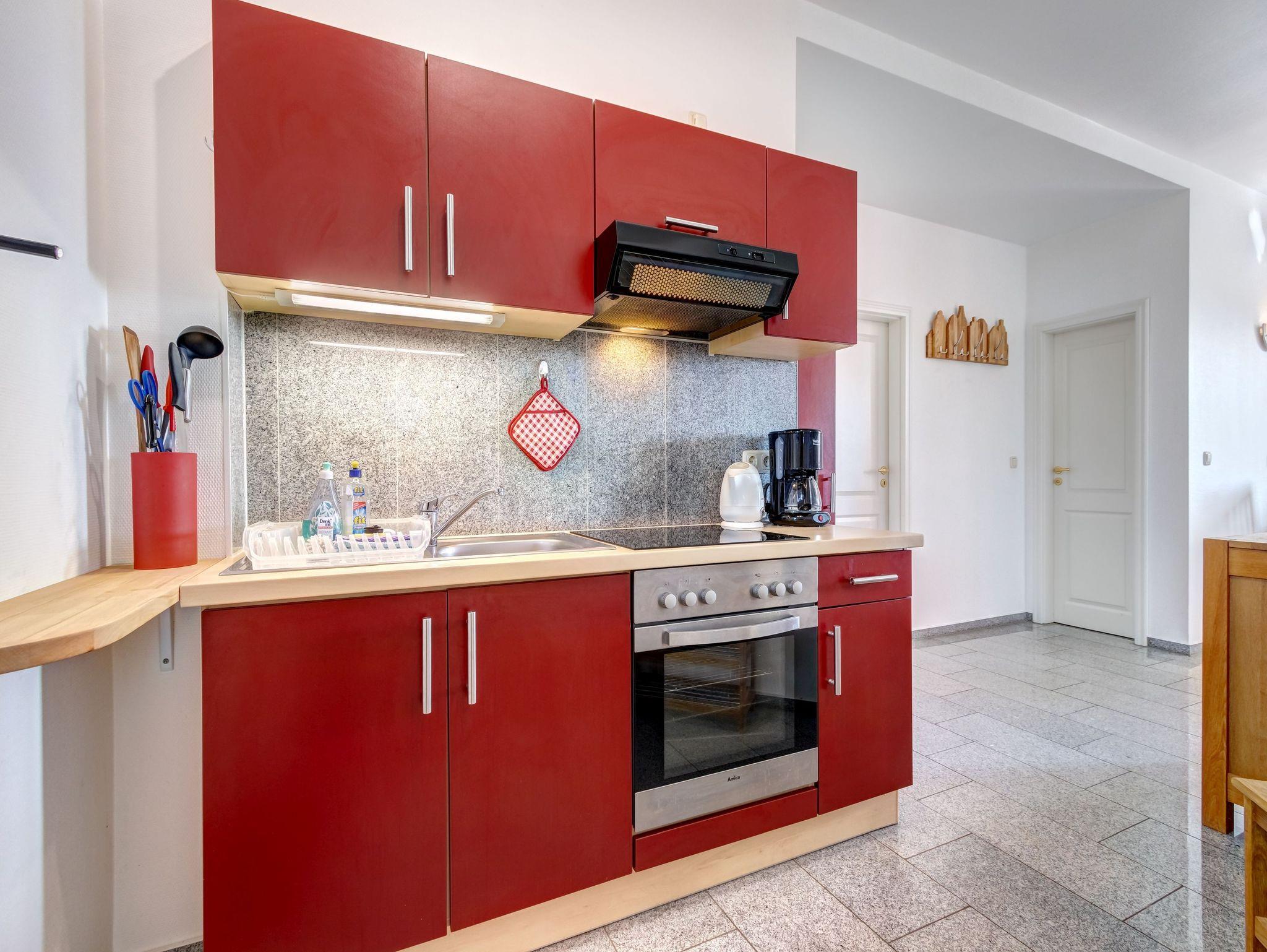 Anschließend an das Wohnzimmer befindet sich die Küchenzeile, ausgestattet mit reichlich Geschirr, Toaster, Kaffeemaschine, Wasserkocher, E-Herd mit Cerankochfeld und Backofen.
