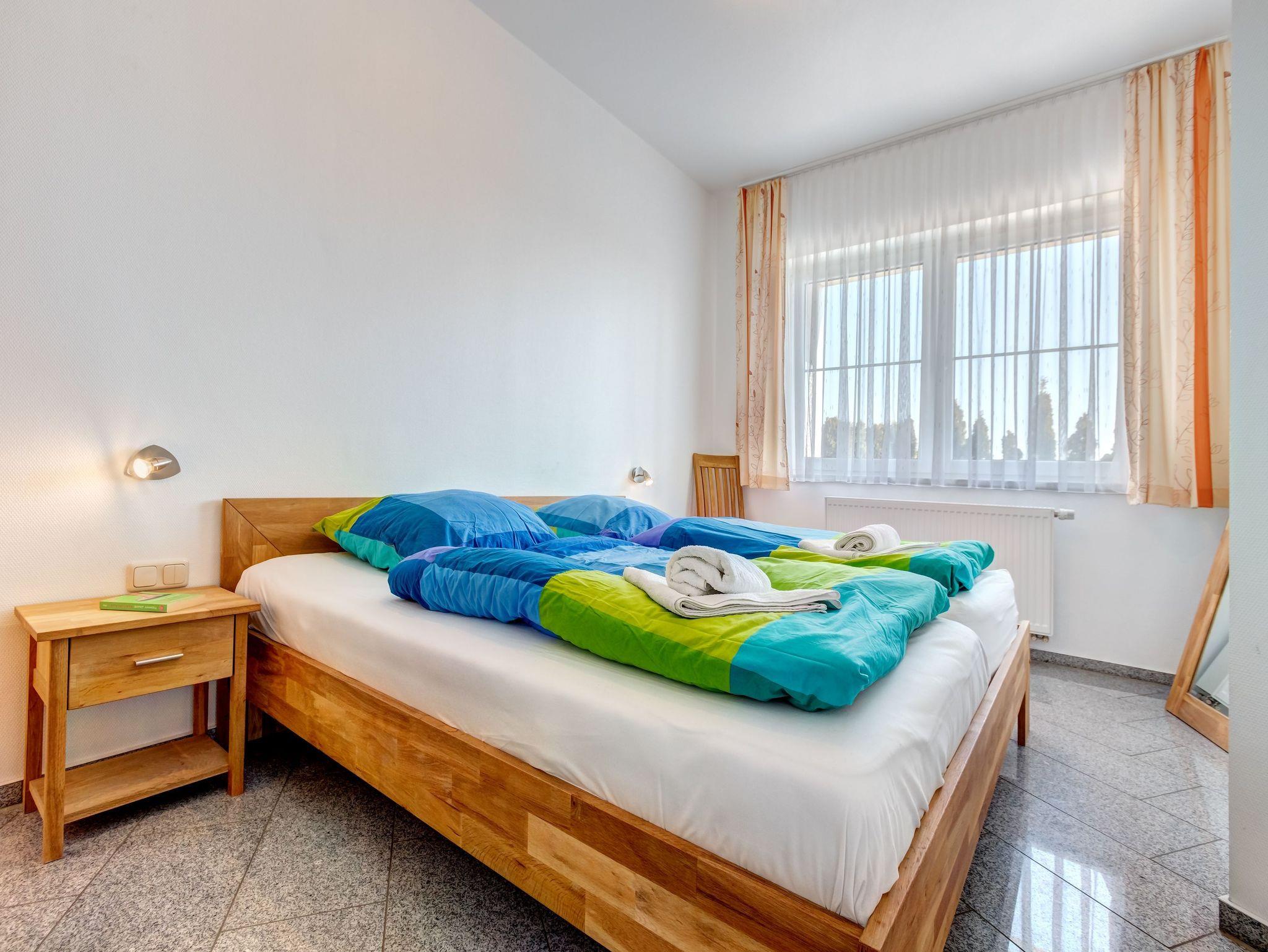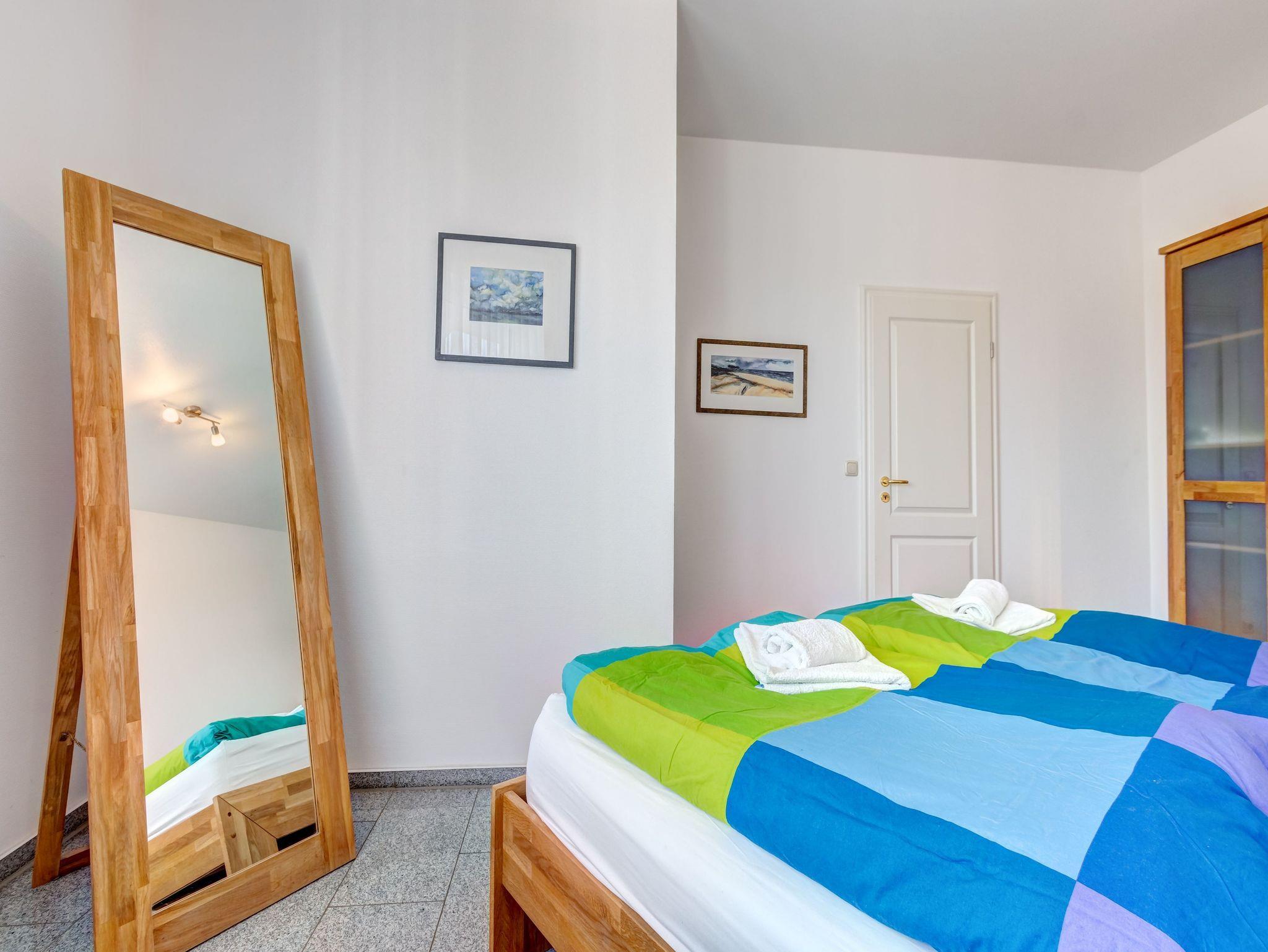 Das Bad ist mit einer Dusche, WC und Fußbodenheizung ausgestattet. In den zwei getrennten Schlafzimmern befindet sich je ein Doppelbett (2m x 2m und 1,80m x 2m), ein Kleiderschrank und Ablagemöglichkeiten. Im Bedarfsfall kann die Couch im Wohnzimmer zum Bett (1,60m x 1,90m) umfunktioniert werden.