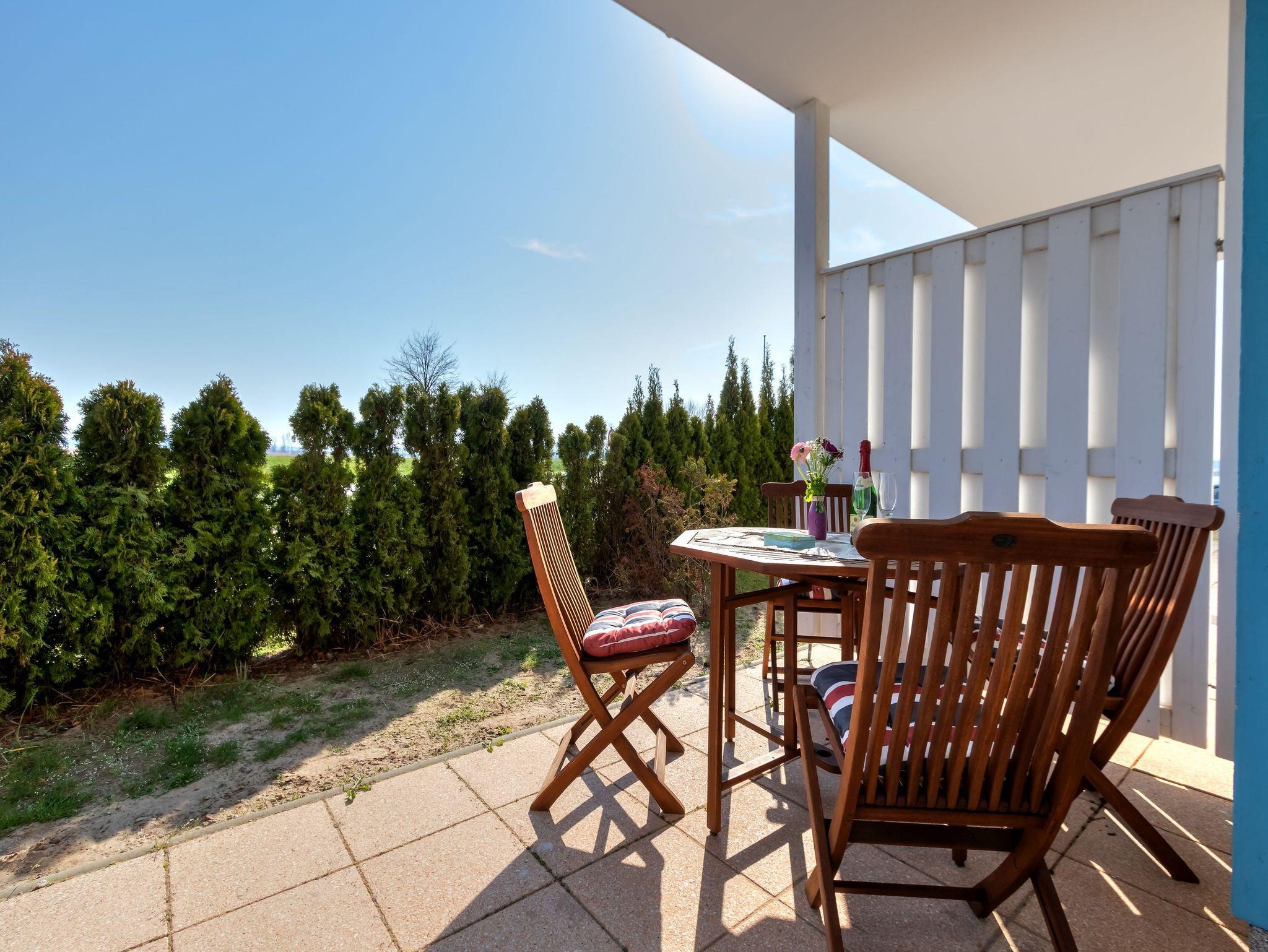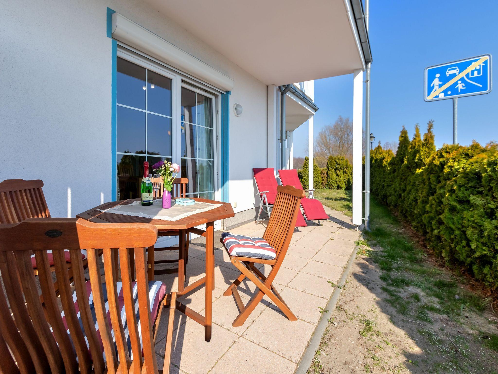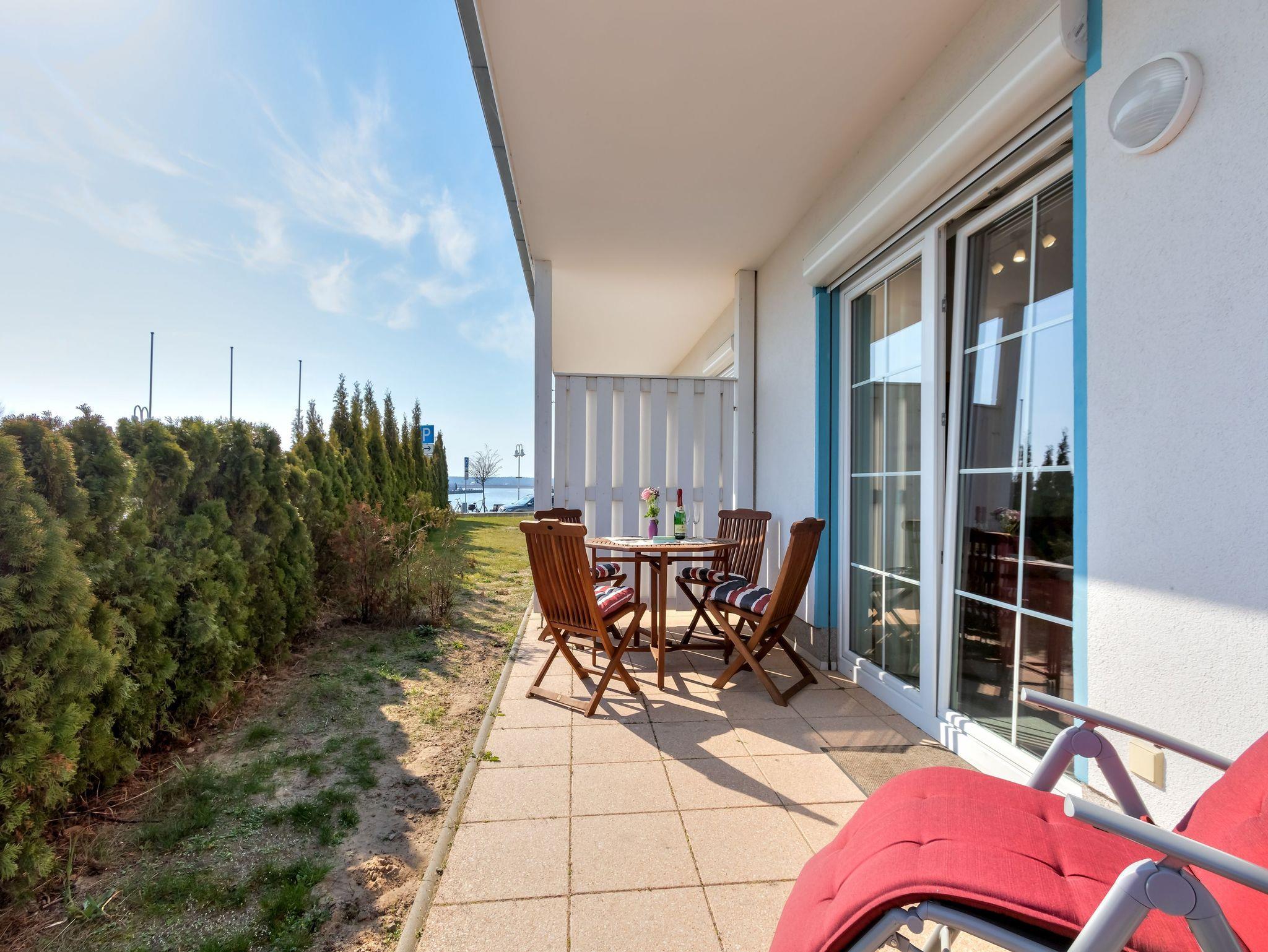 Die Wohnung befindet sich im Erdgeschoss und verfügt über eine große, nach Süden ausgerichtete, Terrasse. Genießen Sie den einzigartigen Blick vom Außenbereich auf das Treiben und die Segelboote im Yachthafen des Ostseebades Karlshagen, wie auch auf die ausgedehnten Peenewiesen.