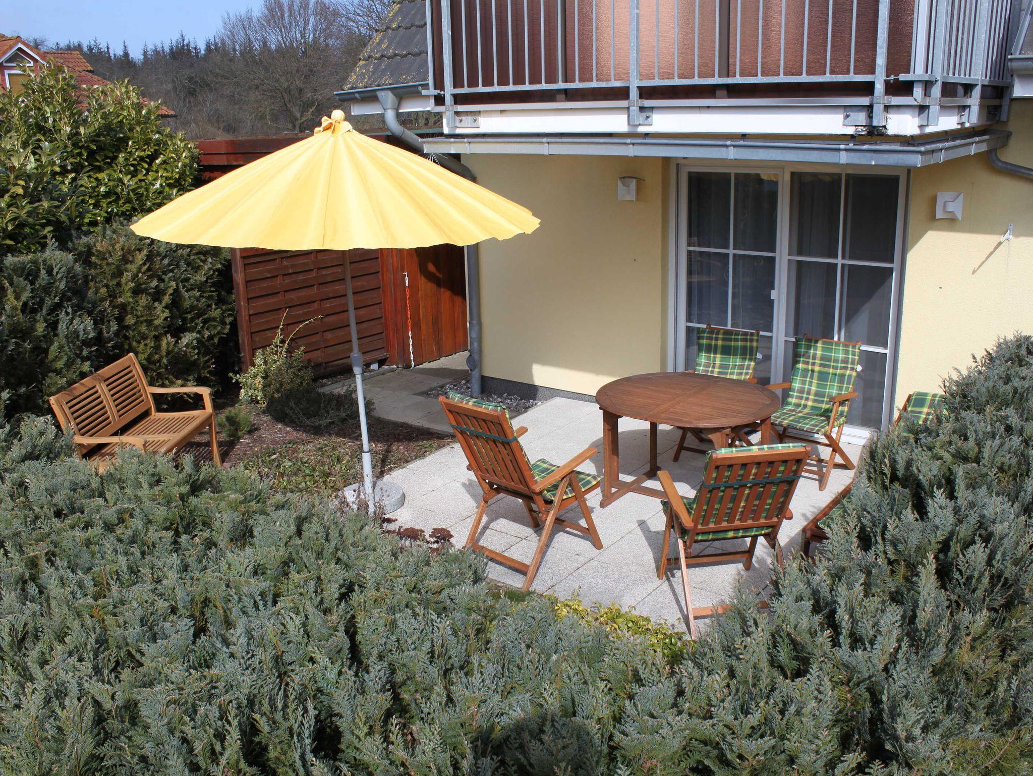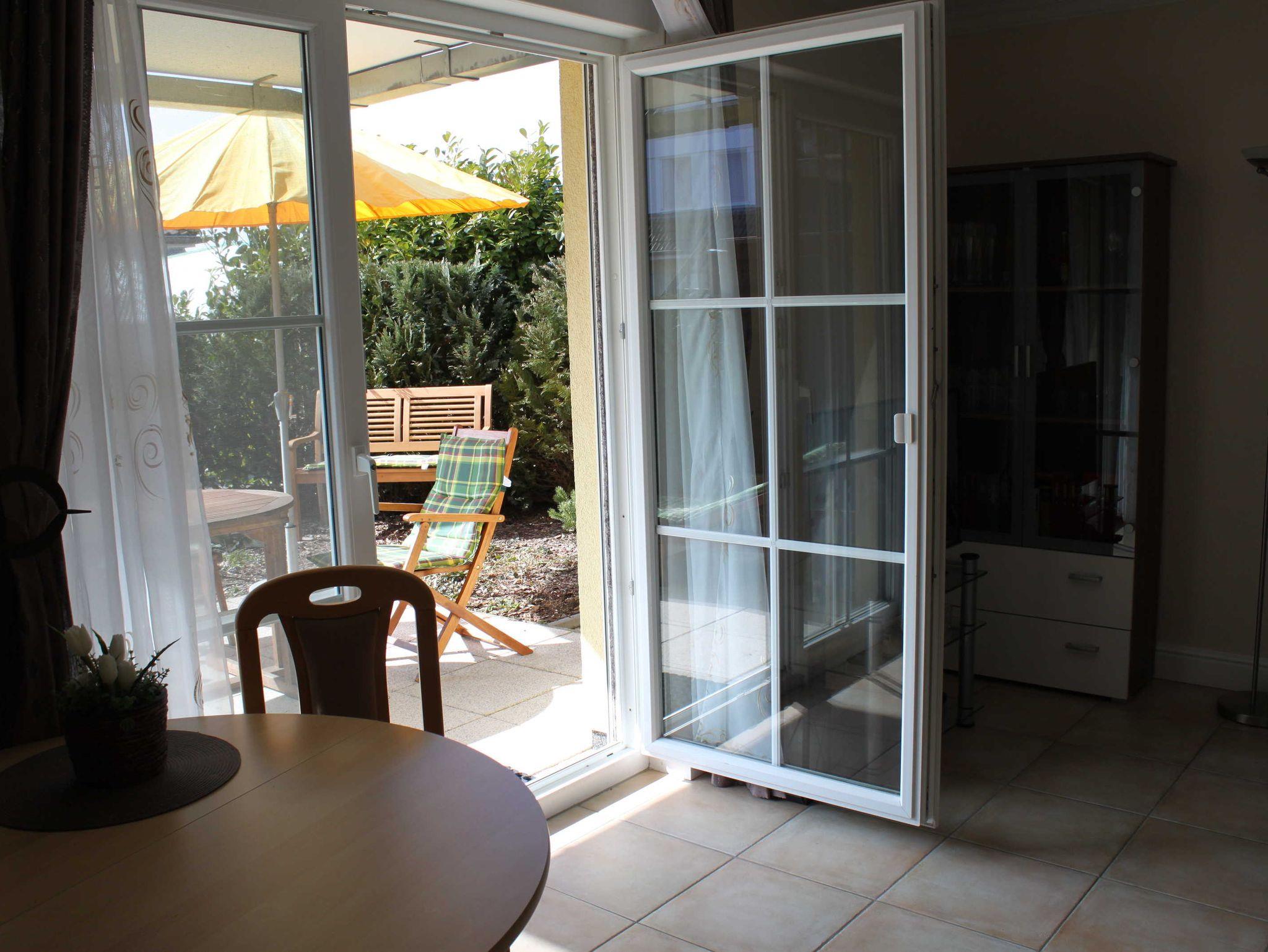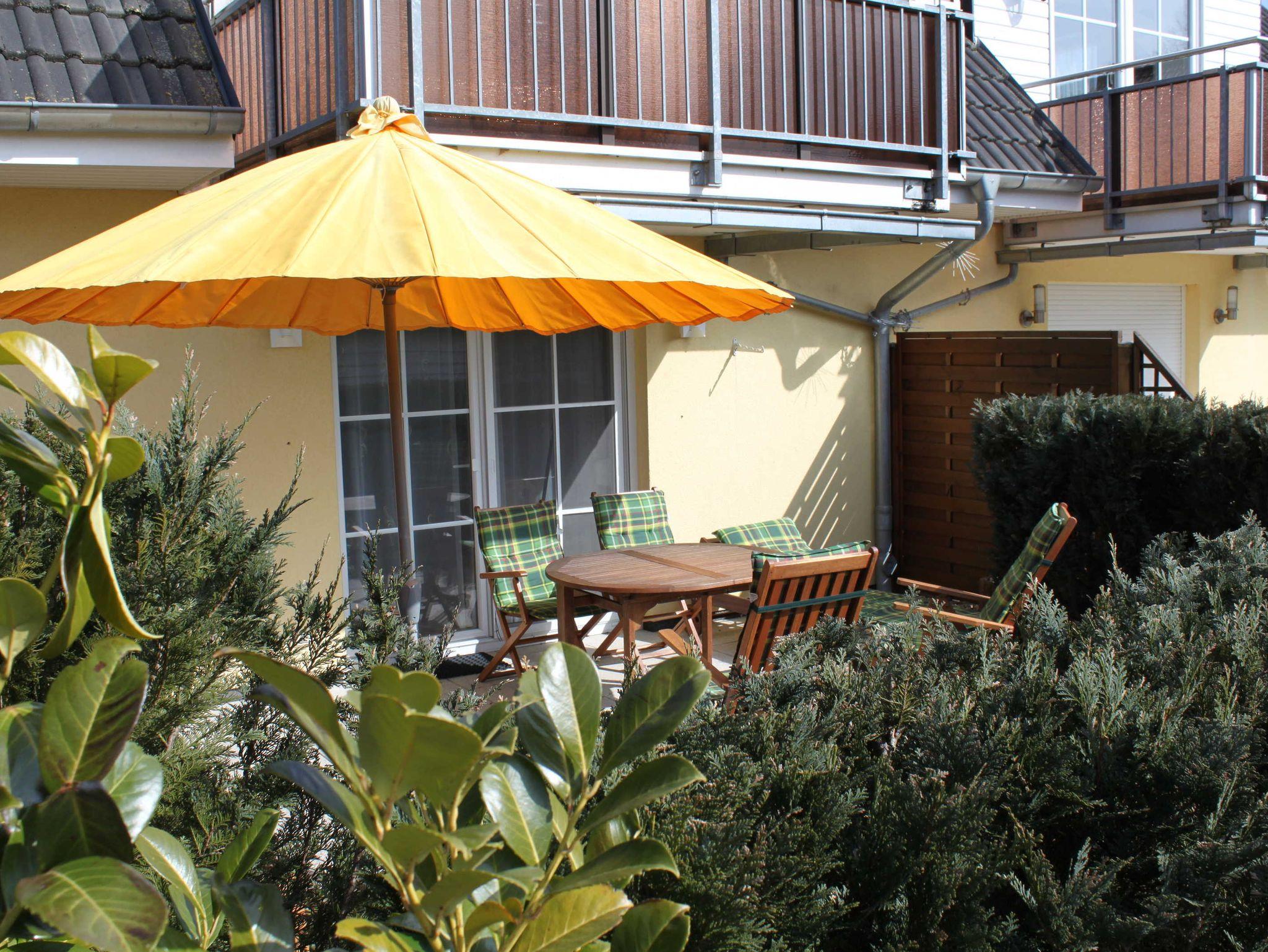 Gemütliche Ferienwohnung Sanddorn in Karlshagen mit Terrasse und Gartenmöbeln, ideal für Familien und Radfahrer.