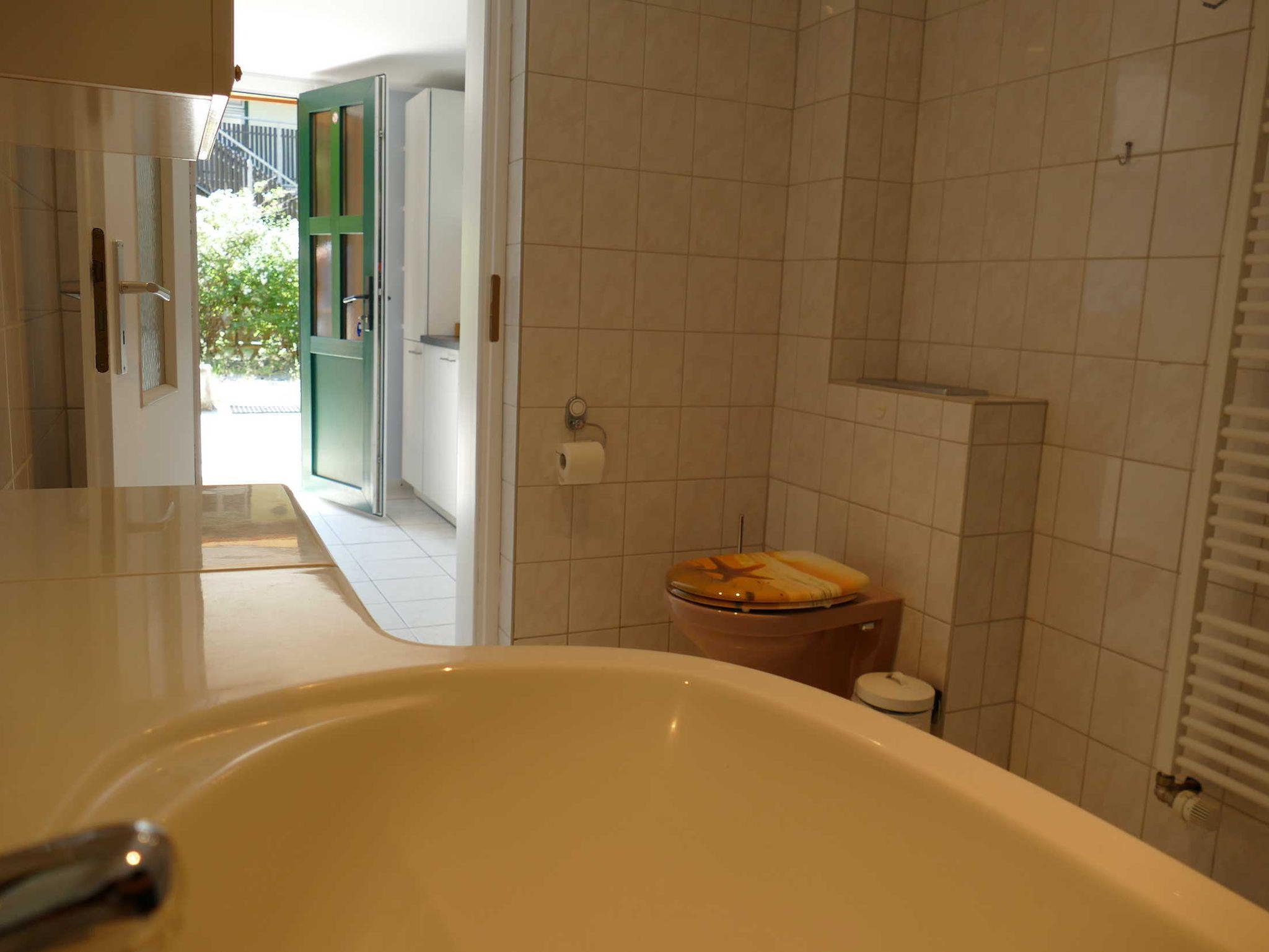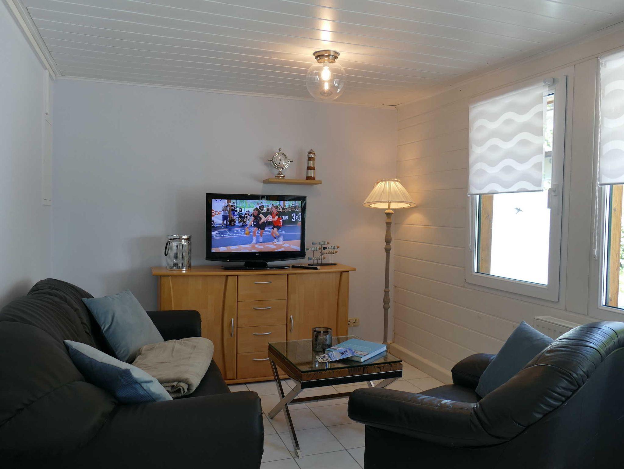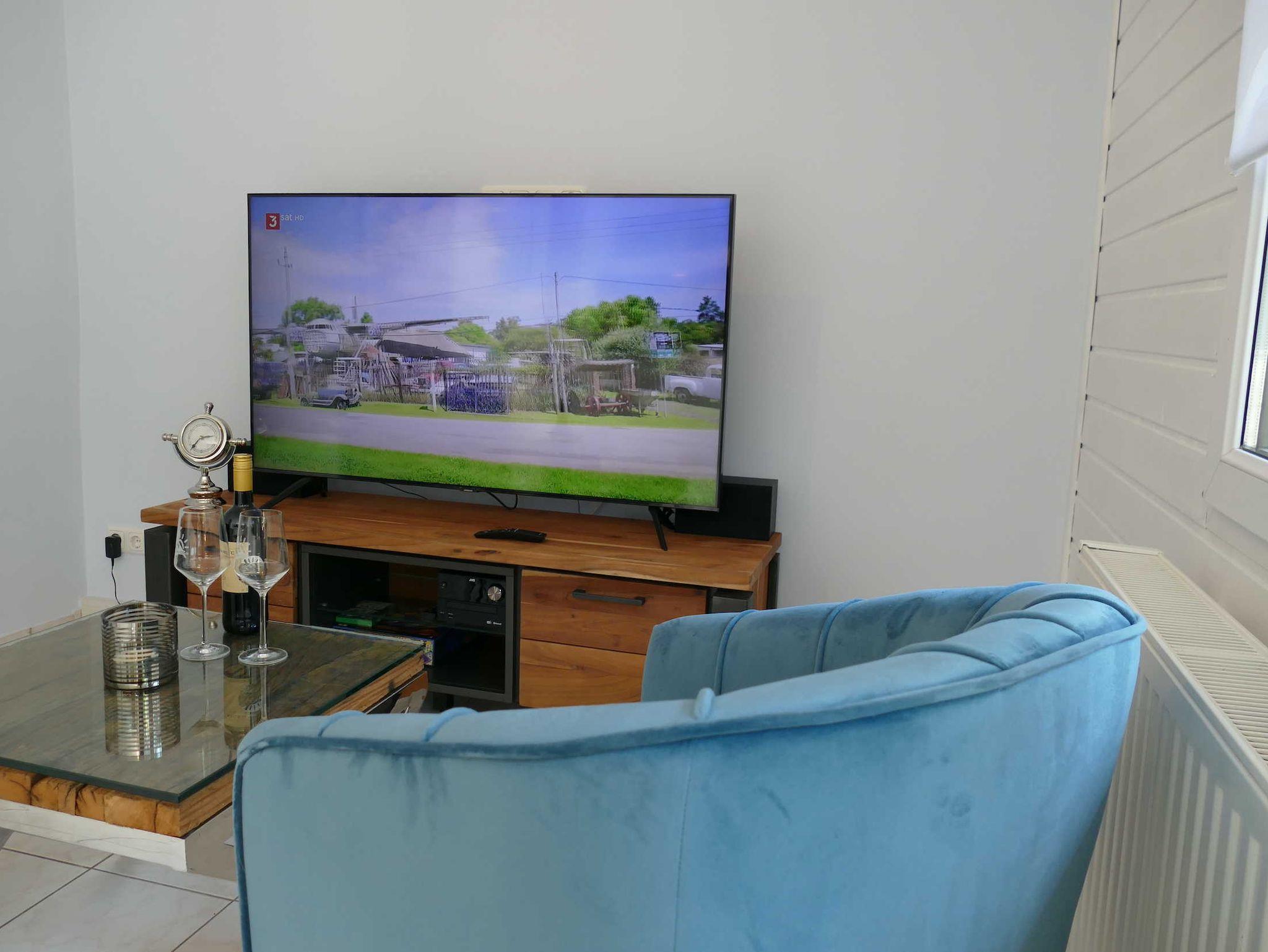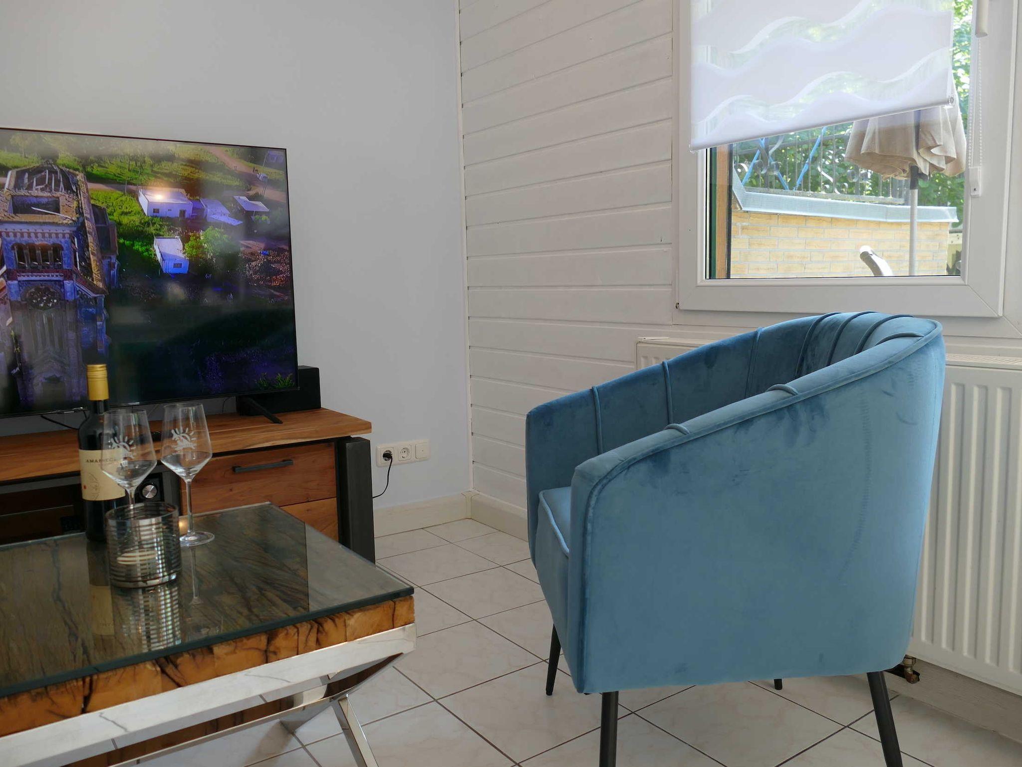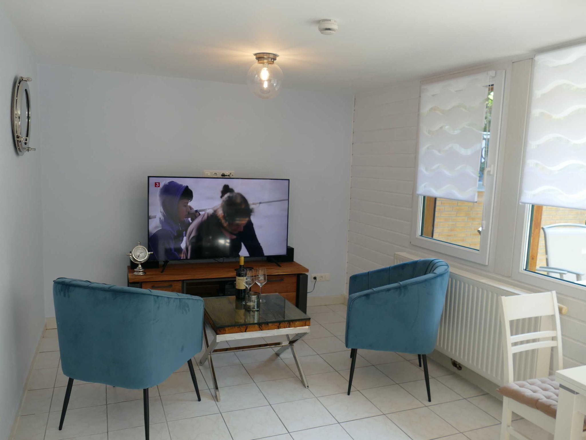 Der Wohnbereich mit seiner bequemen Sitzmöbeln und dem Fernseh- und Musikbereich bietet ausreichend Platz für die Abendgestaltung. Von hier aus geht es auch hinaus, auf die wohnungseigene Terrasse. Der Essbereich bietet ausreichend Platz. Die Küchenzeile ist mit Herd und vielem mehr versehen. Das Schlafzimmer ist mit einem Doppelbett (2mal 90/200) und einem Kleiderschrank ausgestattet. Im Bad befinden sich Dusche, ein Waschtisch und ein WC.