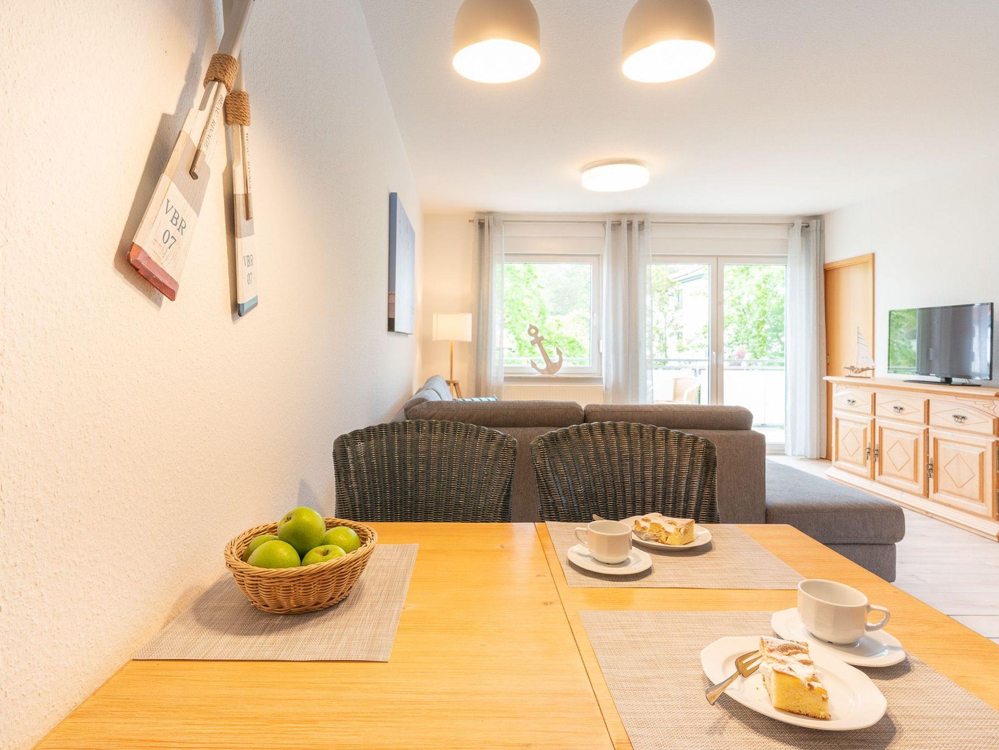 Das Wohnzimmer besitzt eine gemütliche Sitzecke und einen Fernseher, hier können Sie gemeinsam die Zeit in Ihrer Ferienwohnung ausnutzen. Die komplett eingerichtete Küchenzeile ermöglicht es Ihnen Ihre Kochkünste frei zu entfalten. Das Schafzimmer ist mit einem Doppelbett ausgestattet. In dem Bad befinden sich Dusche sowie WC. Auf dem Balkon können Sie bequem Ihren Tag ein- und ausklingen lassen. WLAN ist vorhanden. Waschmaschine und Trockner können Sie gegen Entgelt verwenden. Natürlich gibt es auch einen PKW-Parkplatz auf dem Grundstück. Zum feinsandigen, weißen Badestrand sind es nur ca. 3-4 Gehminuten.
