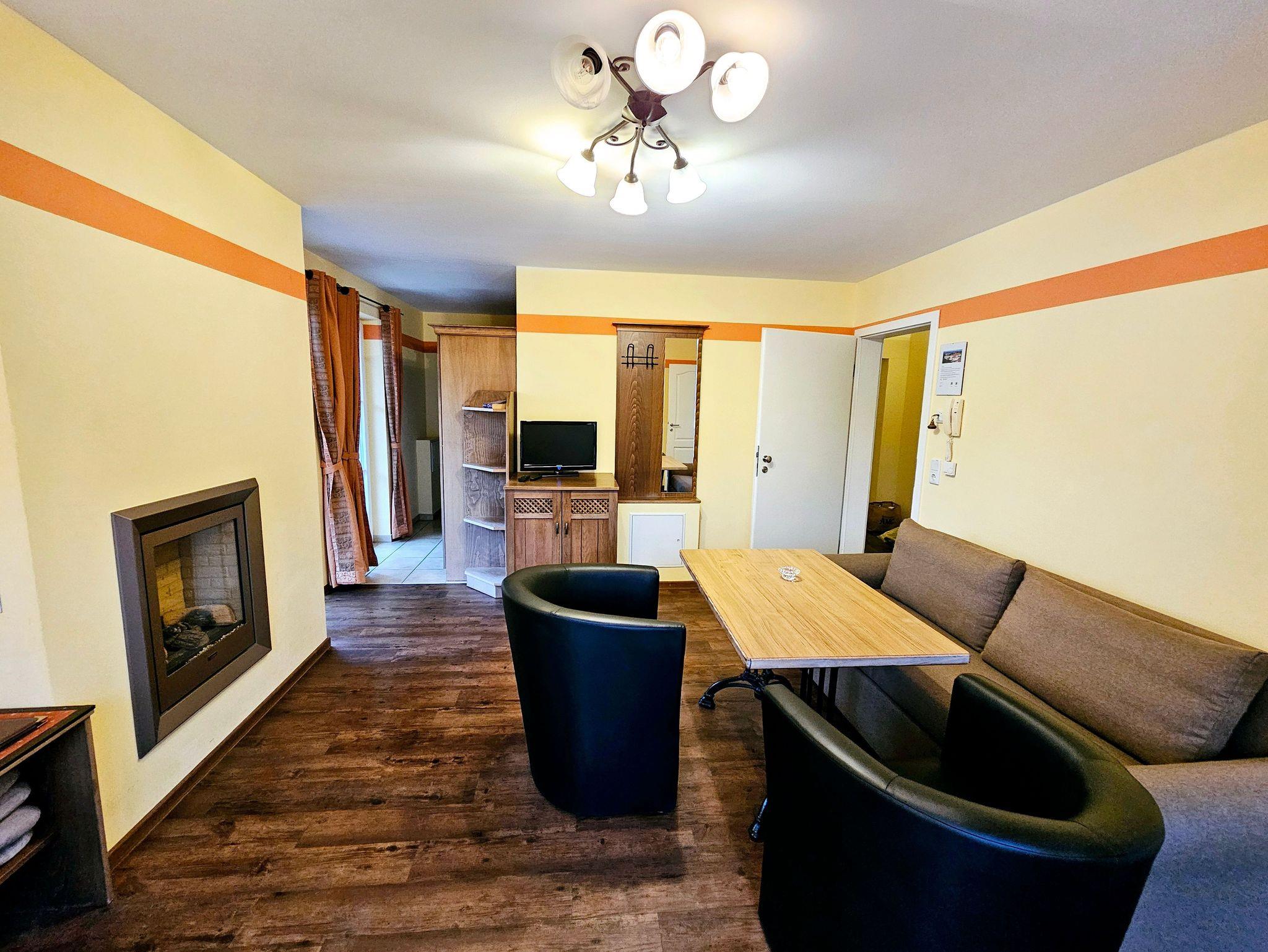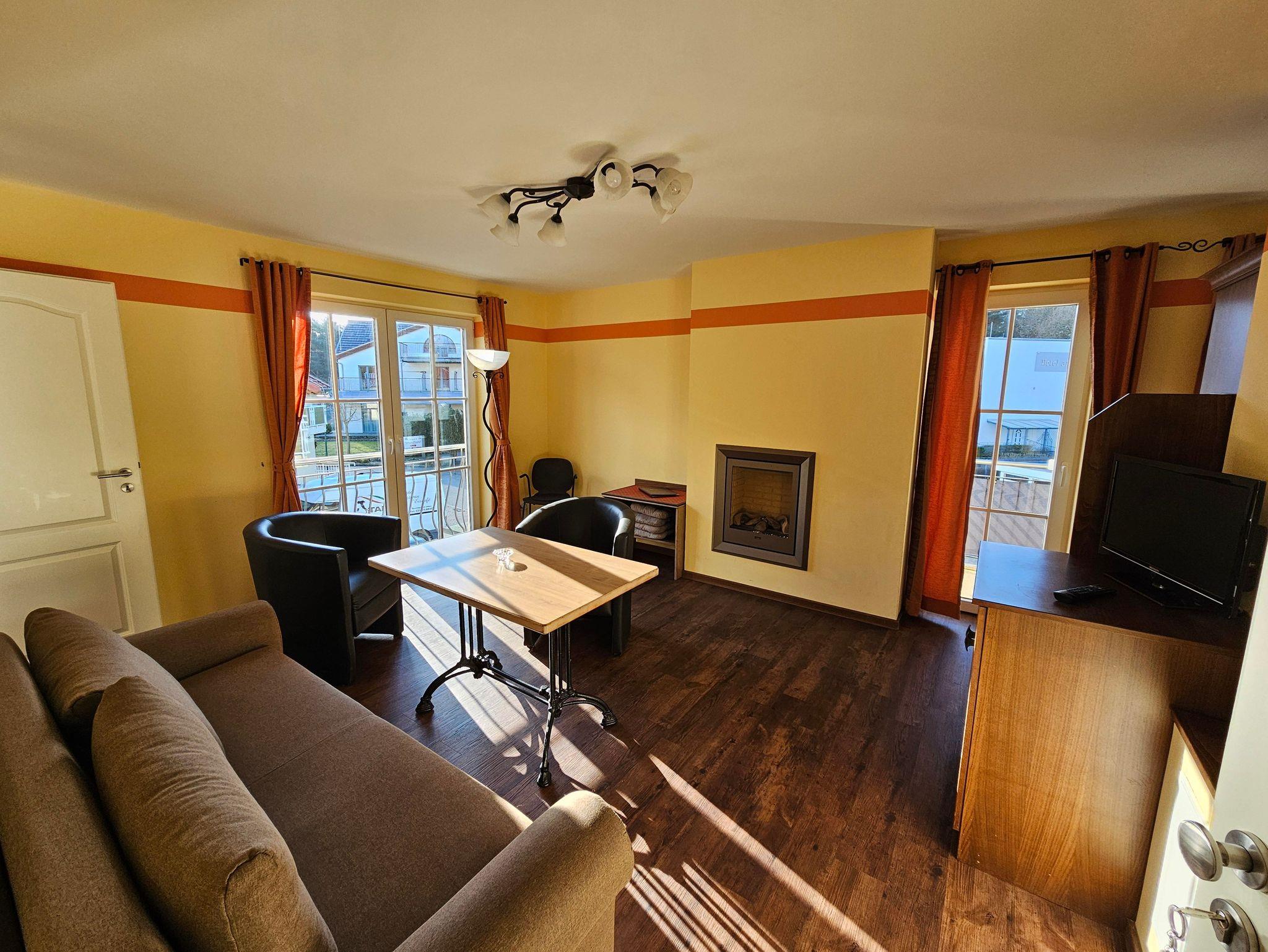 Das attraktive Ferienappartement im 1.OG besteht aus einem Schlaf- und einem Wohnraum mit Kamin und Balkon. Die Küche ist ausgestattet mit Geschirrspüler, Herd mit Ceranfeld, Mikrowelle mit Grill- und Backfunktion, Kühlschrank, Toaster und Kaffeemaschine. Im Wohnraum befindet sich ein Mediencenter mit SAT-TV, Radio und DVD-Spieler. Sie können die Mahlzeiten entweder im Restaurant im EG oder auf dem eigenen Balkon genießen. Neben dem Doppelbett im Schlafzimmer kann die Schlafcouch im Wohnzimmer zur Aufbettung genutzt werden. Der Boden ist mit Fußbodenheizung ausgestattet und mit Design-Vinyl Bodenbelag oder Fliesen belegt. Vom Schlafzimmer kann man teilweise die Ostsee sehen.