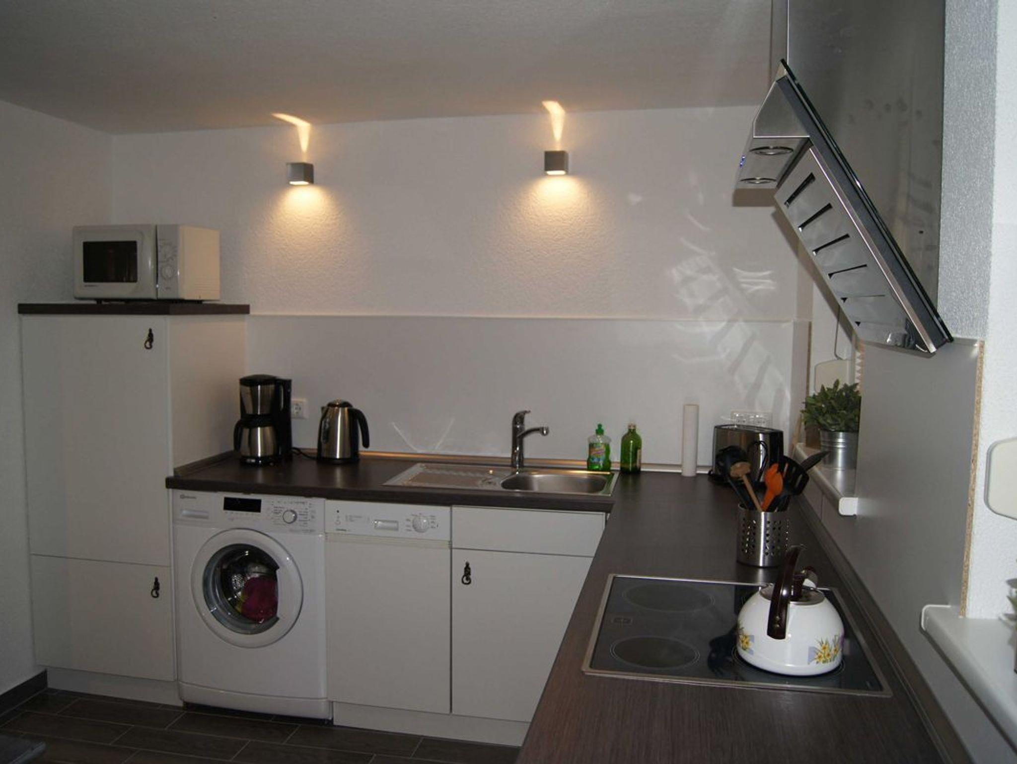 ? Offene Küche mit Geschirrspüler, Waschmaschine, Microwelle, Kühlschrank mit Gefrierfach, Herd mit Backofen und Ceranfeld, Kaffeemaschine, Wasserkocher und Toaster, Kinderhochstuhl