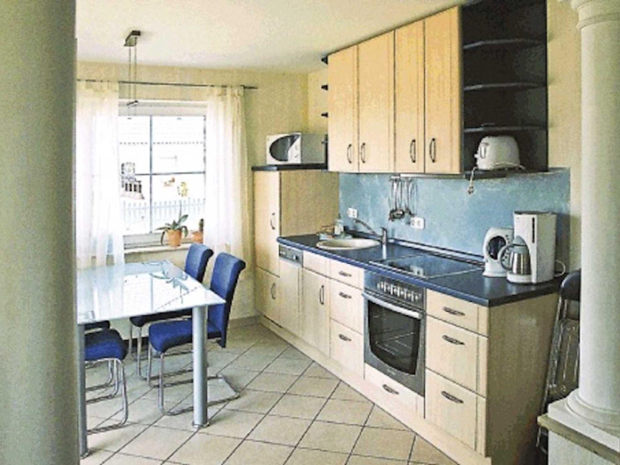 Vom Wohnungseingang kommen Sie durch den Flur direkt in die jeweiligen Zimmer. Im Wohnzimmer, mit einer bequemen Couch sowie Fernseher und Stereoanlage, einem Kaminofen. Seine große Fensterfront zeigt nach Westen und so lädt die Terrasse Sie direkt ein, den Sonnenuntergang zu geniessen. Direkt an den Wohnbereich gliedert sich die voll ausgestattete Küche mit Backofen & Herd, Kühlschrank, Mikrowelle, Spülmaschine und einem Essplatz mit sechs Plätzen an.