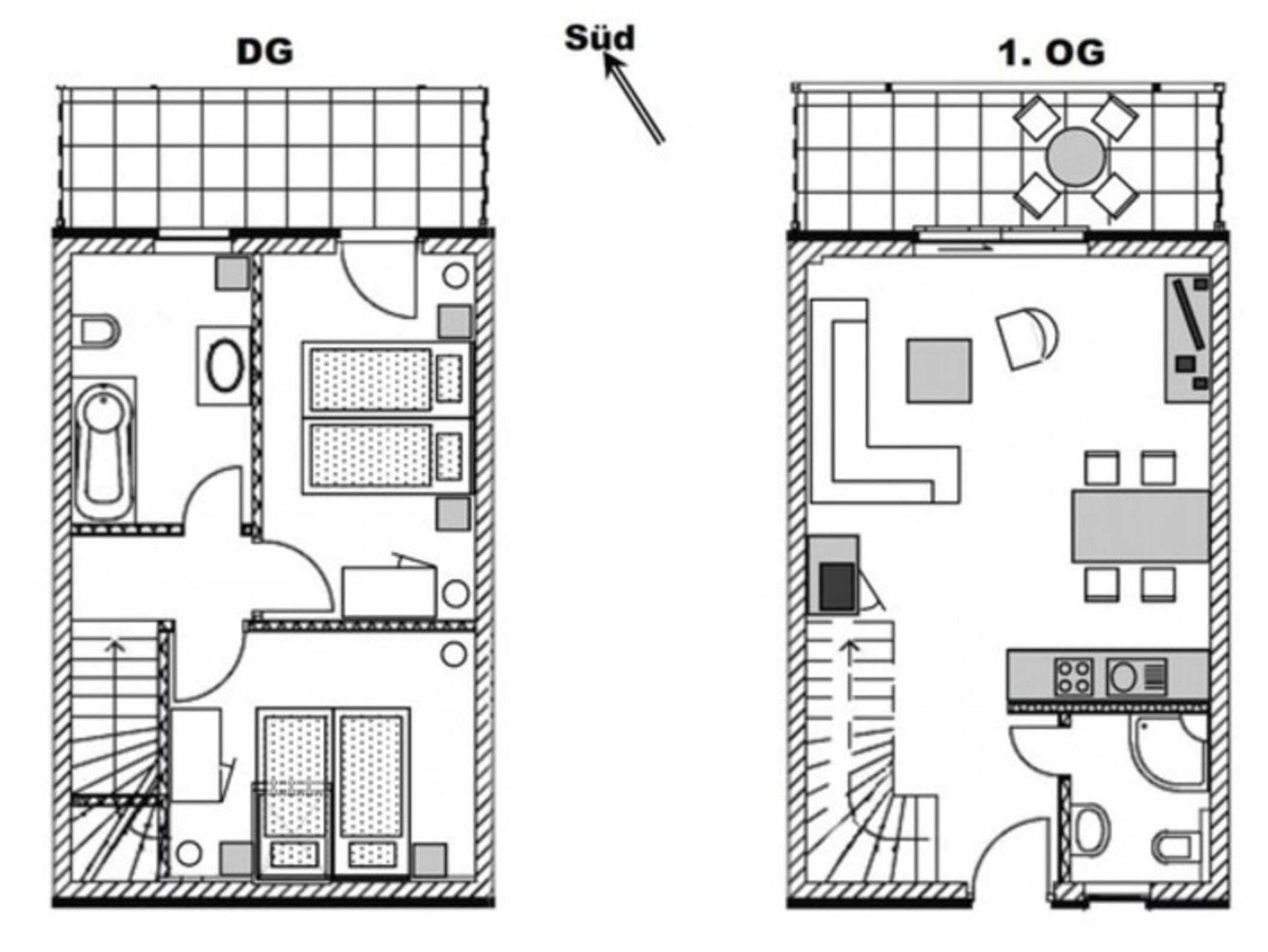 -2 Balkone mit Sitzmöbeln und Tisch
