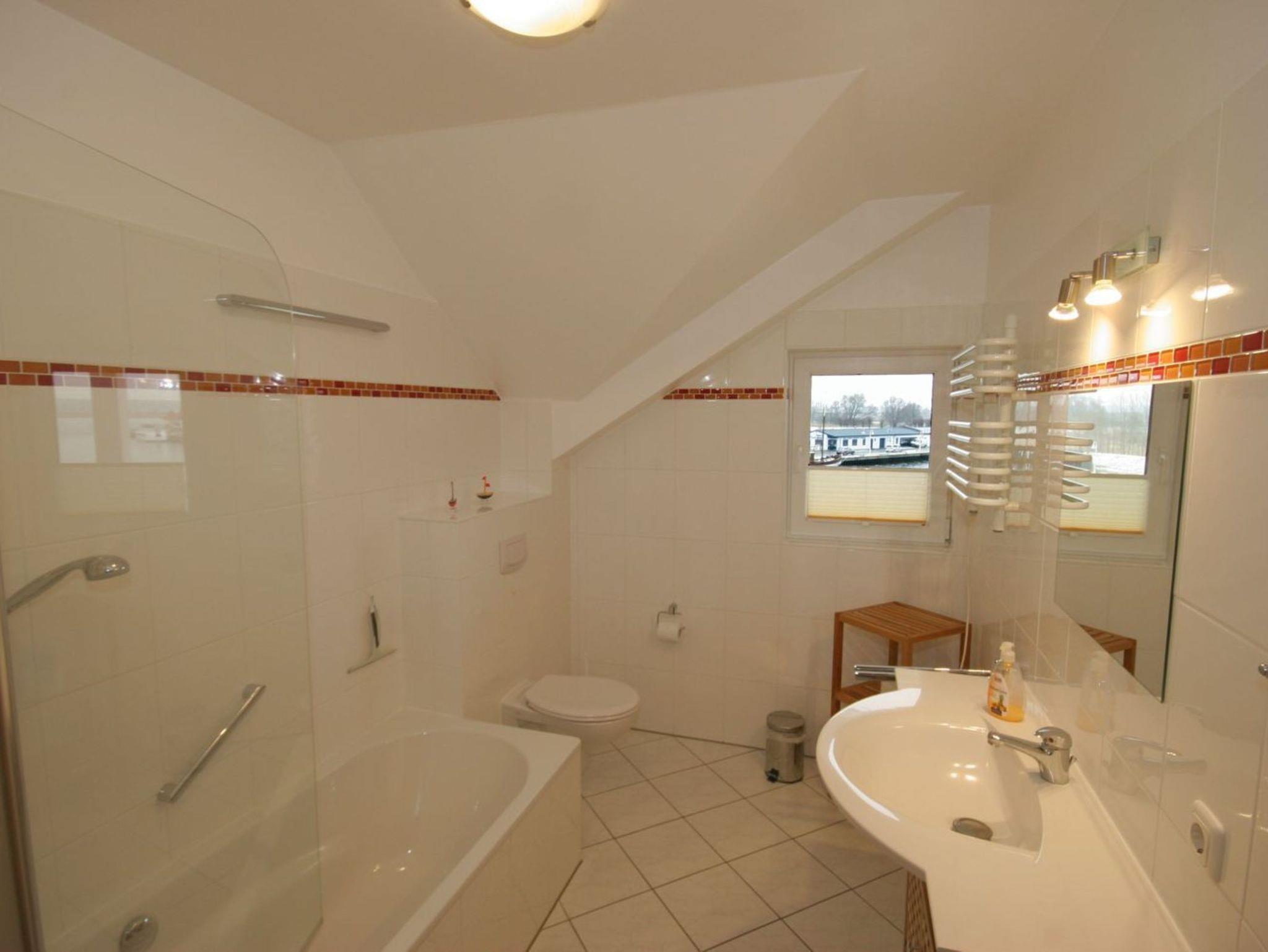 3-Raum-Maisonette-Wohnung mit 2 Schlafzimmern mit je einem Doppelbett. Die Wohnung verfügt über 2 Bäder - 1x mit Dusche (unterer Bereich) und 1 x mit Badewanne (oberer Bereich). Weiterhin findet der Gast 2 Balkone mit herrlichem Panorama- und Wasserblick über das gesamte Hafenbecken, Peenestrom und Peenewiesen. Die Fenster der Wohnung sind mit Insektenschutz versehen. Gäste können den vorhandenen WLAN Anschluss kostenlos nutzen. (Ein Anspruch besteht allerdings nicht, daher auch keine Minderung des Mietpreises, falls der Internetanschluss einmal gestört sein sollte).