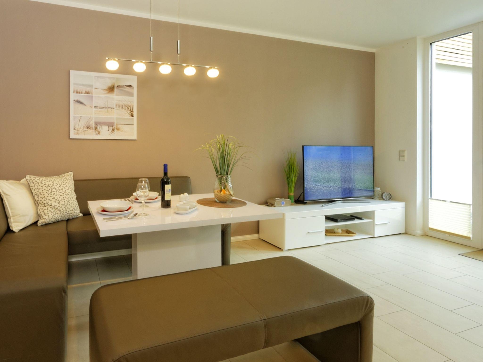 • großzügiger Wohn-/ Essbereich (ca. 30 m²) mit Esstisch für 4 Personen, gemütliche Eck-Couch, Smart-TV mit ca. 140cm Bilddiagonale, Internet-WLAN mit bis zu 20000 kbits/s