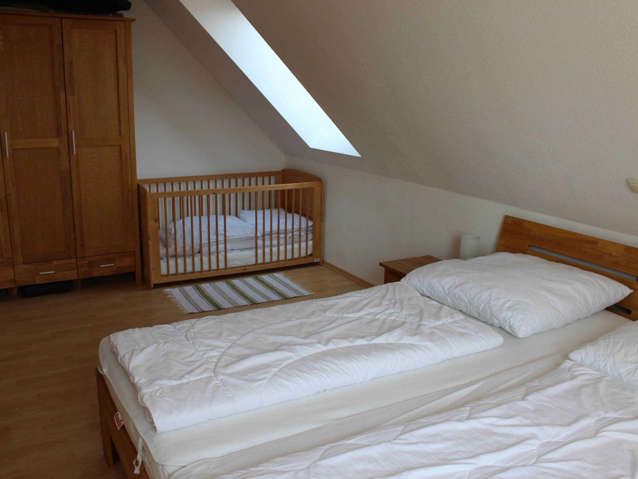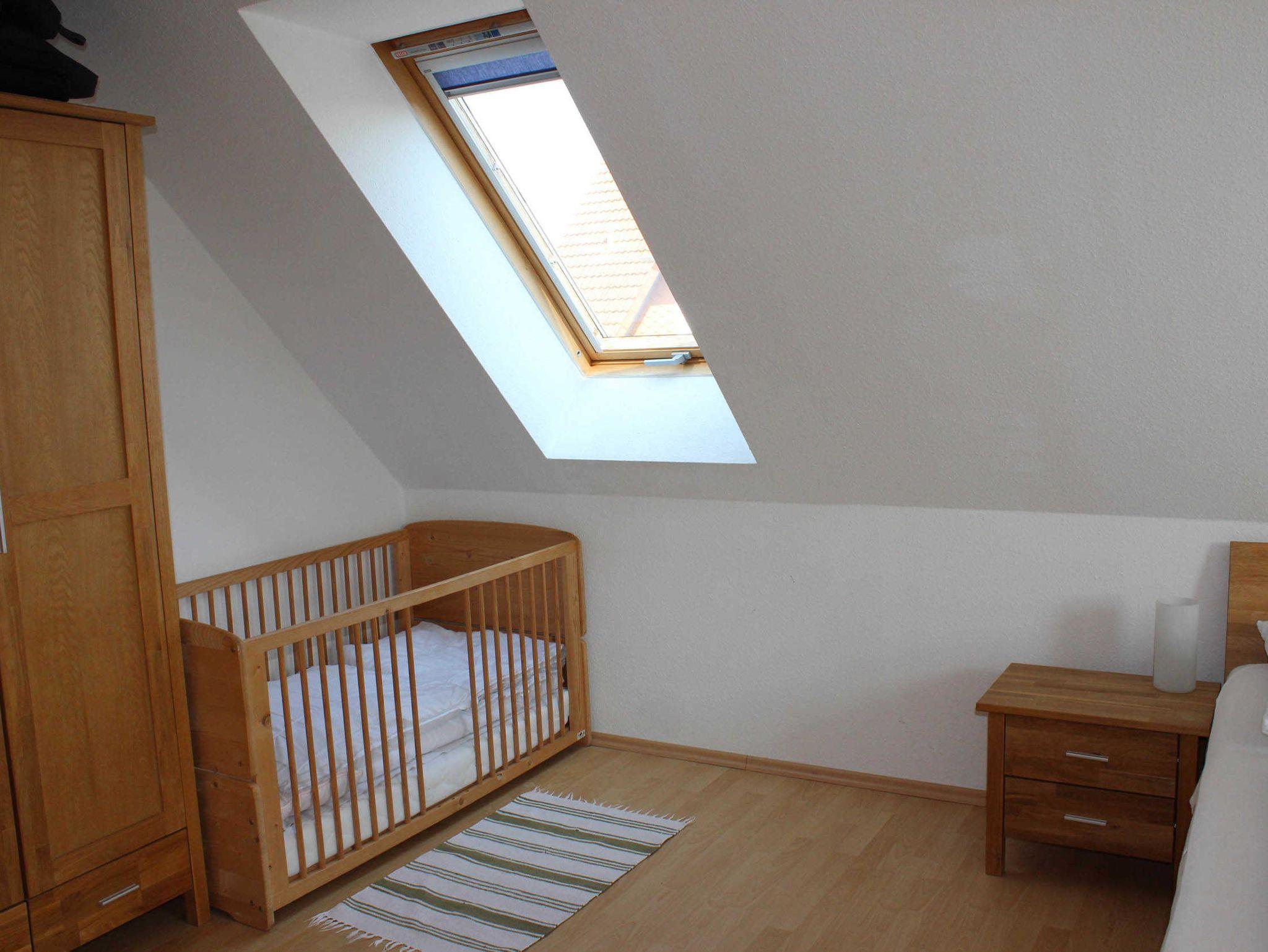 Im Schlafzimmer ist Platz für mindestens 1 Baby, das noch im Babybett schläft. Ein Hochstuhl und ein Kinderbett sind vorhanden.