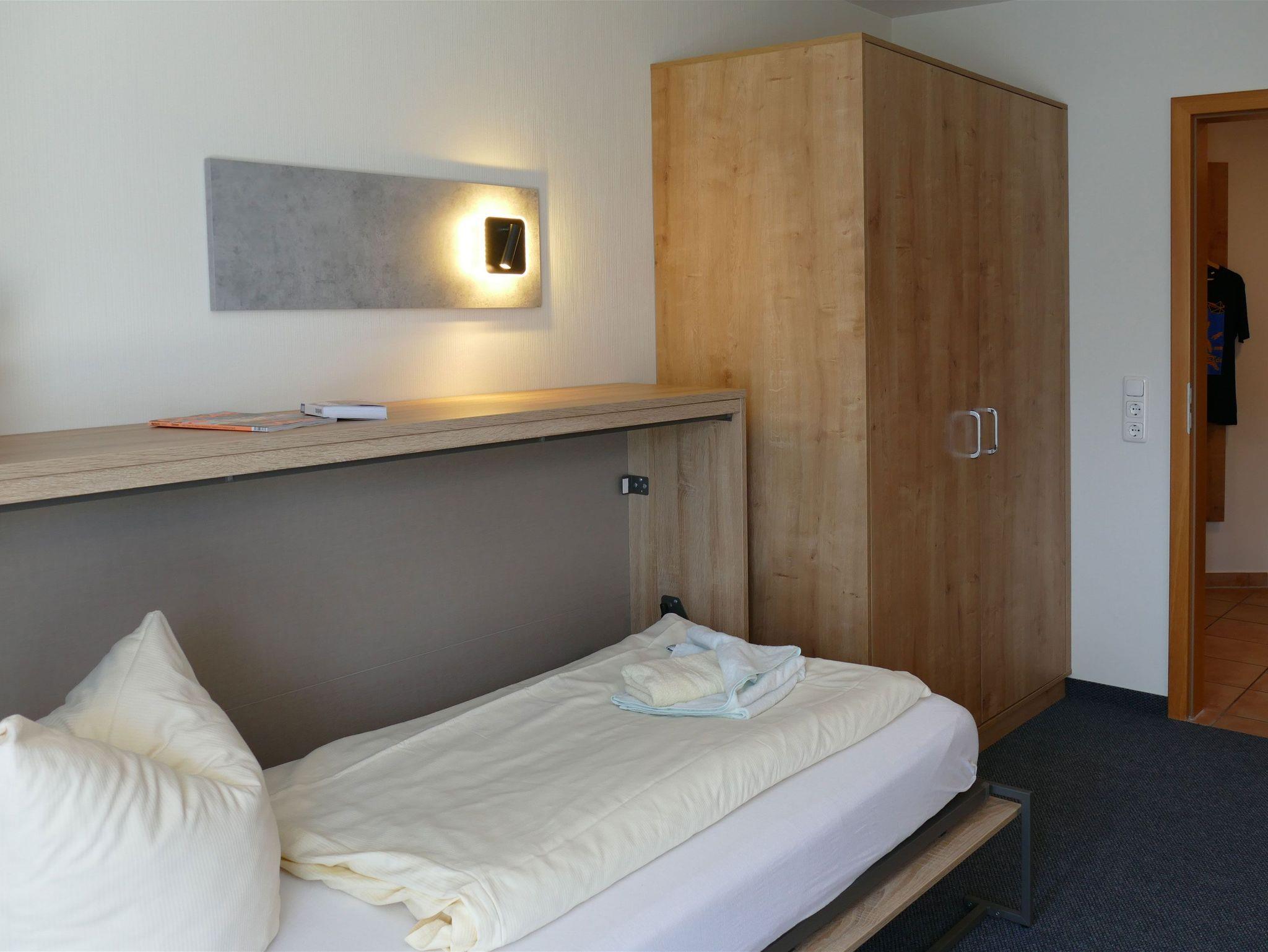 Im Flurbereich steht Ihnen ein kompakter Küchenblock mit Kühlschrank, Kaffeemaschine, Wasserkocher und Geschirr zur Verfügung ideal, um sich zwischendurch kleine Mahlzeiten selbst zuzubereiten. Eine Garderobe sowie zusätzliche Ablagemöglichkeiten sorgen für Ordnung und Bequemlichkeit während Ihres Aufenthalts.
