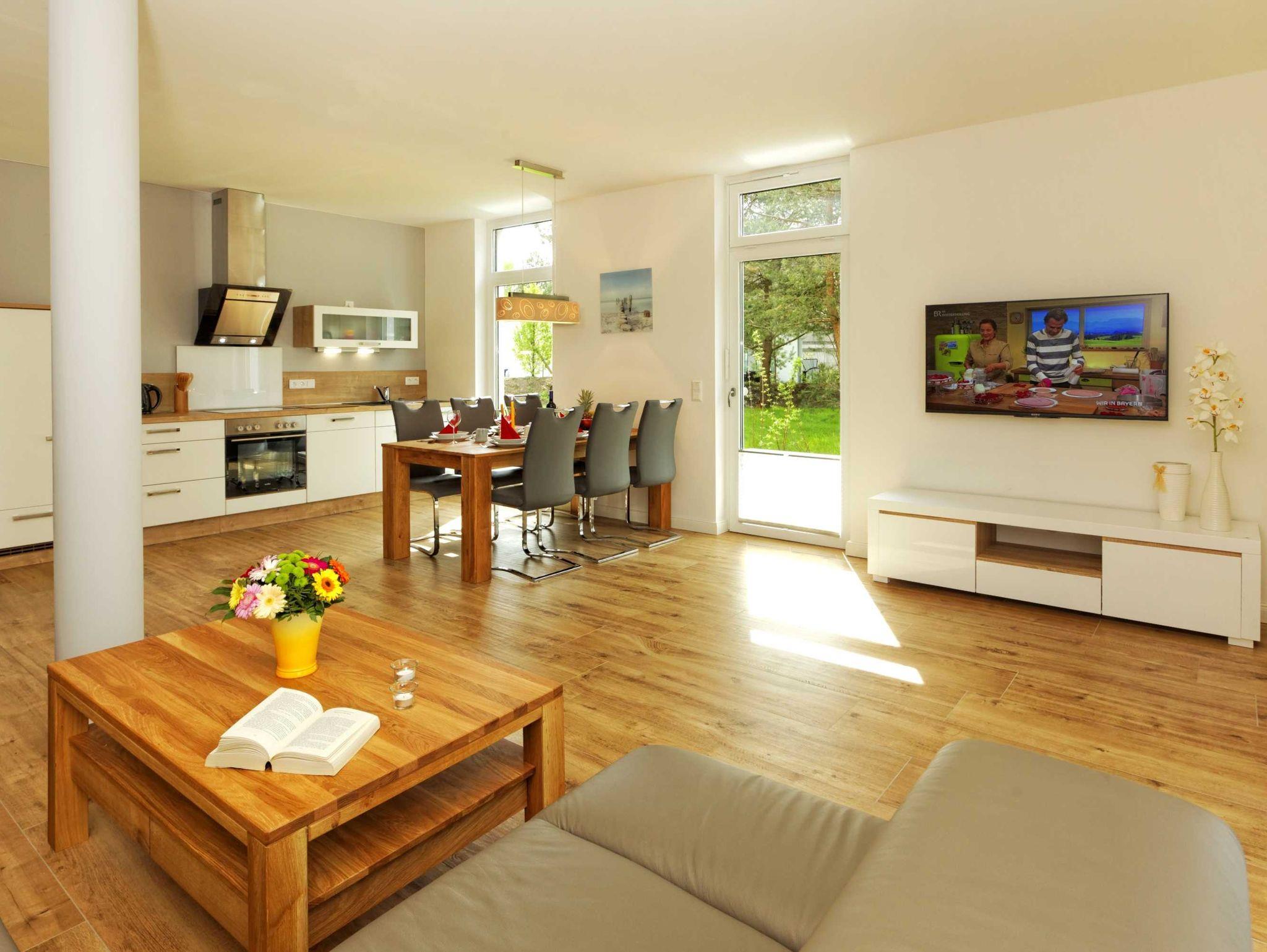 • großzügiger Wohn-/ Essbereich (ca. 36 m²) mit Esstisch für 6 Personen, gemütliche Eck-Couch, Flat-TV mit ca. 128cm Bilddiagonale, Internet-WLAN