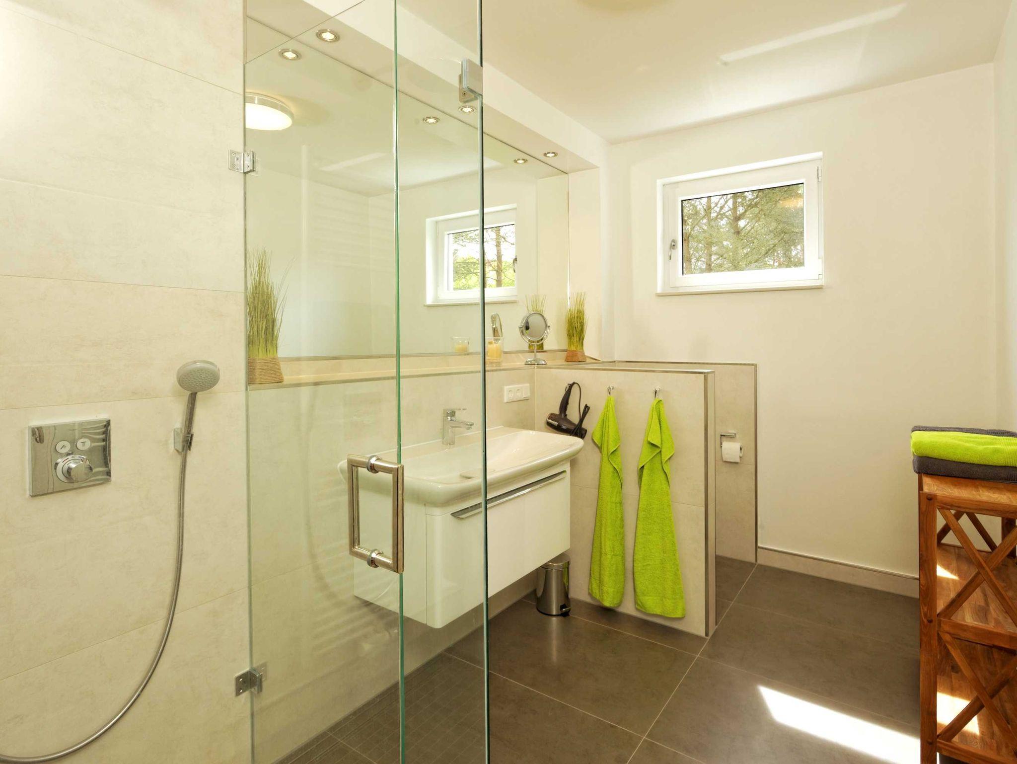 • Badezimmer mit barrierefreier Dusche, Waschbecken und WC