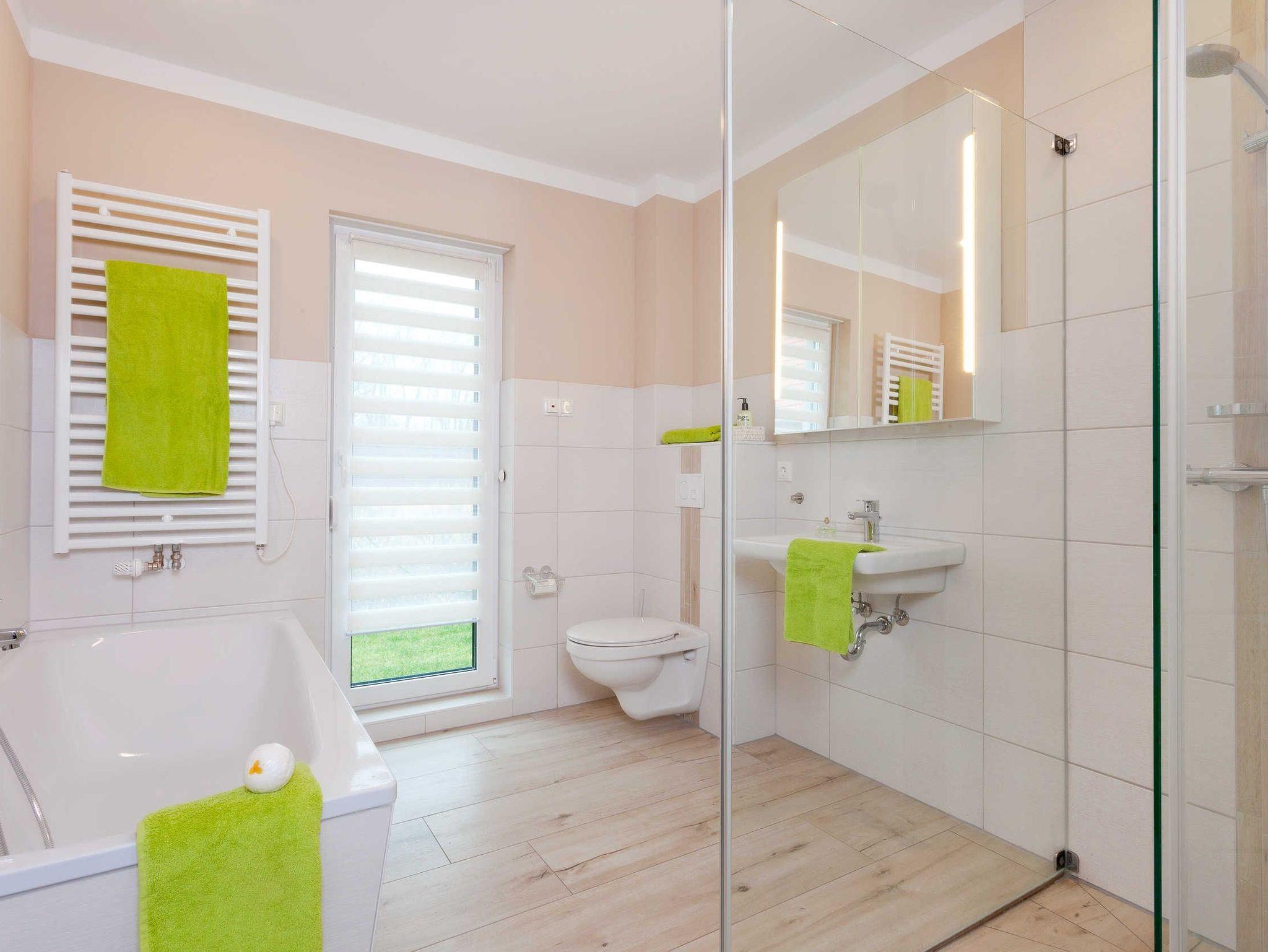 • Fußbodenheizung im ganzen Haus, alle Fenster mit Außenrollos