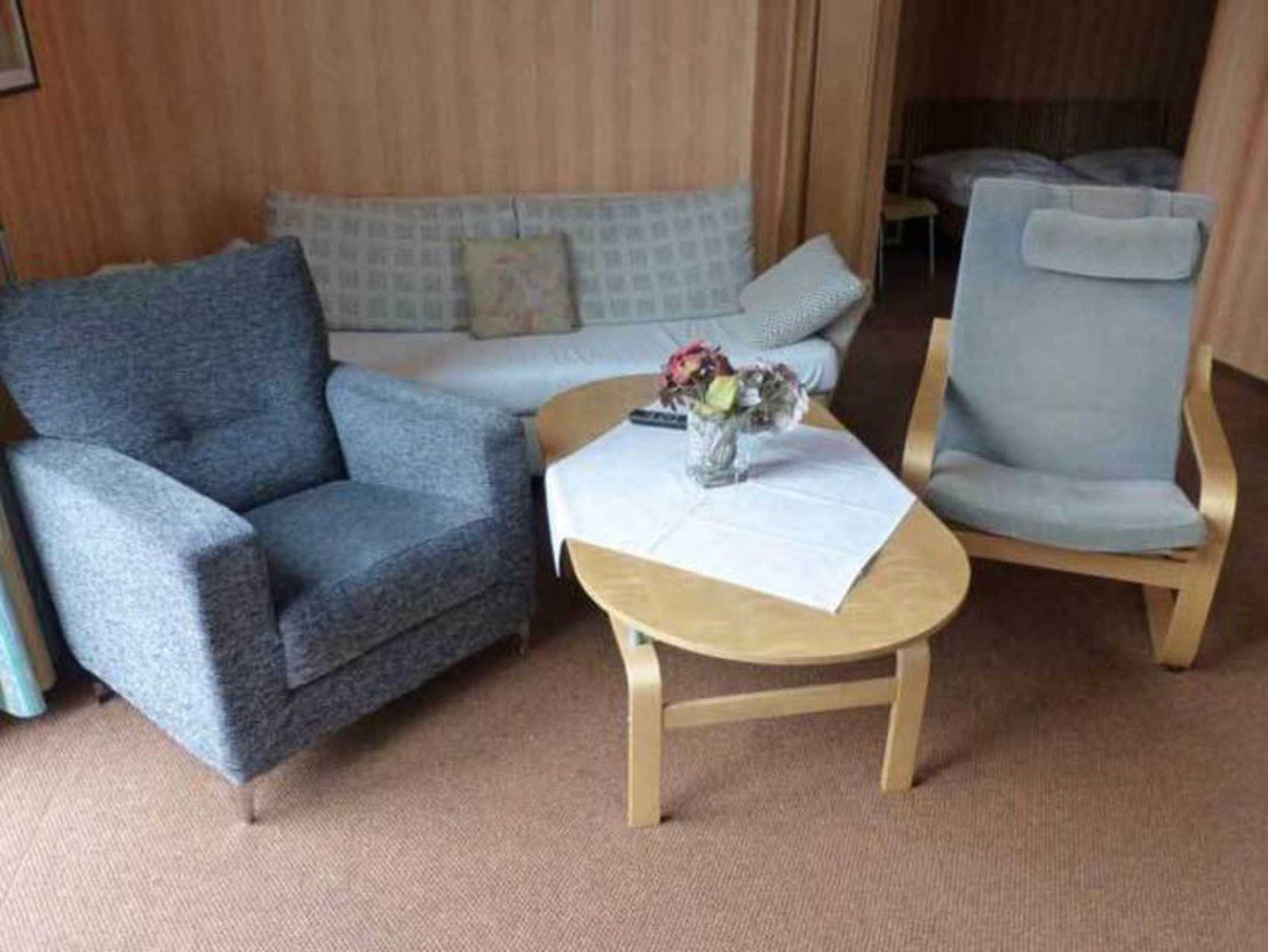 Der räumlich abgetrennte Schlafbereich ist mit einem Doppelbett (2mal 90/200), einer zusätzlichen Schlafmöglichkeit (90/200) und einem Kleiderschrank ausgestattet. Im Bad befinden sich Dusche und Badewanne, ein Waschtisch und ein WC.