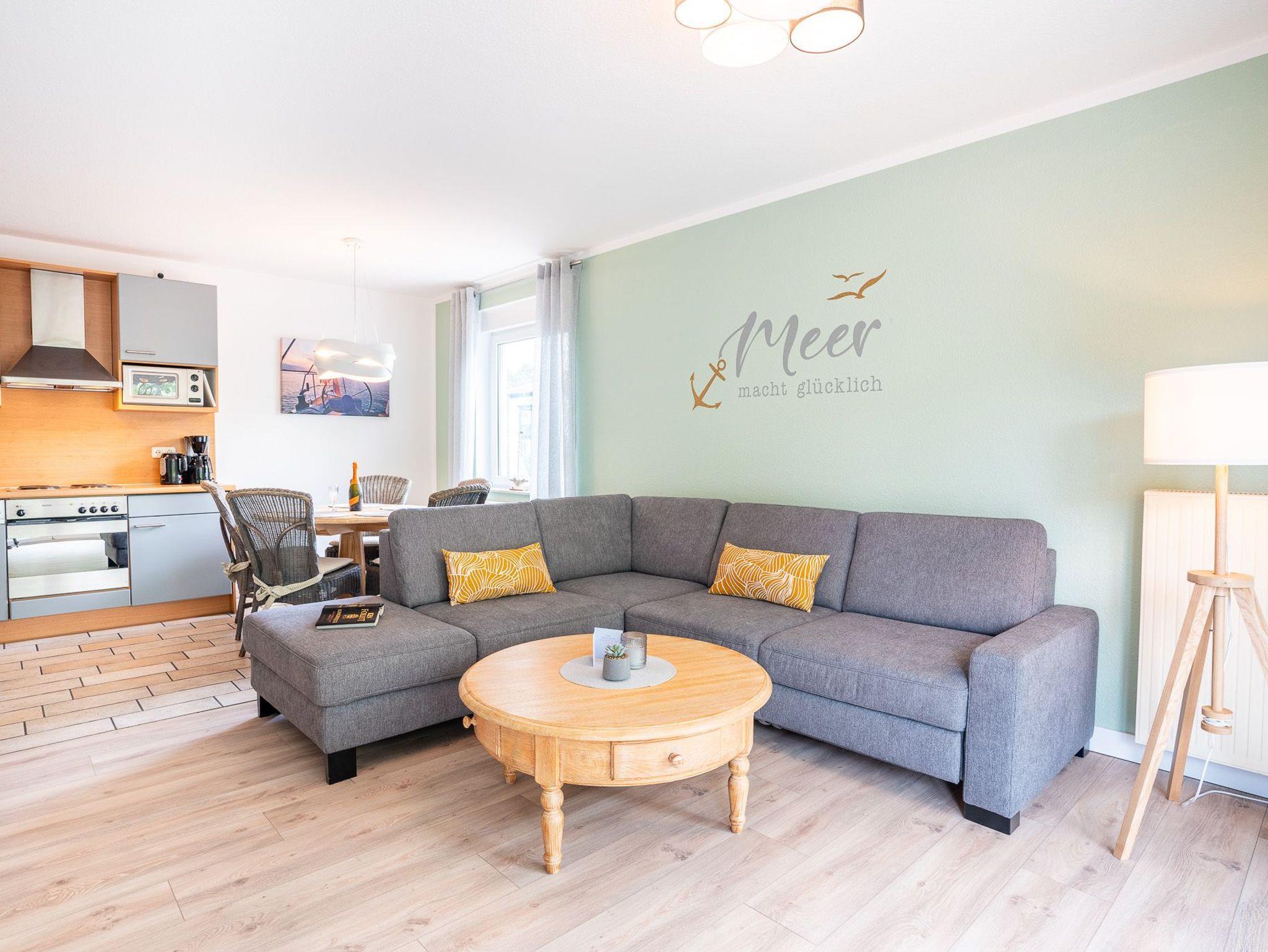 Der behagliche Wohnraum mit einer gemütlichen Sitzecke und einem Fernseher, sowie die komplett eingerichtete, offene Küche bieten einen guten Ort um sich gemeinsam in der Wohnung zu entspannen. Durch die zwei Schlafzimmer, gibt es jedoch auch einen ruhigen Rückzugsort um abzuschalten. Ein Schlafzimmer ist mit einem Doppelbett ausgestattet und eins mit zwei Einzelbetten. Das Badezimmer besitzt eine Dusche und ein WC. Auf dem Balkon können Sie gemütlich den Abend ein- und ausklingen lassen. WLAN ist vorhanden. Waschmaschine und Trockner können Sie gegen Entgelt verwenden. Natürlich stellen wir Ihnen ein PKW-Parkplatz vor dem Haus zur Verfügung. Zum feinsandigen, weißen Badestrand sind es nur ca. 3-4 Gehminuten.