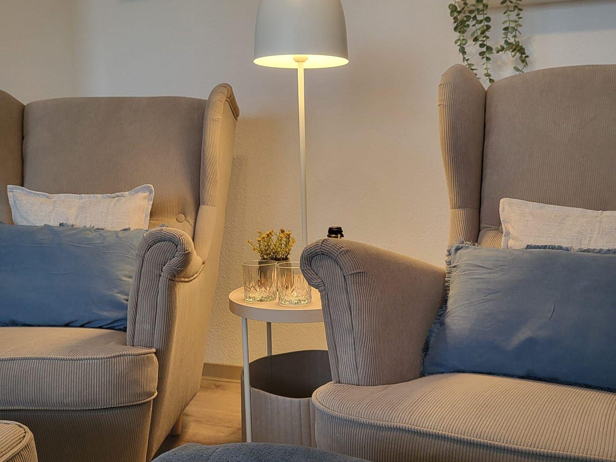 Das gemütliche Ferienhaus bietet auf 28 m² eine komfortable Unterkunft für bis zu zwei Personen. Der Wohnbereich ist ausgestattet mit einer bequemen Couch, einem TV und einer integrierten Küchenzeile. Diese verfügt über ein Ceran-Kochfeld (kein Backofen), einen Kühlschrank, eine Kaffeemaschine, einen Toaster sowie Geschirr und Besteck. Ein Essplatz für zwei Personen lädt zu gemeinsamen Mahlzeiten ein.